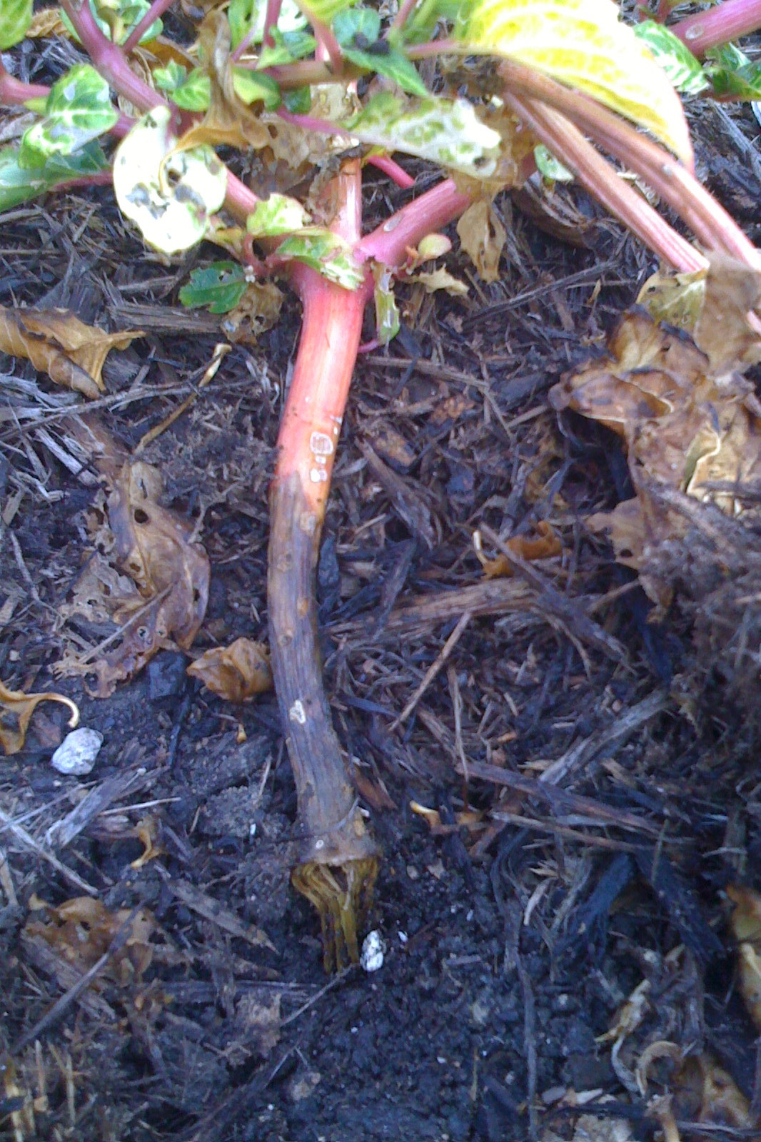 A diversity of soil-borne pathogens are present in most soils. These pathogens can successfully infect when provided the proper environmental conditions and/or a wounded host. The disease progresses up the stem from the site of infection. Succulent stems may be girdled by the disease, while woody stems and trunks have isolated, spreading cankers.