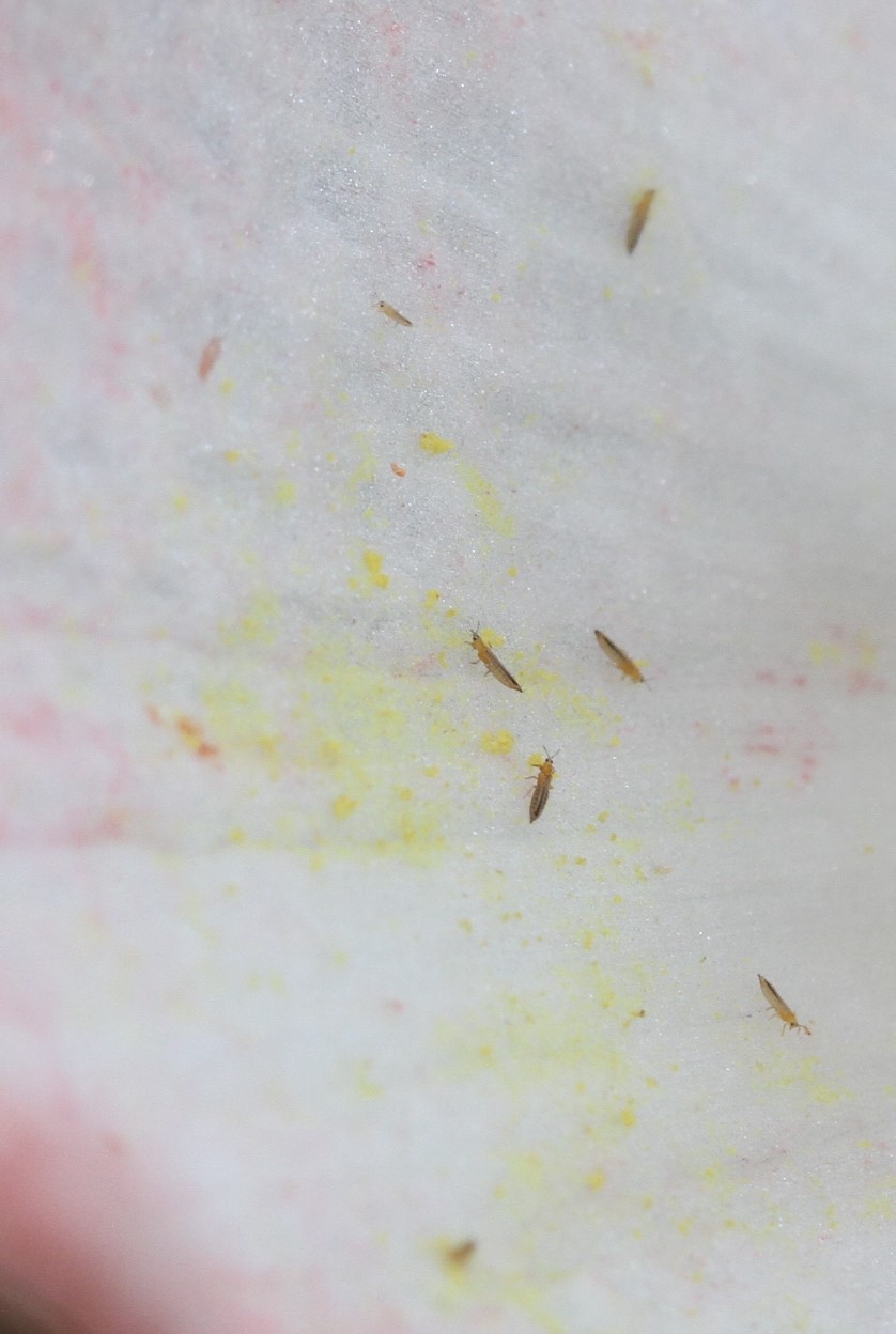 Several species of thrips attack ornamental plants. Many species (like greenhouse and western flower thrips) do not overwinter in the landscape and enter the garden as hitchhikers on infested plants grown in the greenhouse. Other species, such as daylily thrips winter in the landscape and can be a recurring problem. Many thrips are omnivores. For this reason, thrips will often hide from their hungry brothers and sisters in cracks and crevices.