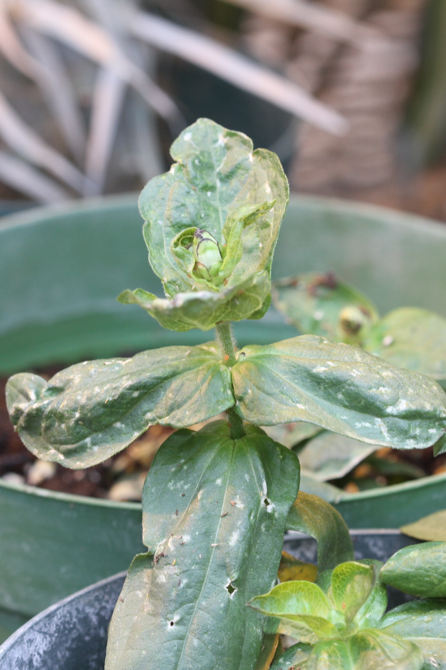 Thrips discolor the surfaces of fully developed flowers and leaves when they feed by scraping plant tissue. Feeding on expanding buds of flowers and leaves can cause them to twist and distort. When on leaves, thrips leave black fecal spots in scraped leaf portions. One species, the western flower thrips, transfers impatiens necrotic spot virus and tomato spotted wilt virus. See entries on managing these diseases.