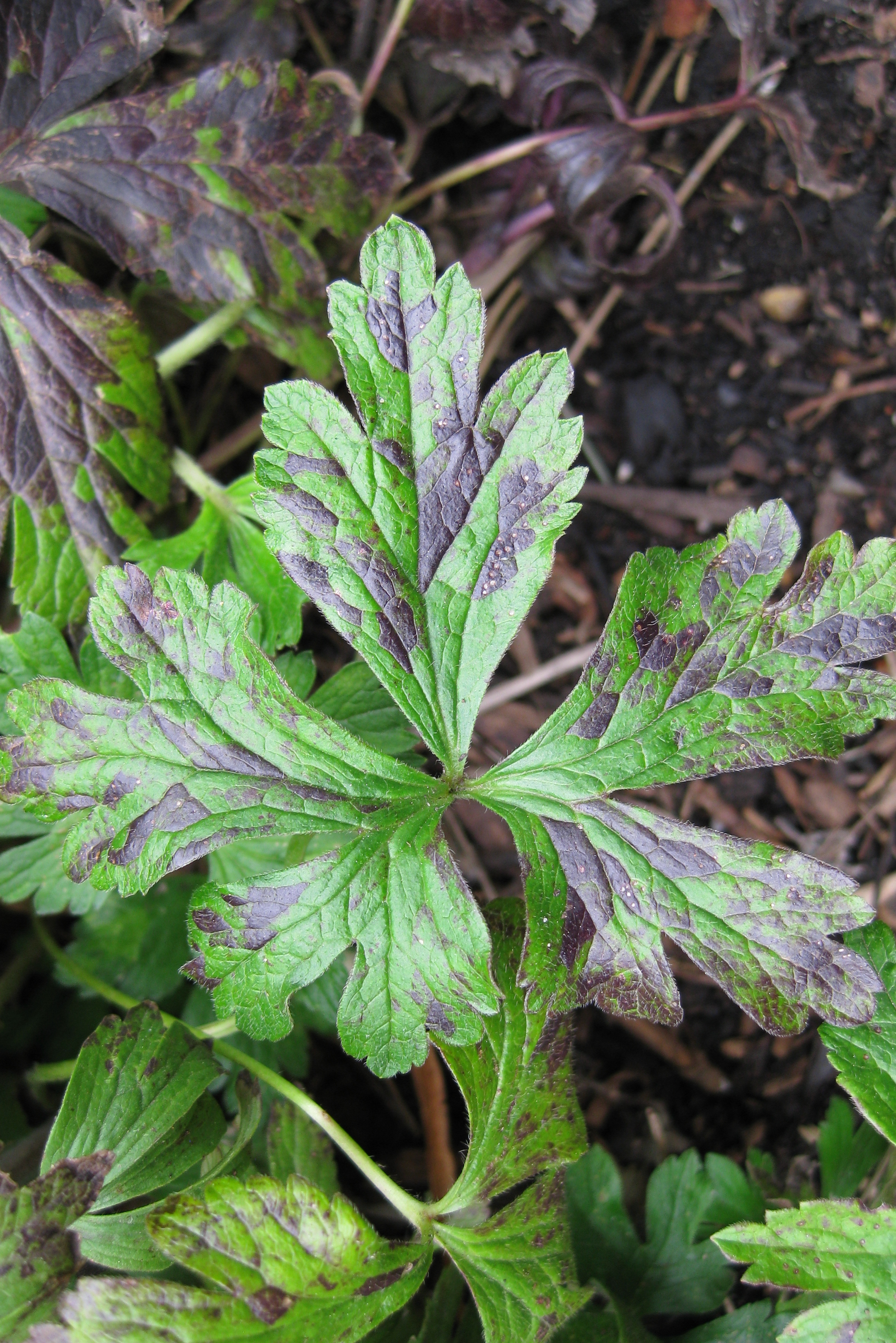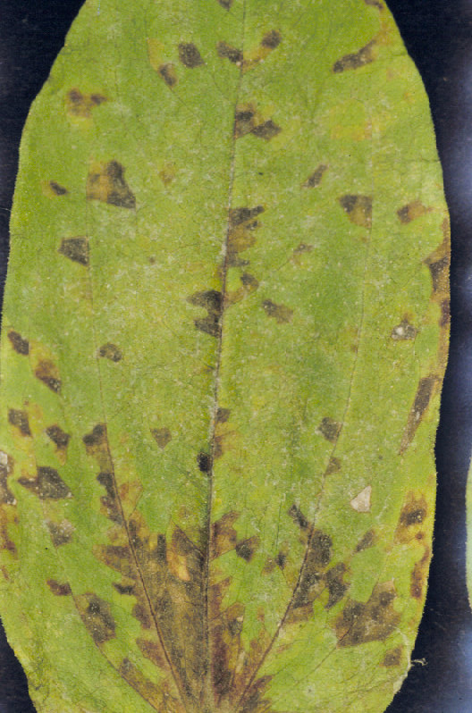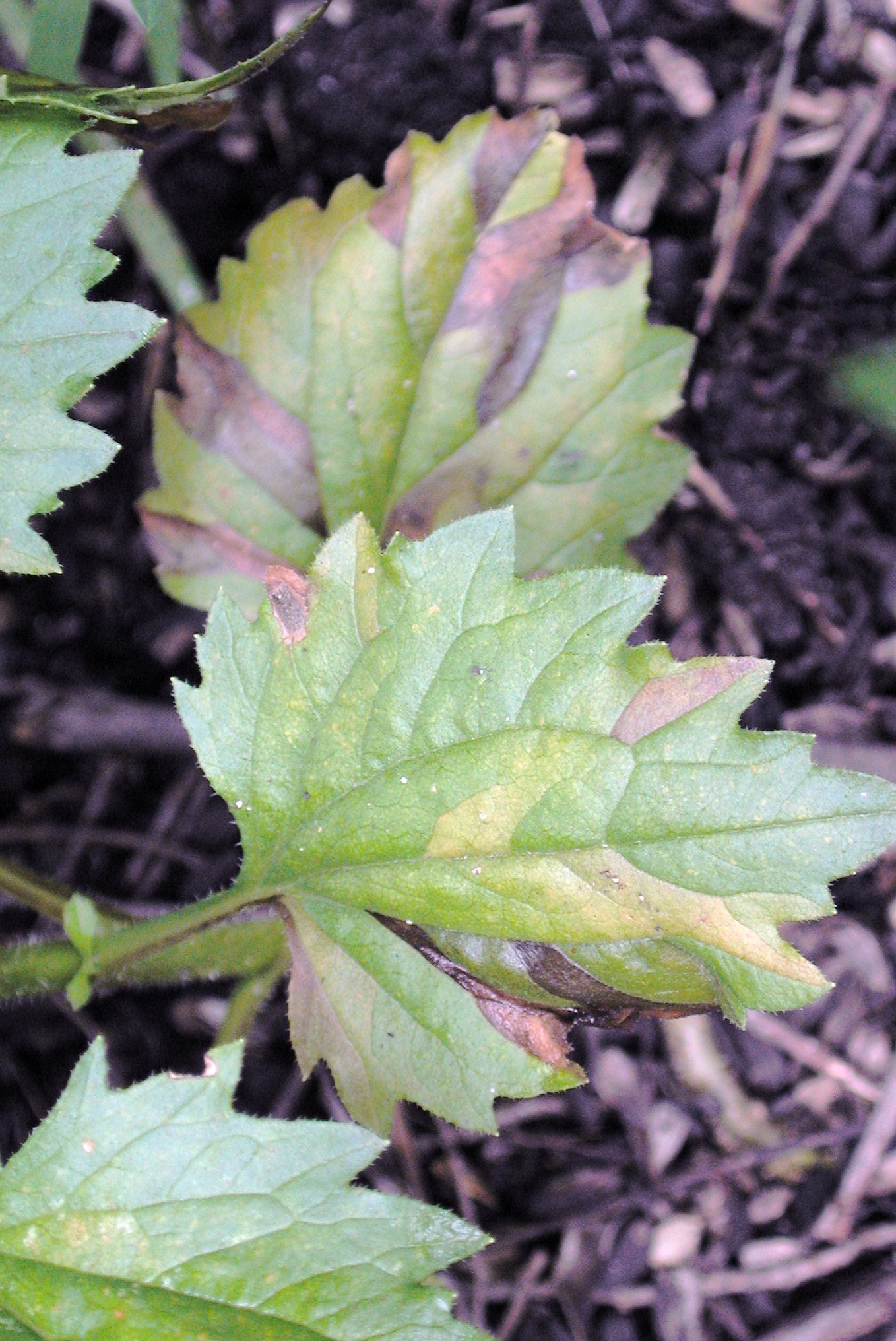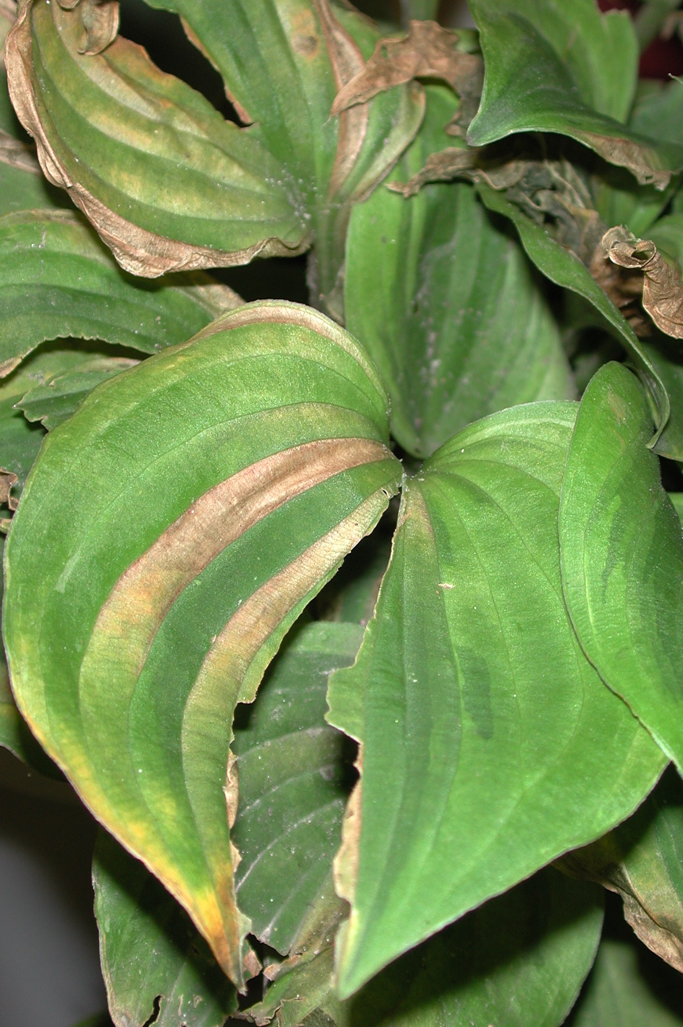 In leaves with parallel veins, like hosta, nematode feeding causes 'V', or wedge-shaped, sections of dead tissue. In leaves with a net-like vein pattern, like chrysanthemum, affected areas are blocky, irregularly-shaped patches that are outlined by the veins. Foliar nematodes occasionally cause serious defoliation. Samples of infested plants can be sent to a plant disease diagnostic lab for confirmation.