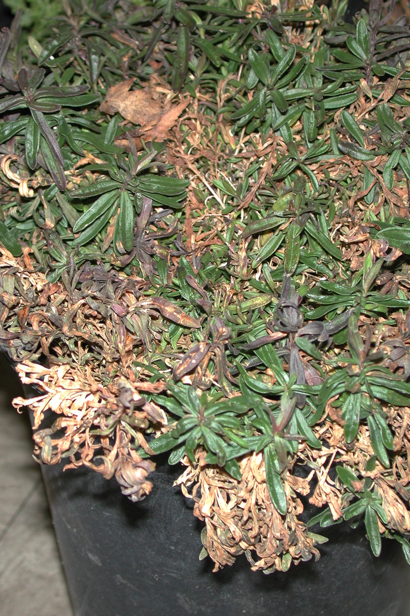 The first symptoms of Fusarium wilt are foliar: infected seedlings have scattered yellow, unusually small, or curled leaves followed by tip dieback, wilt, and stunting as the disease progresses. Infections in mature plants result in wilting and drought symptoms. In wet conditions, the pathogen can cause dead spots on leaves and stems. Diseased root systems show a lack of fine root development. A key diagnostic sign of this disease is the production of cushion-like masses of oozing, pinkish-orange spores on the crown of young plants. Fusarium root and crown rot symptoms can be confused with those for Phytophthora, Rhizoctonia, and other soil-borne pathogens and abiotic conditions. Send diseased plant samples to a plant disease diagnostic clinic for analysis.