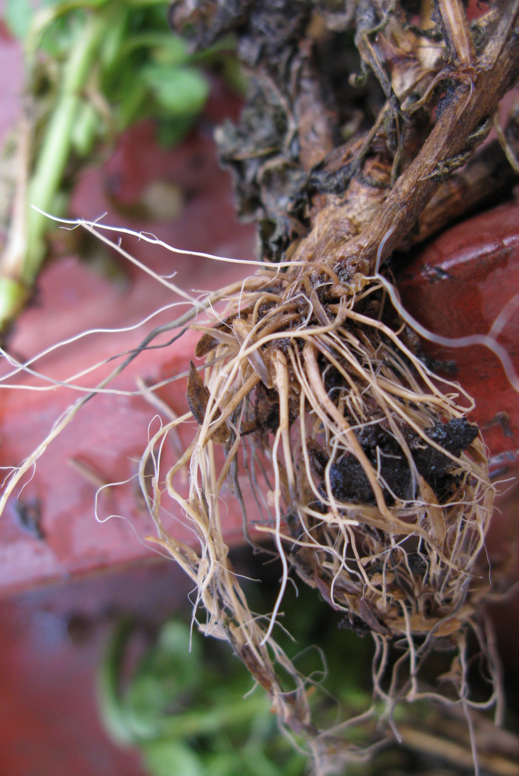 Thielaviopsis can survive in the soil for many years as thick-walled spores. Thielaviopsis infection prevents the roots from growing and lengthening. Poor quality roots cannot supply the leaves and stems with the water and nutrients required to grow. This leads to stunting, leaf yellowing, nutrient deficiencies, and drought-like symptoms.
