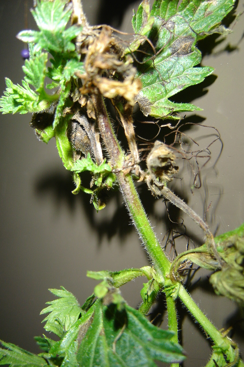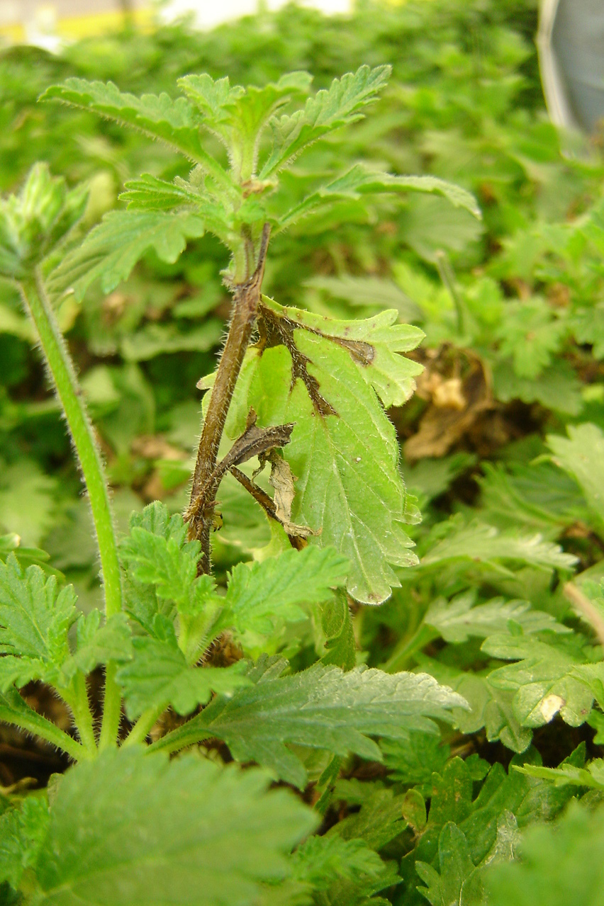 Verticillium wilt is a vascular wilt that reduces the plant's ability to take up water and nutrients. Symptoms closely resemble drought stress and nutrient deficiencies. Wilt, yellowing between leaf veins, leaf tip, and edge browning, and blighted branches are commonly observed. Cutting into the stem may reveal dark stained vascular tissue on woody plants.