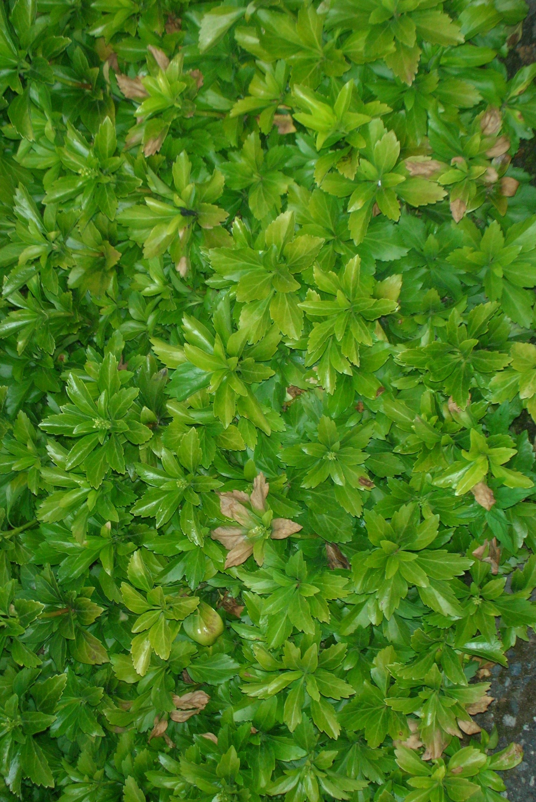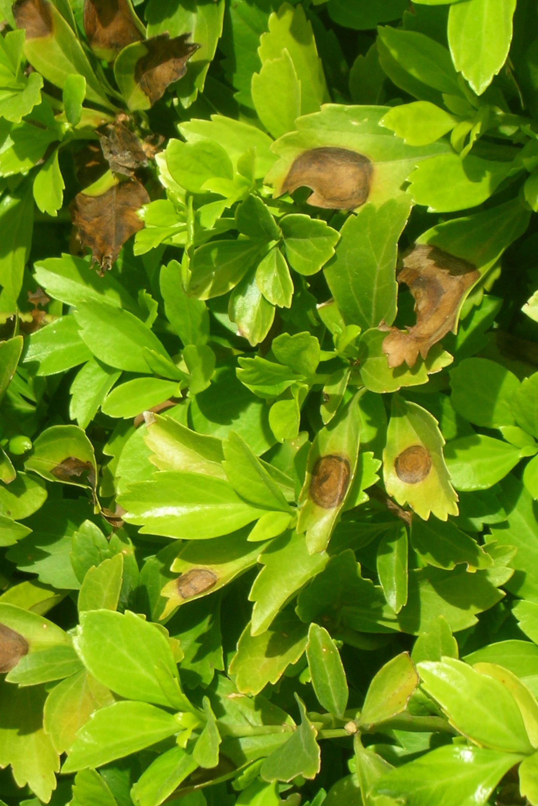 Remove infected branches (or plants if the disease is severe) and all plant debris. Decrease plant stresses due to environment, insect feeding and pathogens, and mechanical injury. Use drip irrigation where possible to reduce leaf wetness. Plant boxwoods and pachysandra in locations that receive adequate sunlight throughout the day.