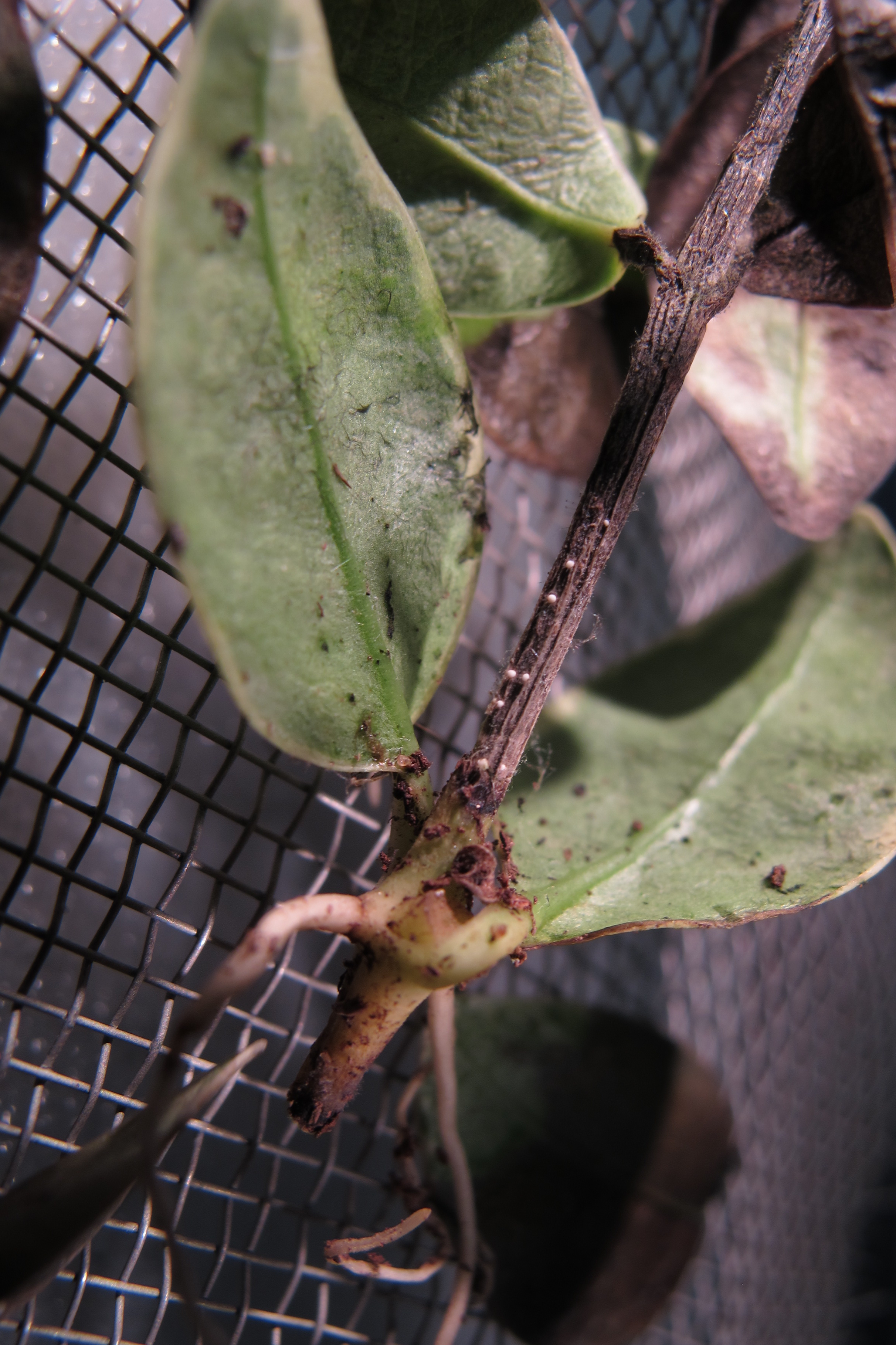 - Pink spore masses on dead stem