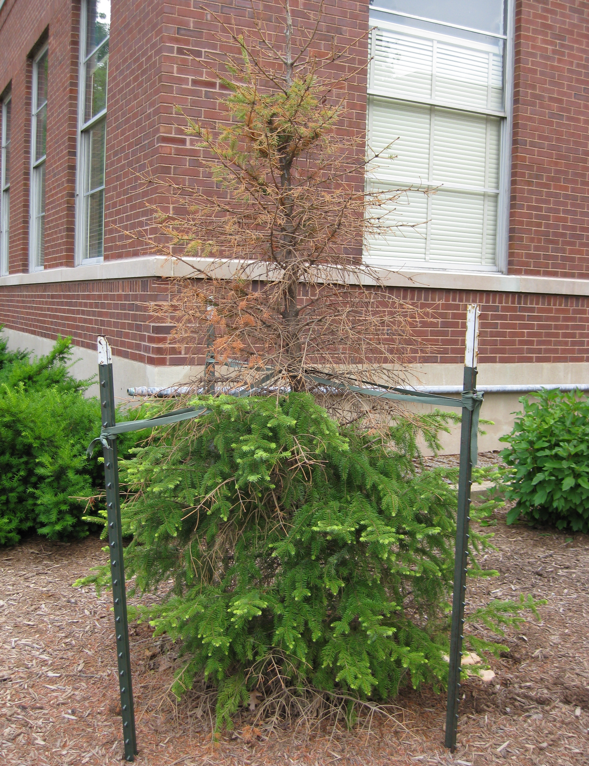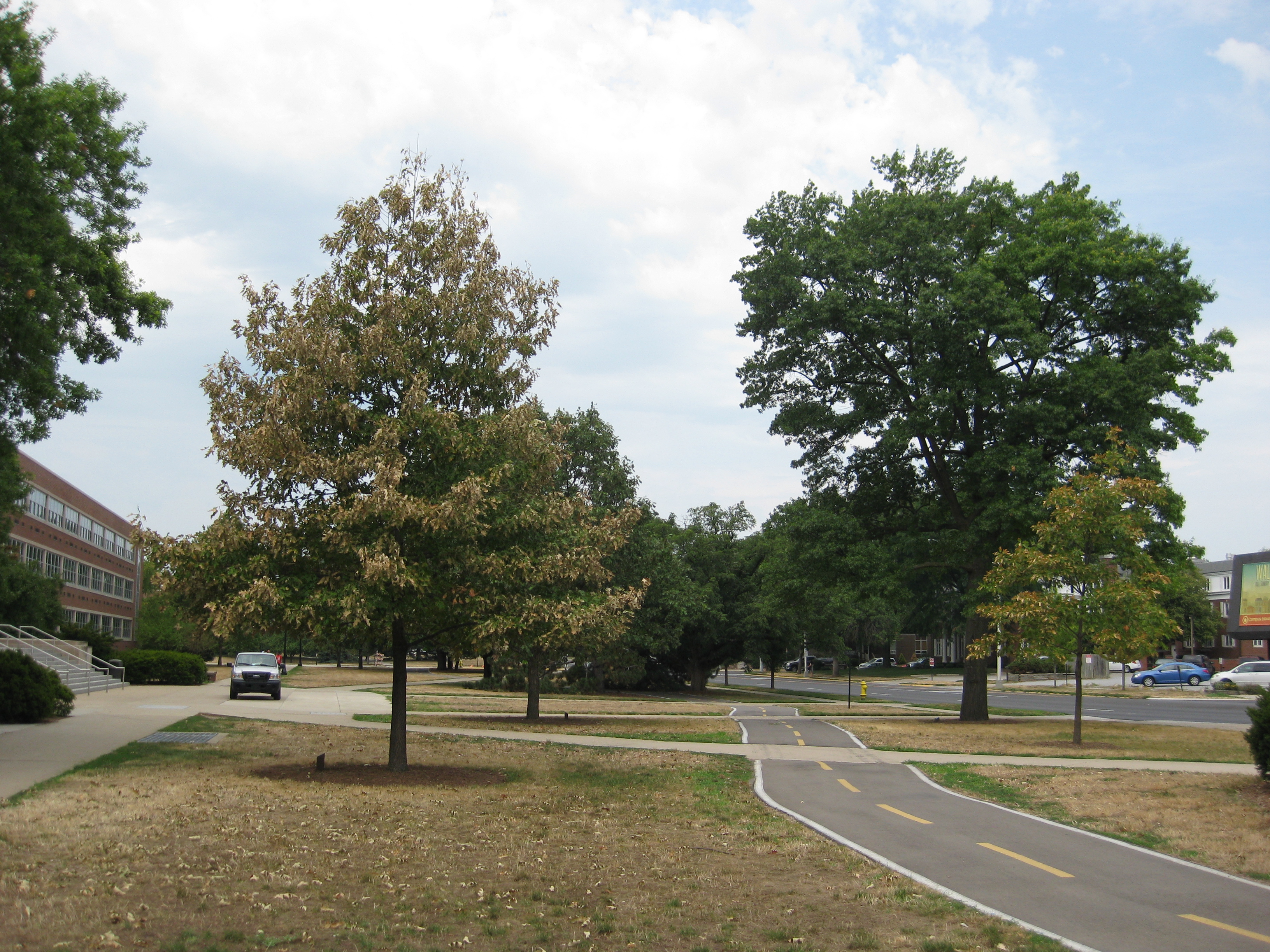Supplemental watering during dry conditions is important for reducing the effects of drought stress. Water trees whenever rainfall is insufficient for extended periods, especially on newly planted trees and those less established. A proven recommendation is to use the 5 + 5 rule, which says to provide 5 gallons of water plus 5 gallons for every diameter inch of tree trunk. For mature and well-established trees, provide 1 inch of supplemental water every week to keep moisture adequate. It is advisable to water plants though the fall until the ground is frozen, so that trees have adequate moisture to survive the winter months and are ready for spring growth.
