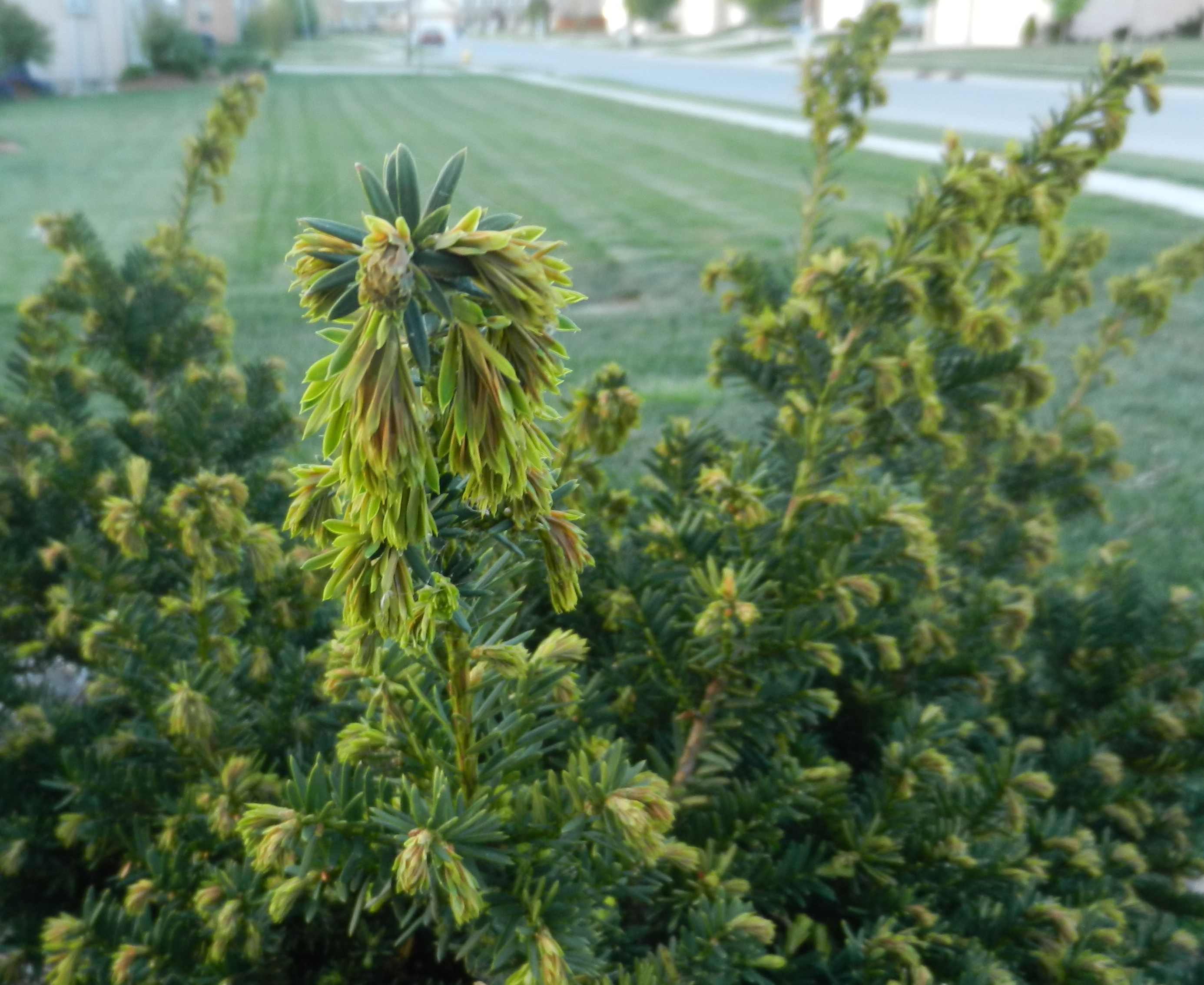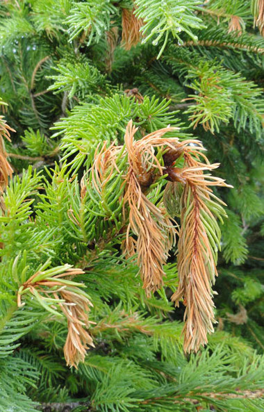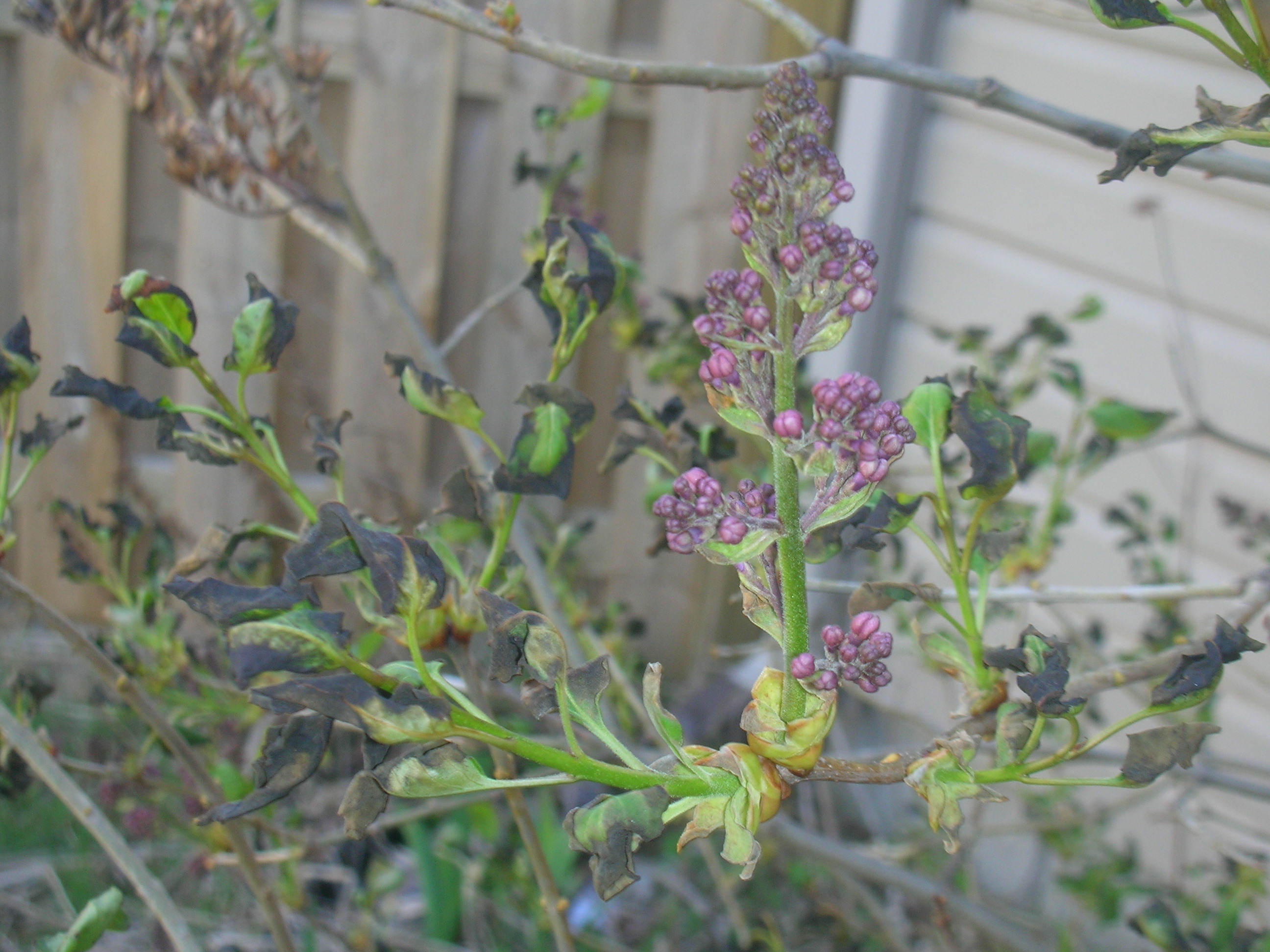 Frost injury is a result of cold temperatures that occur after the plant breaks dormancy. The leaves and stems of new growth typically become brown and curled, or shriveled. New tissue is damaged by the cold and results in holes in the leaf as the rest of the leaf continues to grow and expand. This damage can superficially resemble insect damage. Some conifer species will have branch dieback.