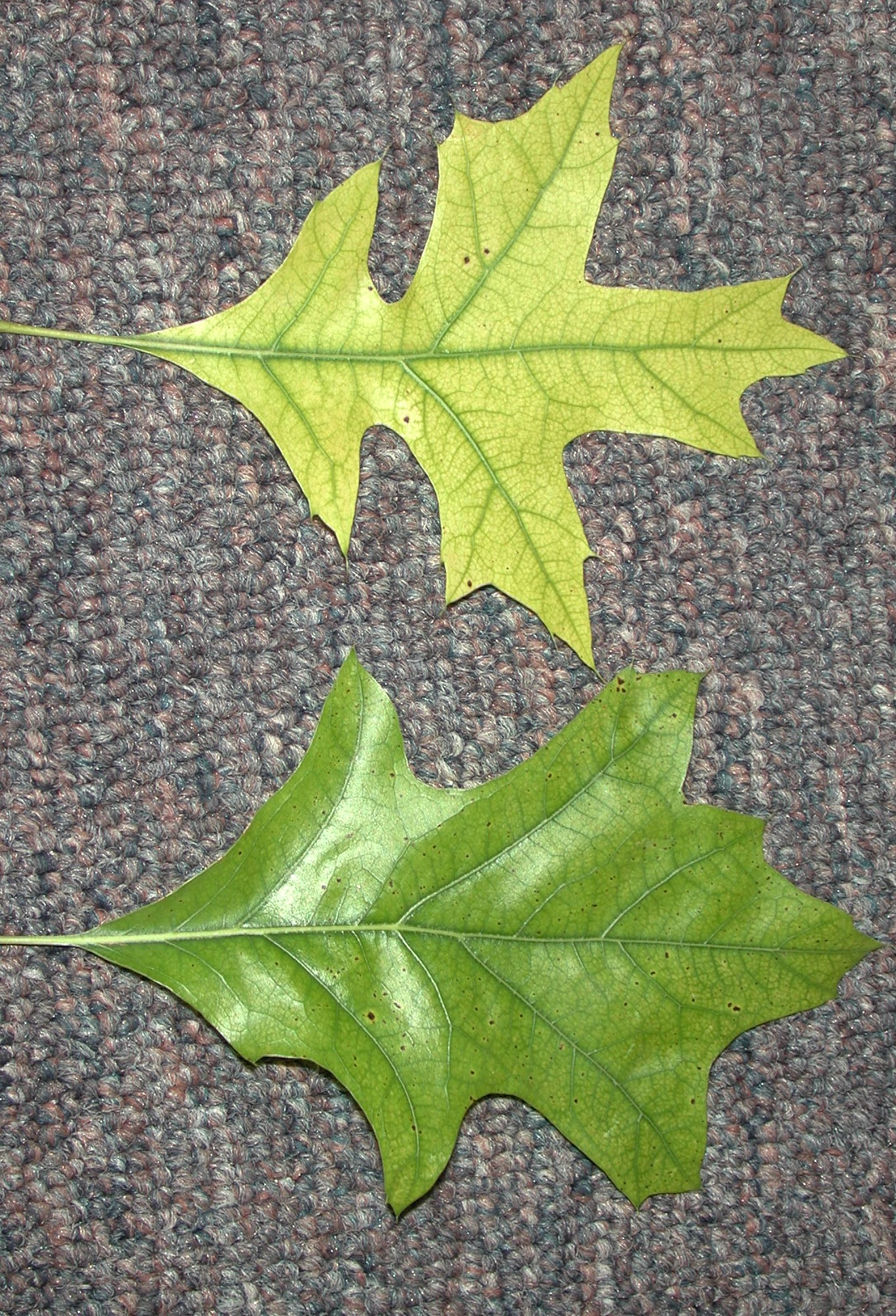 Iron chlorosis is a very common nutrient deficiency that is seen in many trees and shrubs growing under higher pH soil conditions (greater than pH 6.5). Leaves become pale green to yellow, and leaf veins are a darker green. On hot, sunny days the leaf margins can scorch and leaves drop prematurely.