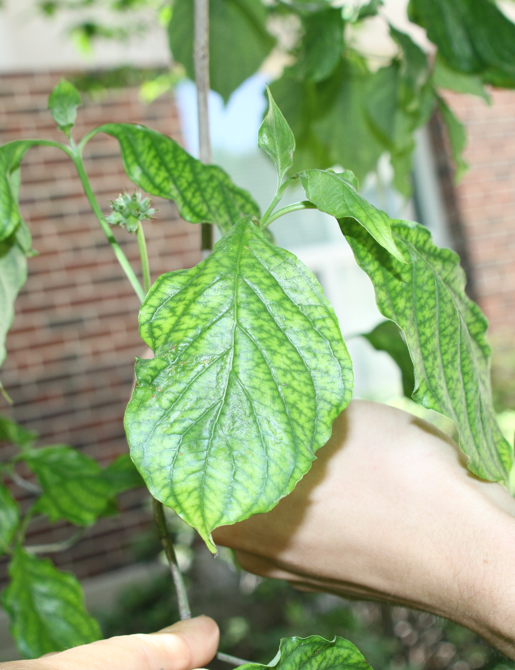 The management of iron chlorosis is both difficult and expensive, so prevention through the selection of more tolerant plant species and cultivars is essential. Always check soil pH and submit a leaf sample for analysis. See the links section (the i in the upper left corner of the main page of this app) for a plant diagnostic lab in your state. There are several treatments for the management of iron chlorosis, but these need to be continued on a regular basis and most people find them unsatisfactory in the long-term. Foliar sprays of iron can temporarily remove symptoms, but must be applied repeatedly. Application of trunk injections by professionals can also reduce symptoms temporarily but can cause injury. For large trees, soil treatment is usually unsuccessful due to the tremendous capacity of soil to buffer its pH, and therefore is not recommended.
