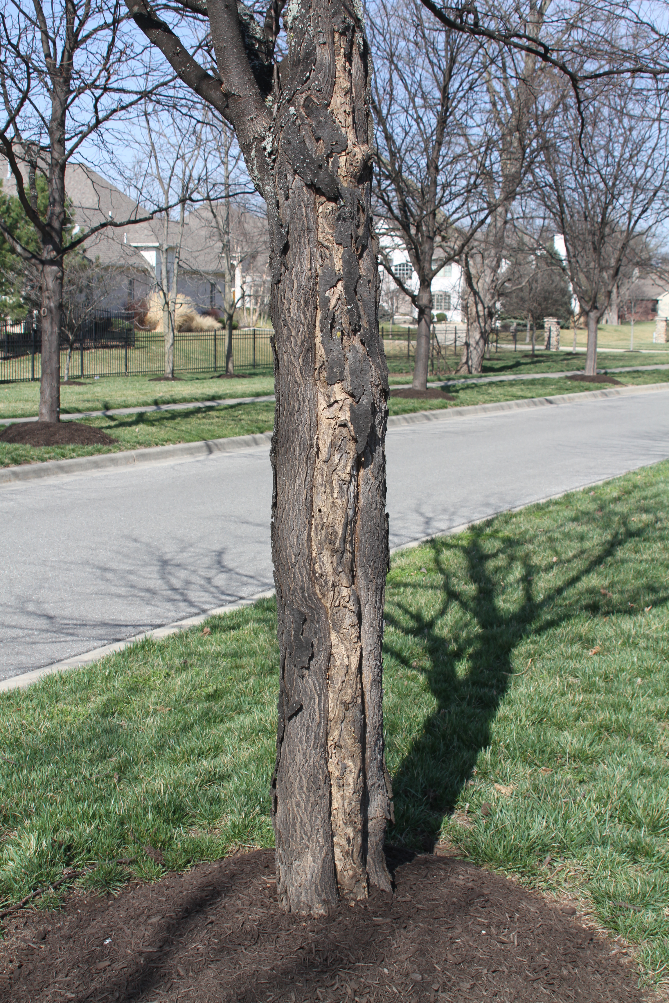 The best methods to limit sun exposure to the trunk are by wrapping the trunk loosely with tree wrap (up to the first branch) or by painting the trunk white. The painting method is rarely used in landscapes due to the permanent change in color, but is an effective technique in orchards. Also, planting in areas that are limited to southern sun can help prevent sun scald.