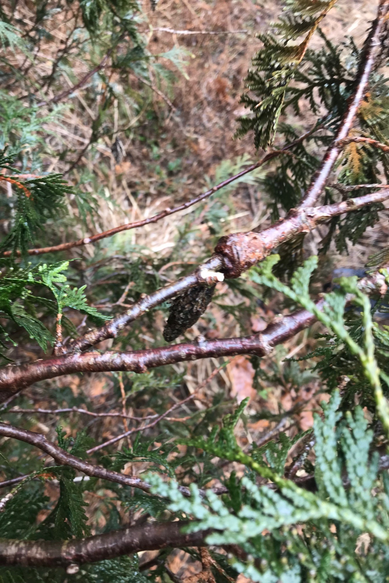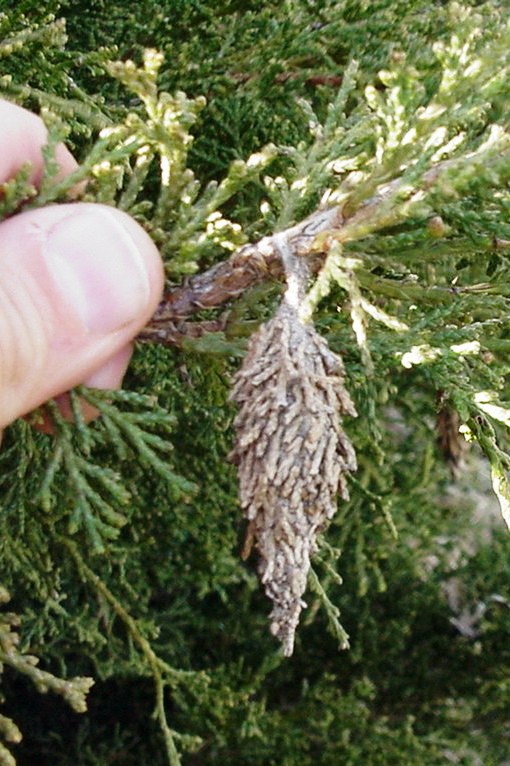 During July and August, bagworms may defoliate conifers such as arborvitae and juniper as well as deciduous trees and shrubs. Bagworms are caterpillars that live inside spindle-shaped bags which they construct to protect themselves against birds and other enemies. These bags are made of silken threads and bits of foliage. Bags often go unnoticed when covered with freshly cut leaf bits that resemble the rest of the tree.