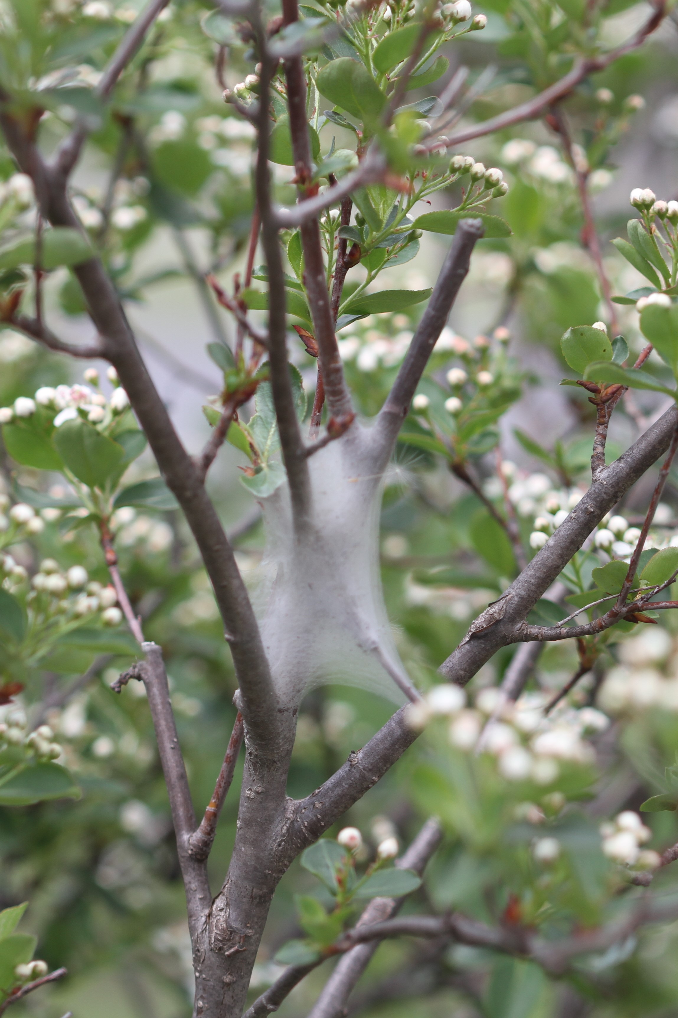 Egg masses winter on twigs. Eggs hatch soon after crabapple and cherry leaves break out of leaf buds in spring. Caterpillars crawl to a central branch junction in a tree and start to form webs. Caterpillars remain in webs during the day to avoid predation from birds. At night, caterpillars crawl from the mass of webs to feed on leaves. Caterpillars continue feeding until early May when they crawl in large numbers to enter the transition stage called a pupa. Adult moths fly in June, mate and lay eggs on twigs in July.