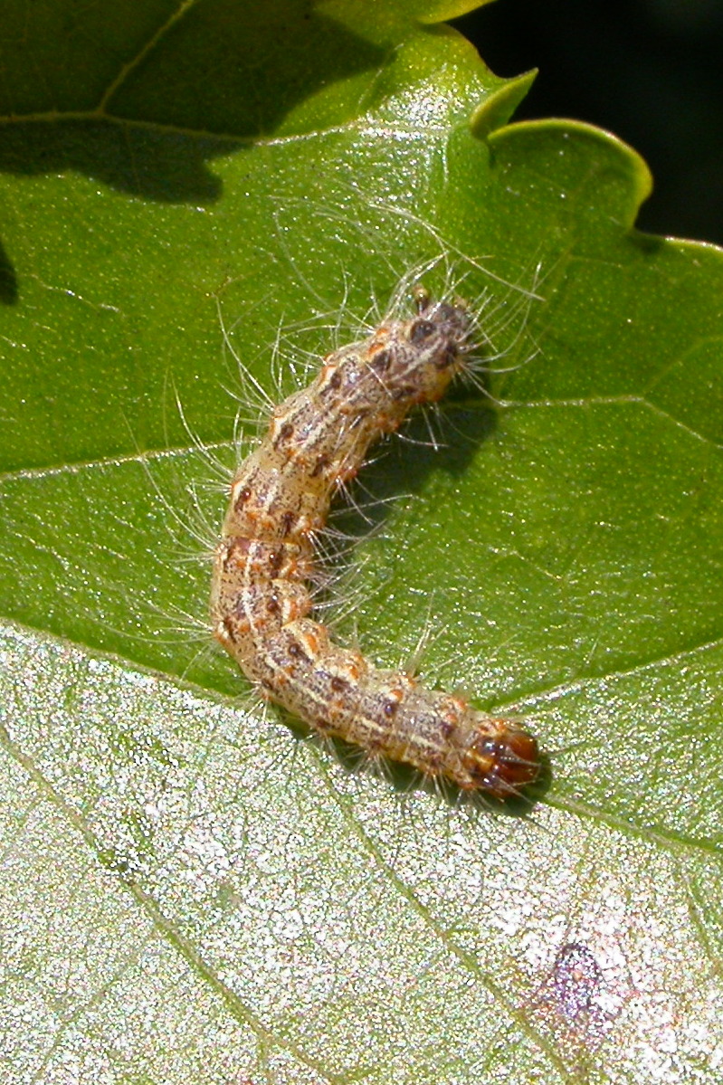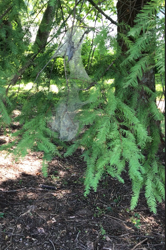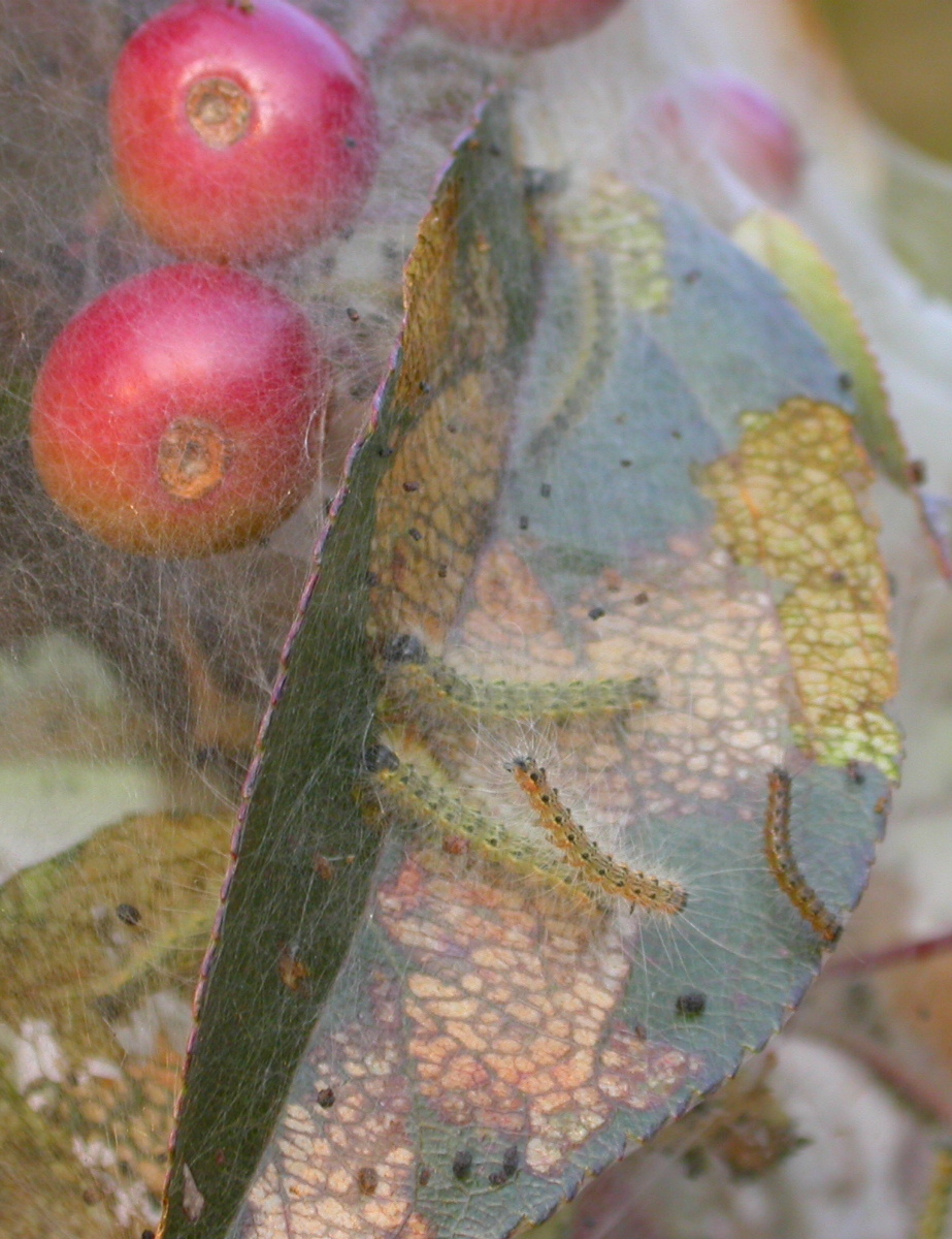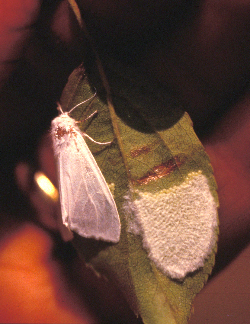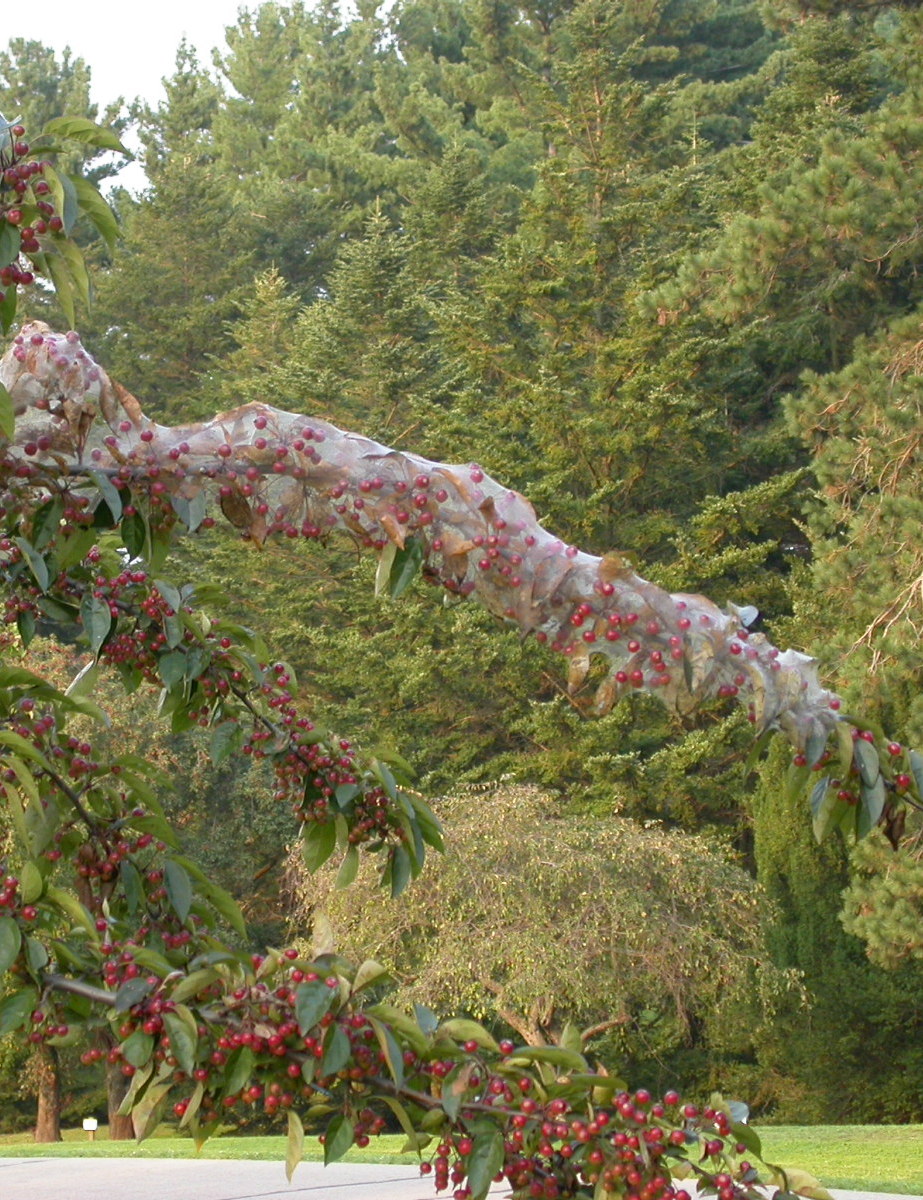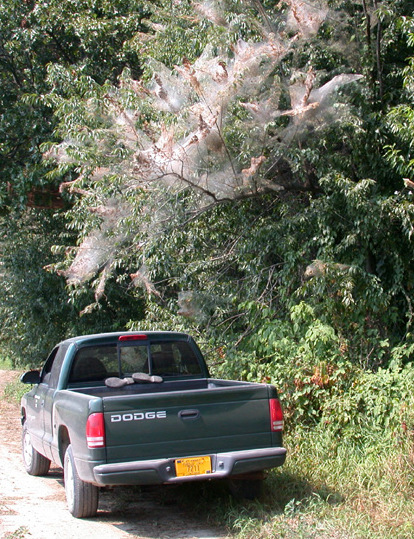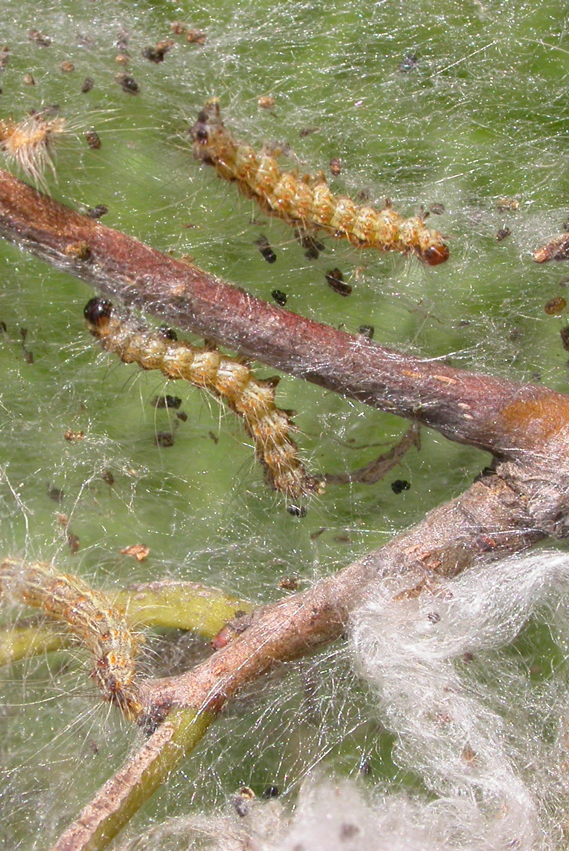 Large webs are found at the edge of the canopy. Heavily infested trees can be completely covered by the webs produced by caterpillars of the fall generation. Caterpillars are yellowish-green with black spots and long white hairs, and grow up to 1.5". Young caterpillars skeletonize leaves and older caterpillars consume them. Caterpillar feces falling from trees can be a problem during heavy infestations.