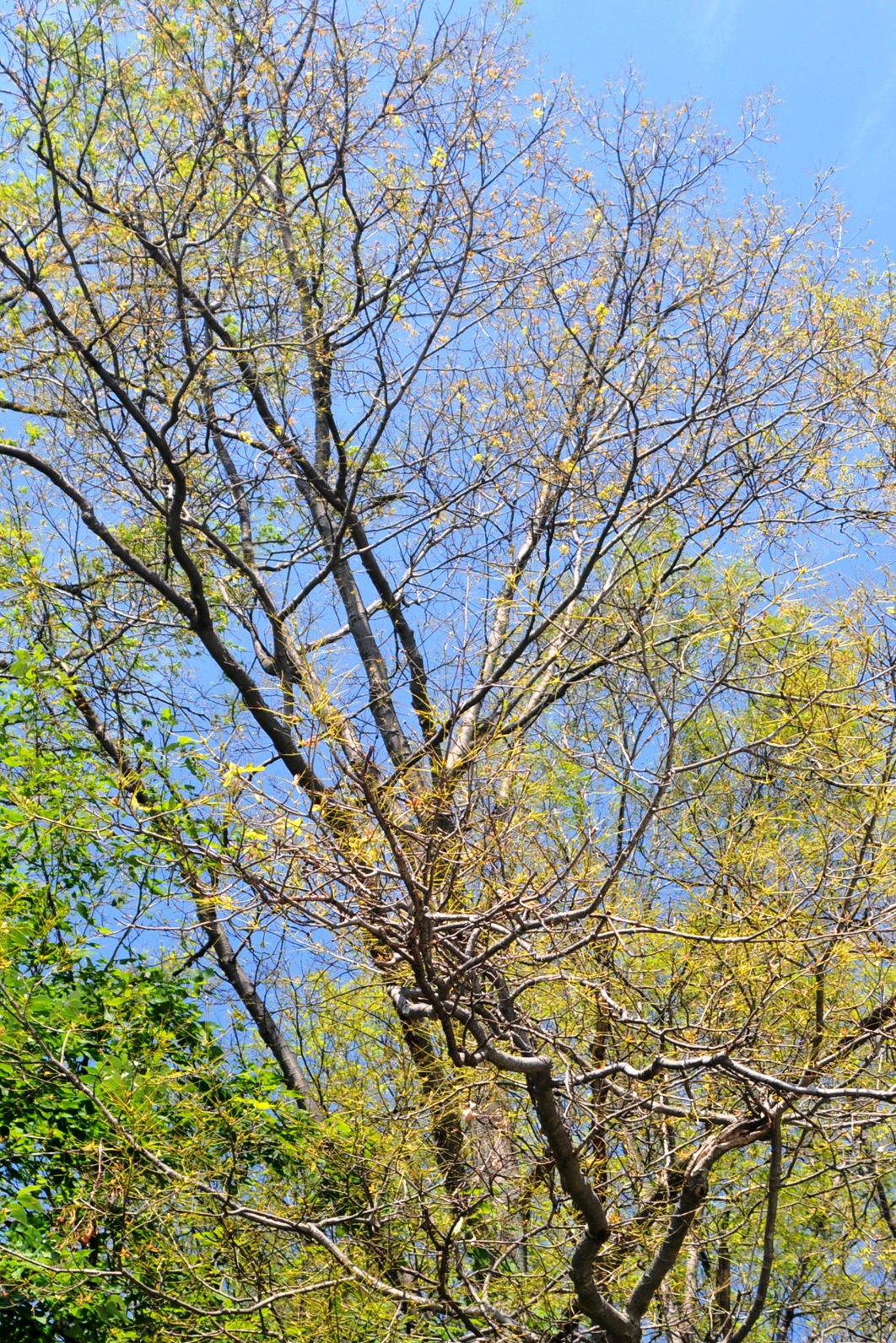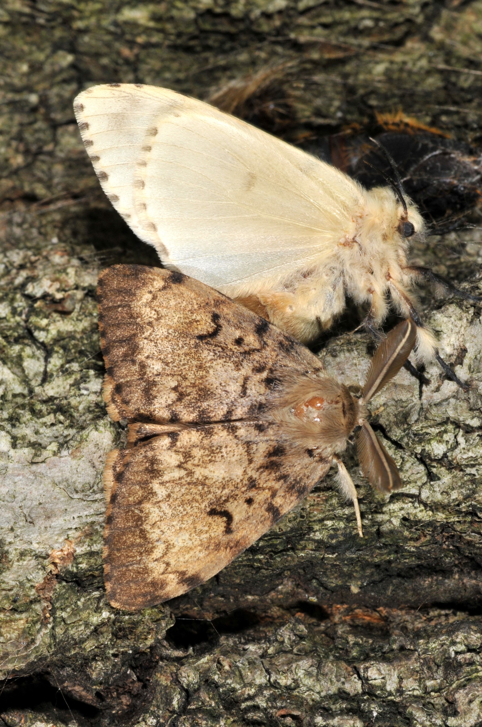 Egg masses containing from 50 to 1500 eggs can be found on tree trunks and nearby sheltered areas including door jams, picnic benches, firewood, under vehicles, and at the bottom of nursery containers. Eggs hatch in late April into black caterpillars that climb to the top of a tree or structure so they can be blown by the wind to a new tree. When the caterpillars land on a tree they begin feeding on leaves. As caterpillars become large, they feed only at night. When full grown in late June, caterpillars will wander to sheltered areas to where they become adult moths after constructing an intermediate stage called a pupa. In mid July, white female and brown male moths emerge. Adult female gypsy moths do not fly. They sit on trees and release a scent that attracts males. After mating, females will walk to find a sheltered place to lay eggs.