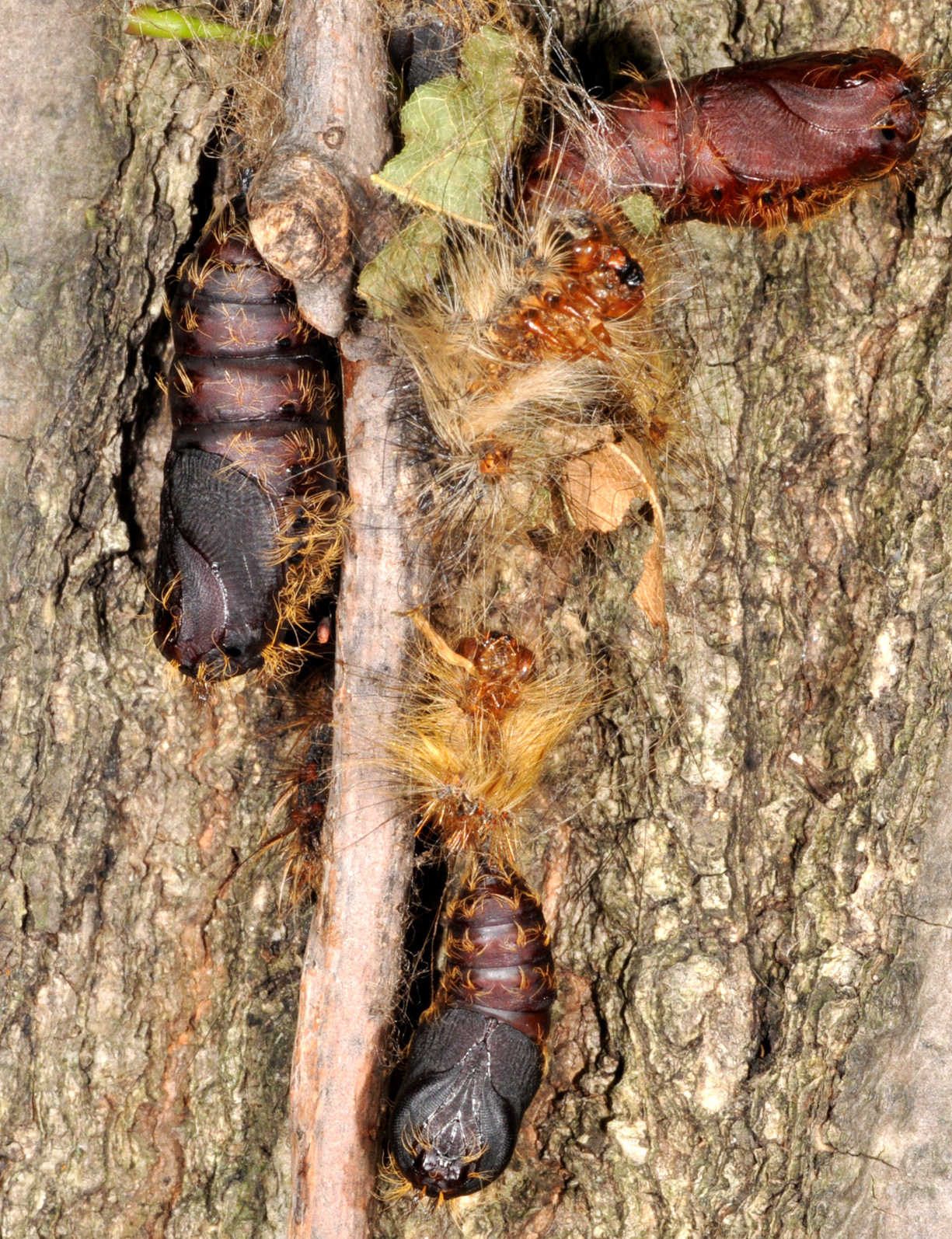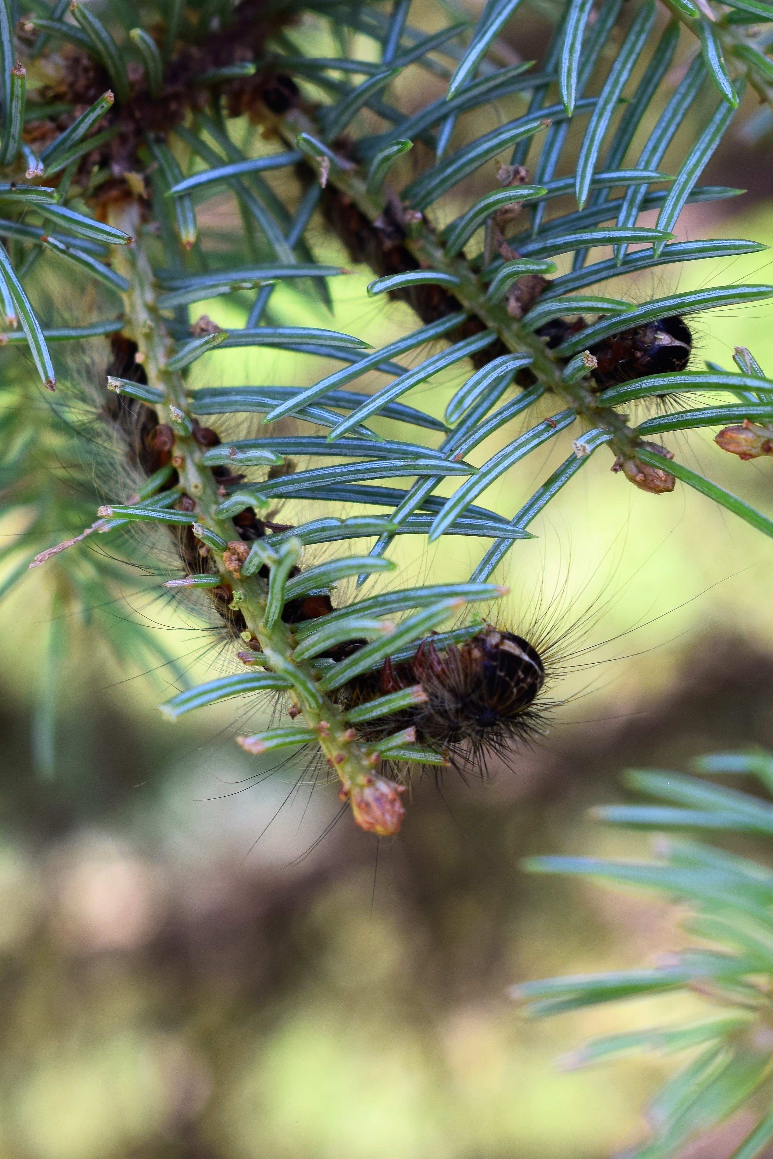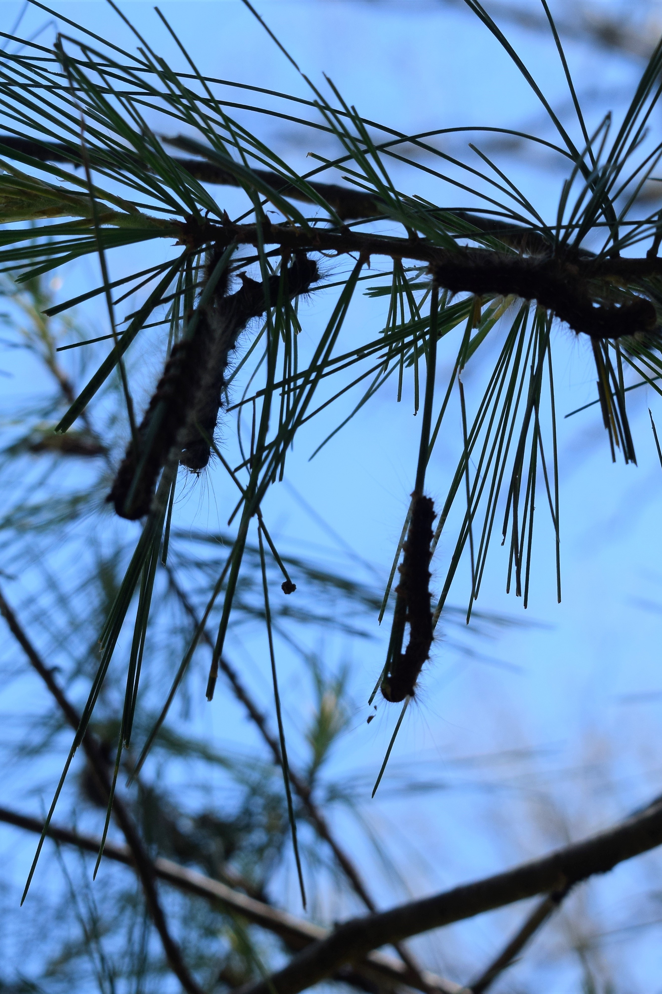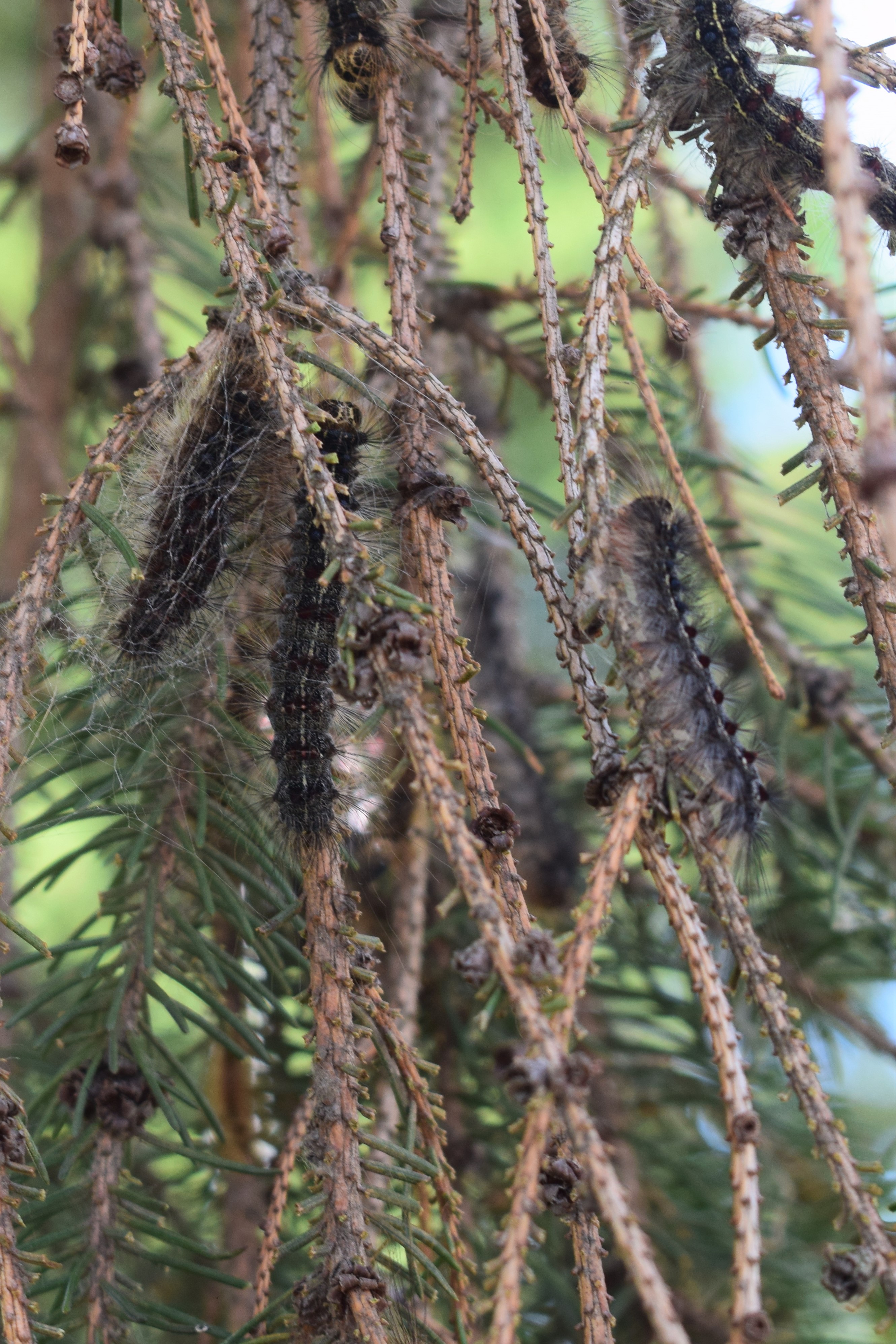 Infested trees can be completely defoliated by hairy, red and blue spotted caterpillars that grow up to 2 " long. Although many deciduous tree species will leaf out again, complete defoliation 2-3 years in a row is lethal. During heavy infestations, the rain of caterpillar excrement below trees can be a nuisance. White adult females can be found laying light brown egg masses from mid to late July through early August. On spruces, pines and Atlantic white cedar, loss of more than half the leaves can be lethal.