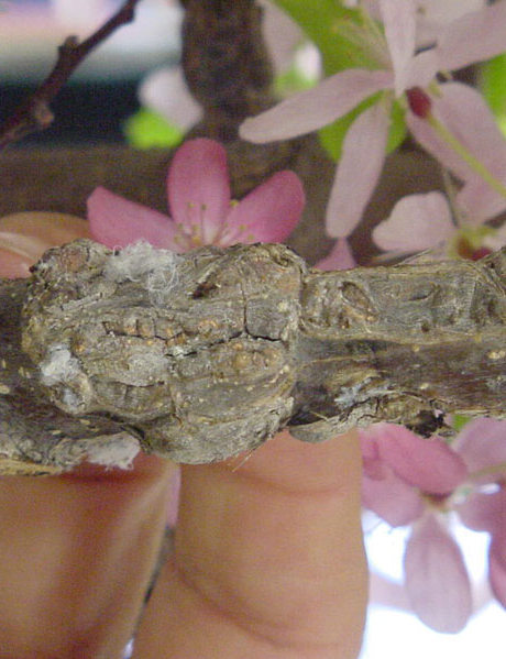 Conserve the natural enemies that protect your tree from other pests by applying horticultural oil in the spring to kill overwintering aphids on twigs. If aphids are seen later in season,an application of insecticidal soaps or summer oils, or neem can be helpful. Broad spectrum contact insecticides like bifenthrin can kill more aphids, but may foster outbreaks of spider mites later in the season. To protect bees, do not apply foliar insecticides when bees are flying to flowers. Use varieties of trees grafted onto resistant root stocks in areas with a history of high populations of woolly apple aphid to avoid problems. When insecticides are needed, avoid using long lasting broad spectrum materials when natural enemies have been detected. Application of alternative insecticides like insecticidal soaps or horticultural oils can kill large numbers of aphids while allowing natural enemies to re-colonize aphid infestations after these materials have dried.