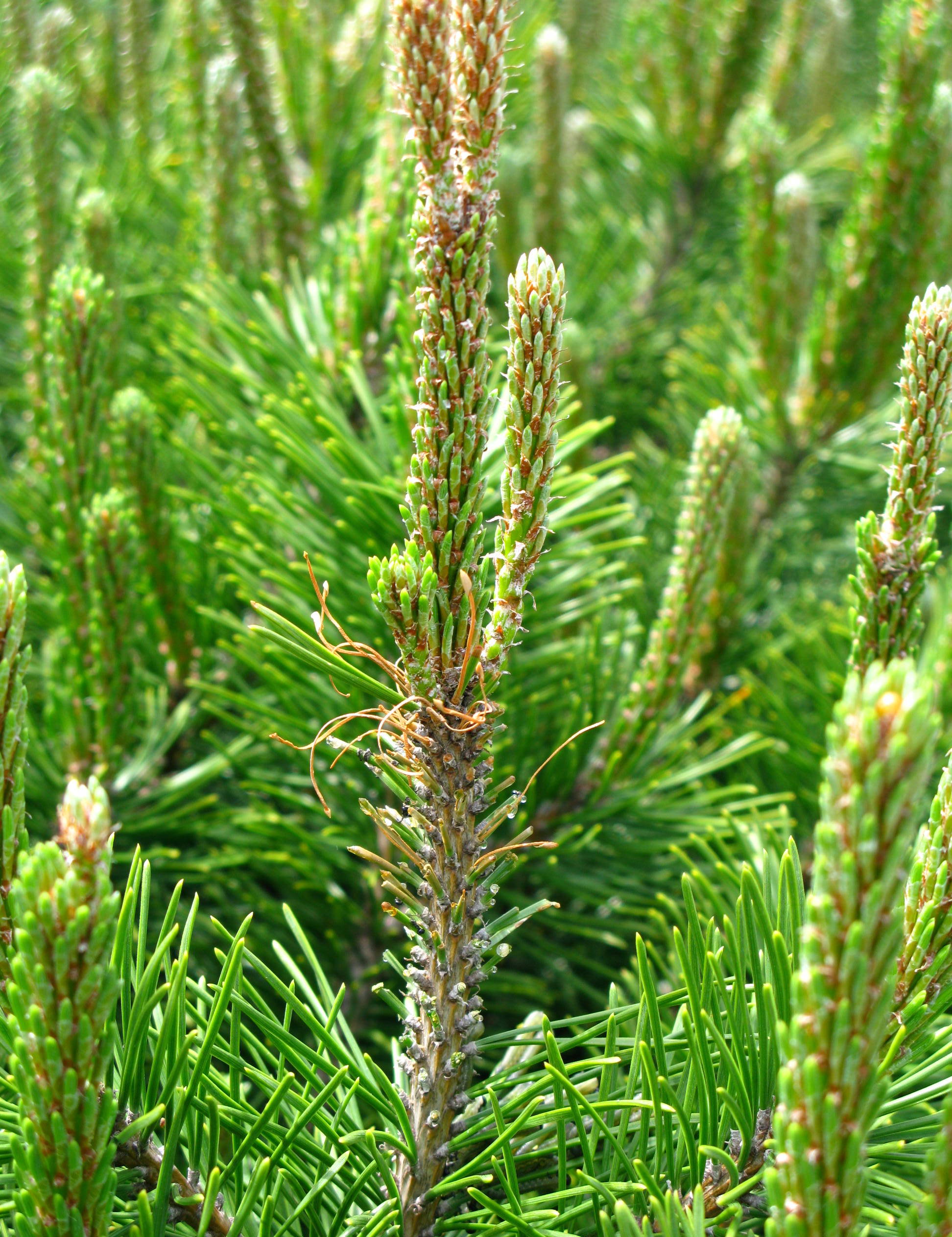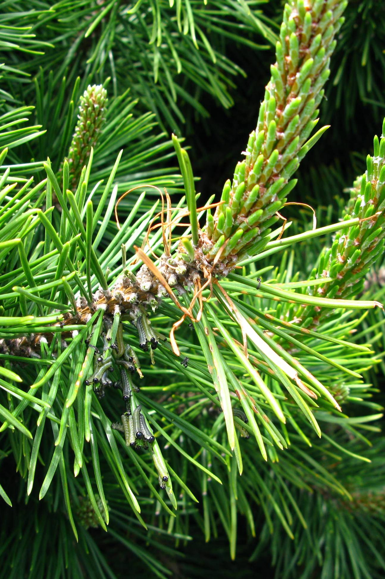 Inspect plants in early spring for straw colored needles that have been stripped by young worm like sawfly larvae. These can be easily killed by most foliar insecticides before significant damage occurs. To control sawflies without promoting later season problems with scale insects use biorational products such as spinosad, chlorantranilioprole, indoxacarb, neem oil, insecticidal soap or horticultural oil. After sawflies are one inch long they stop feeding and build cocoons and transform into adults. Sawflies regularly suffer from a lethal virus-like disease that greatly reduces their number. If you notice larvae that are hanging limp from pine needles there is no need to apply an insecticide.