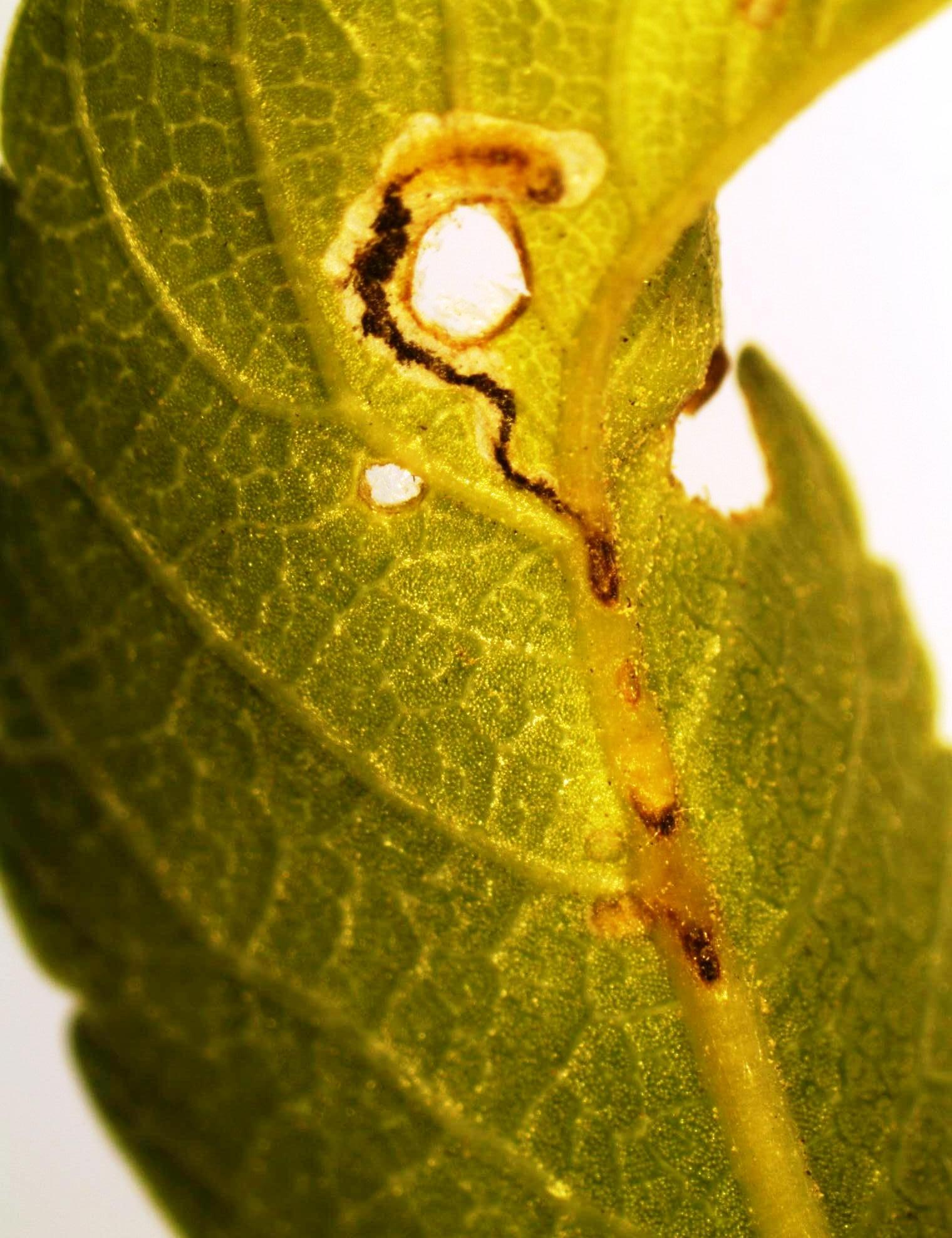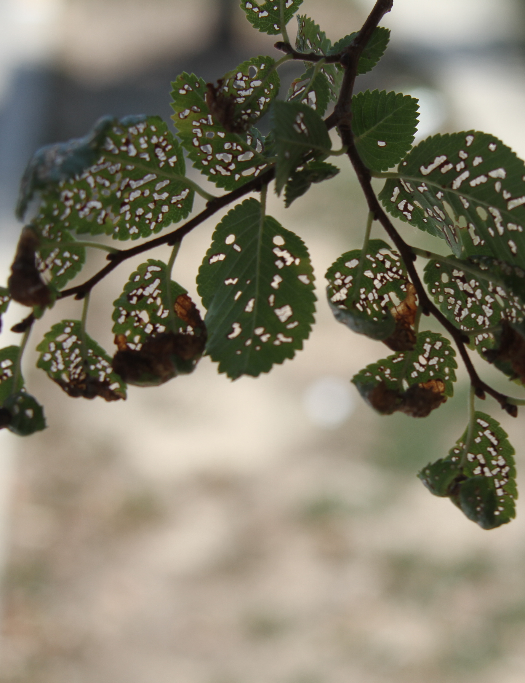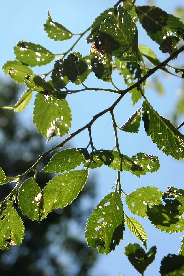 Infested leaves have either one or more brown areas produced by leaf mines feeding inside the leaves. Leaves may also be peppered with holes in early spring and in late summer. From a distance, the accumulation of chewed holes can give a tree a faded appearance. If mines are present in the absence skeletonized leaves, the culprit could be a species of sawfly wasp (elm leaf mining sawfly, Fenusa ulmi).