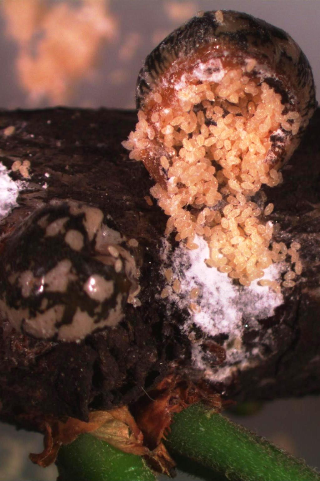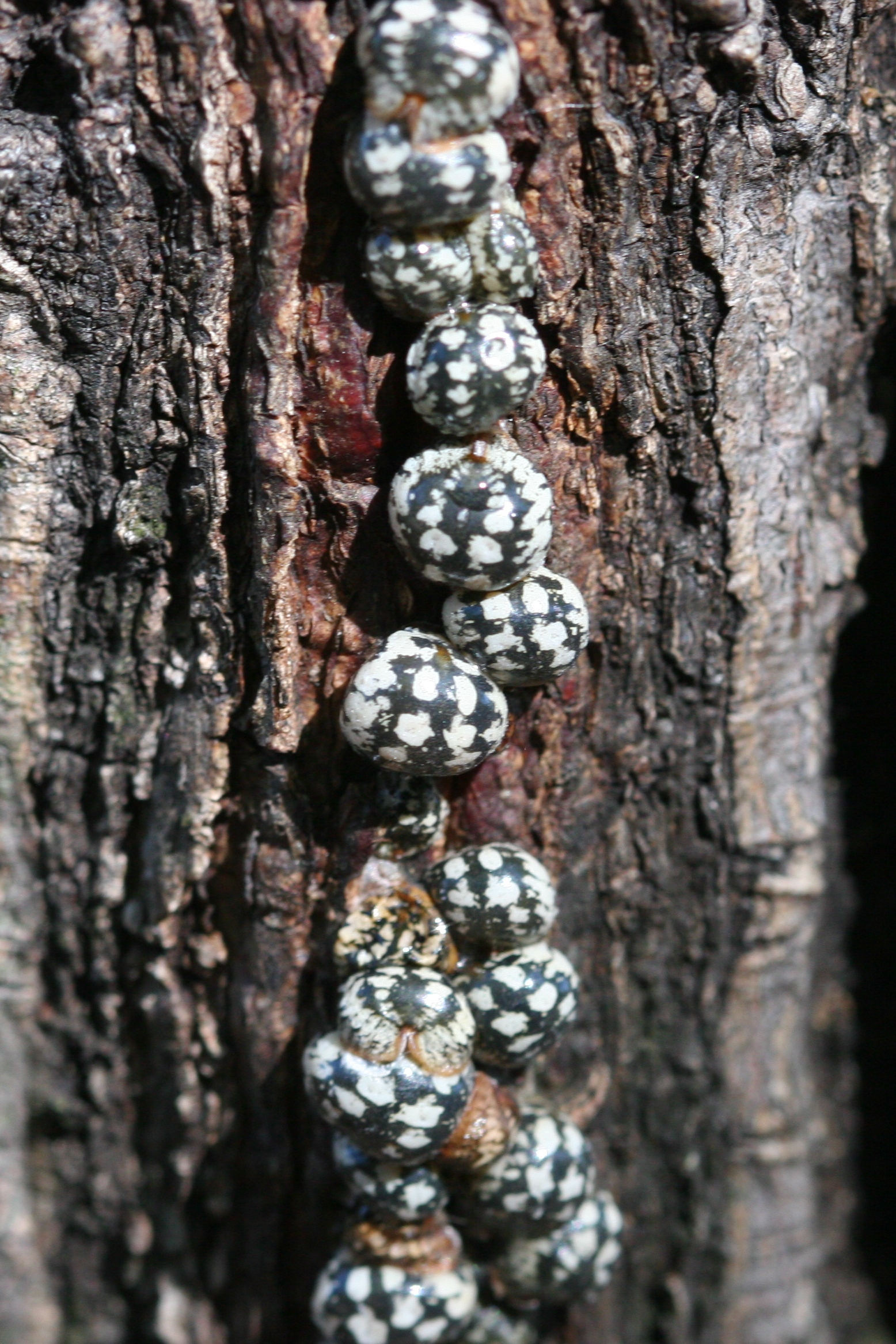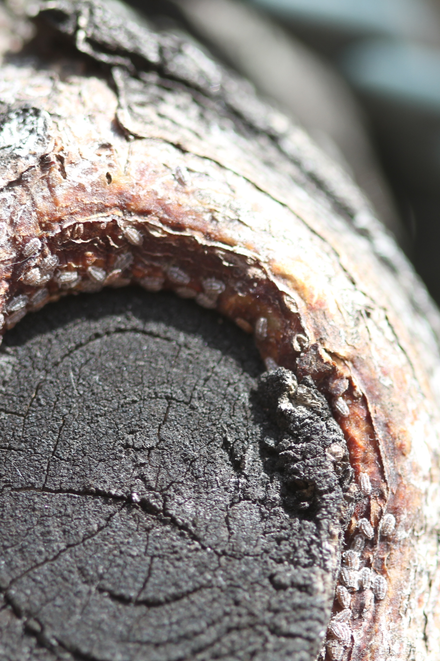 Trees infested with calico scale become covered with a sticky liquid excrement called honeydew. Heavy infestations can kill branches. Lower branches become weak or die from excessive coating with sooty mold. Branches and leaves can be coated black when honeydew gets infested with a sooty mold. Honeydew can also become a nuisance in the summer when it rains from the tree canopy and attracts stinging wasps. Calico scales are easily distinguished from other soft scales by the distinct pattern of white flecks on its black body. All stages of this scale can be separated from the plant tissue by flipping them over with a fingernail without ripping the plant surface. If you remove a bump on a plant and the tissue rips, this means the plant has produced a gall or swelling in response to an insect or disease.