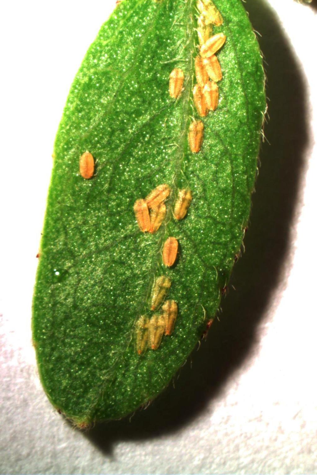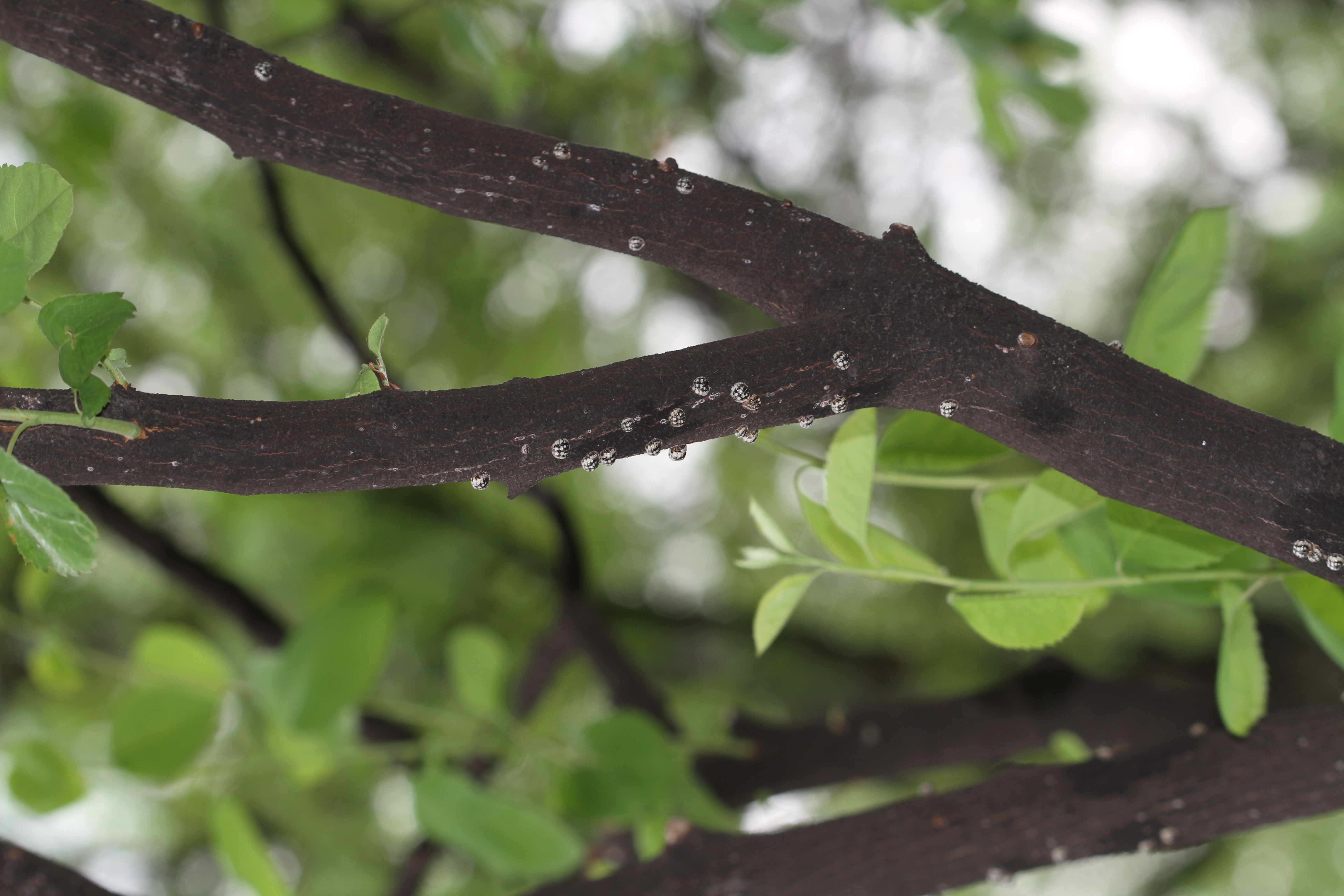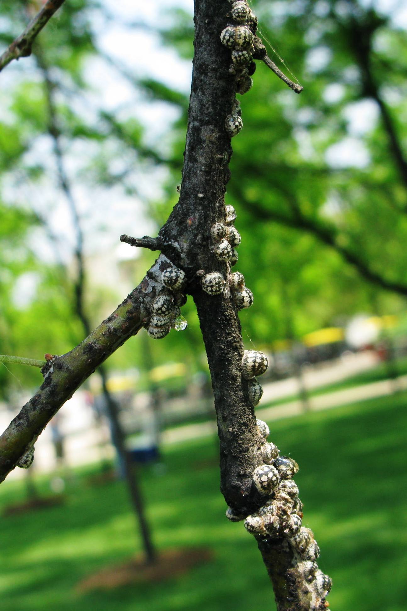 Immature scales winter in cracks and crevices of branches and the trunk. Scales begin to grow and expand as the weather warms in the spring and the sap begins to rise in the trees. They become adults in early spring when winged males fly to wingless females to mate in April. Females fill themselves with thousands of eggs that hatch into a wingless, crawling stage in late May when Washington hawthorn is in full bloom. These crawlers walk to leaves where they settle down to feed on leaf sap and produce liquid excrement for the duration of the summer. By the end of the summer, just prior to leaf drop, the scales walk back to the stems where they spend the winter.