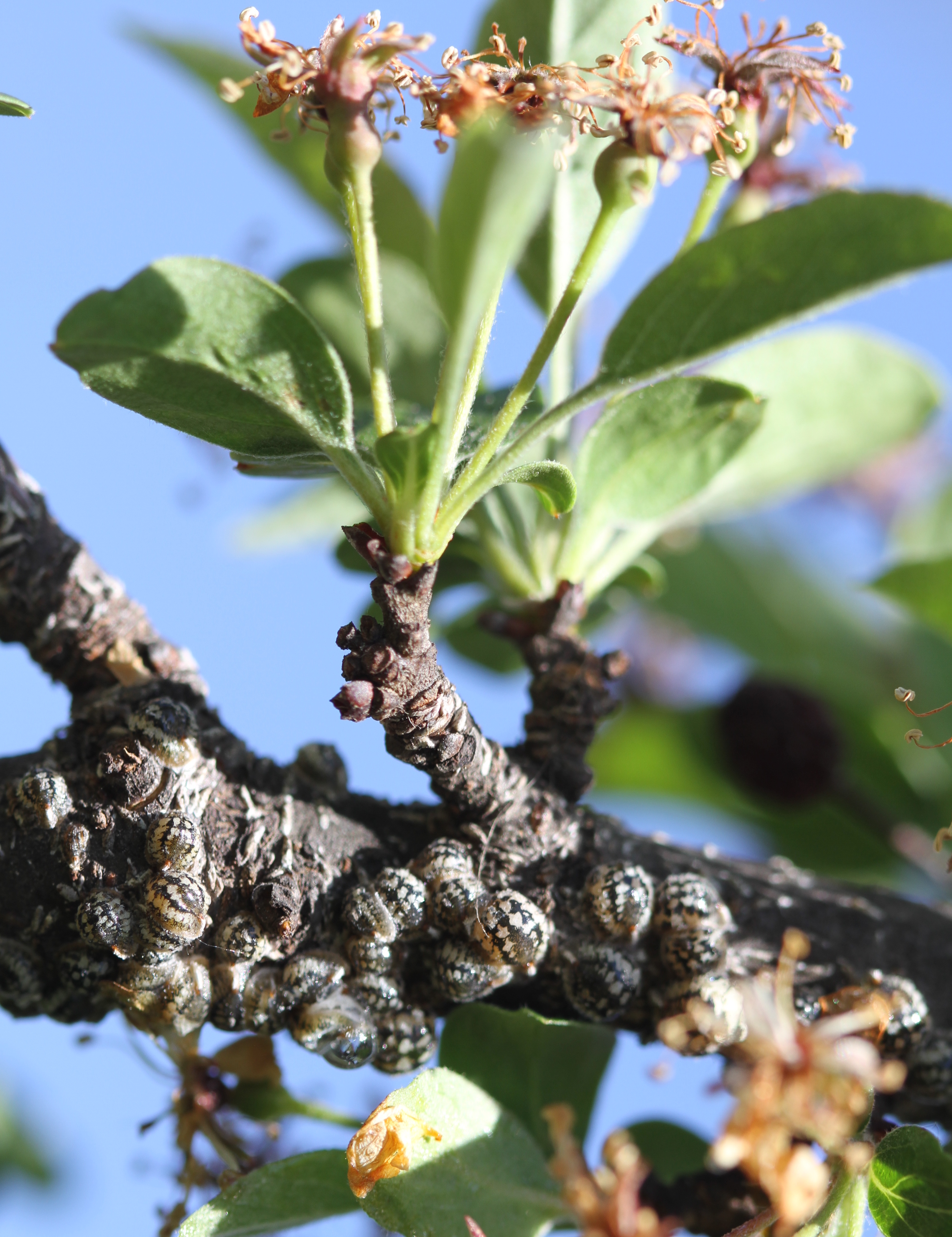 Insecticidal soap is most effective against actively crawling scale insects with minimal impact on beneficials. Pyriproxifen or buprofizen directed against crawler and recently settled scales can help reduce scale populations with minimal impact on the beneficials that eat scales and prevent outbreaks of spider mites. Other products listed will kill scale crawlers and beneficial insects. Bifenthrin is effective when applied on egg laying scales in the spring, but can cause outbreaks of spider mites later in the season. To protect bees, do not apply foliar insecticides when bees are flying to flowers. Applications of oil in the dormant season DO NOT control this pest. Soil applied systemic insecticides (imidacloprid and dinotefuran) can kill the scales on a tree, and stop the rain of honeydew within several weeks after application if trees receive adequate irrigation after treatment. They ultimately destroy the natural enemies that normally keep calico scale from becoming a problem. To protect bees avoid use of these products until AFTER flower production.
