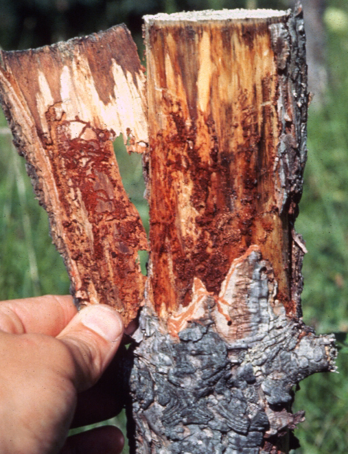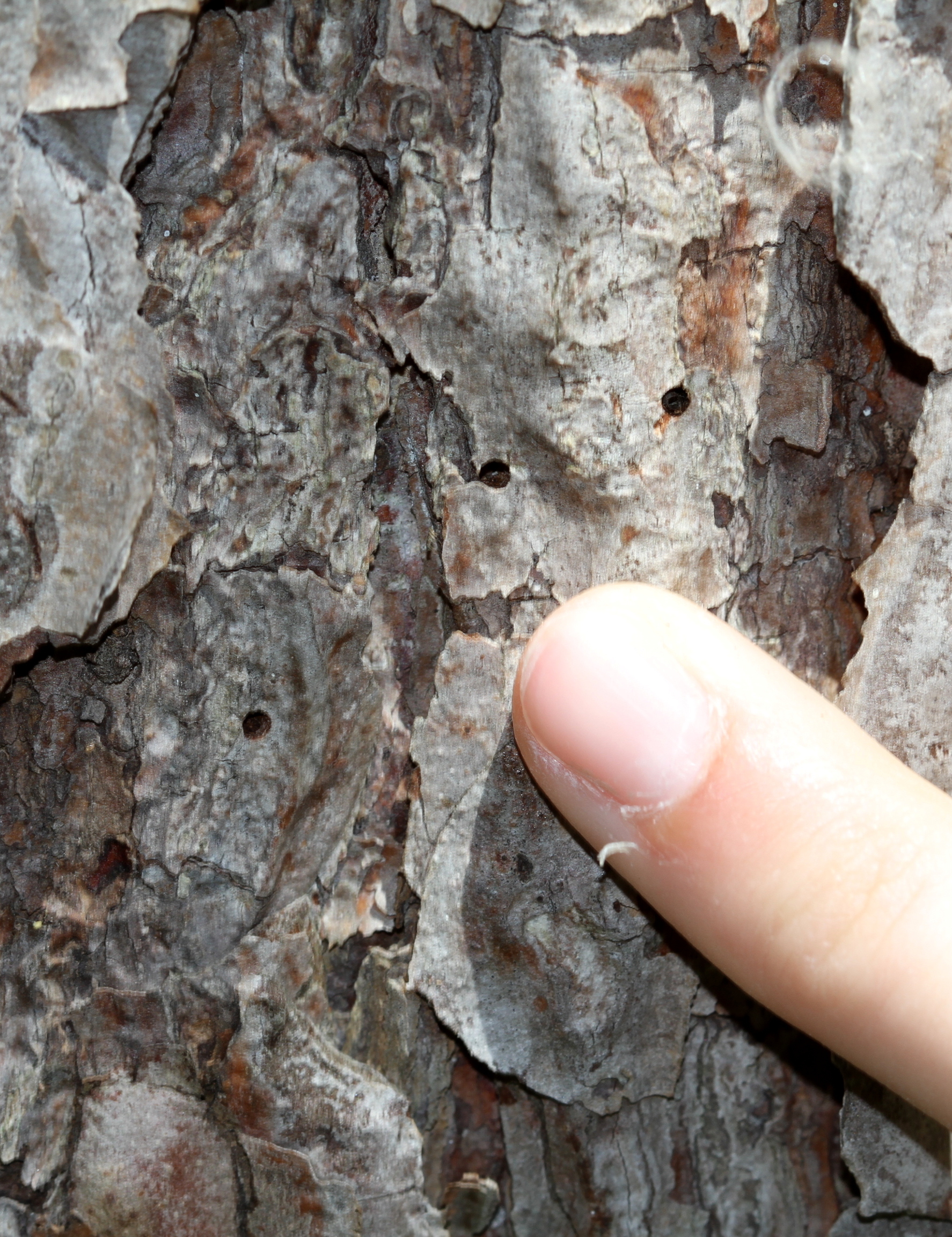 Limbs and entire trees turn brown, often from the top down. Large numbers of small holes (> 100 per 1 sq ft of bark) about as thick as a pencil lead are found along the main trunk and major limbs. Peel back bark to reveal engraved areas where larvae tunneled through cambium. Small, black beetles and white, legless larvae may be present. Although this beetle attacks only pines, it is representative of many other closely related bark beetles that attack conifers.