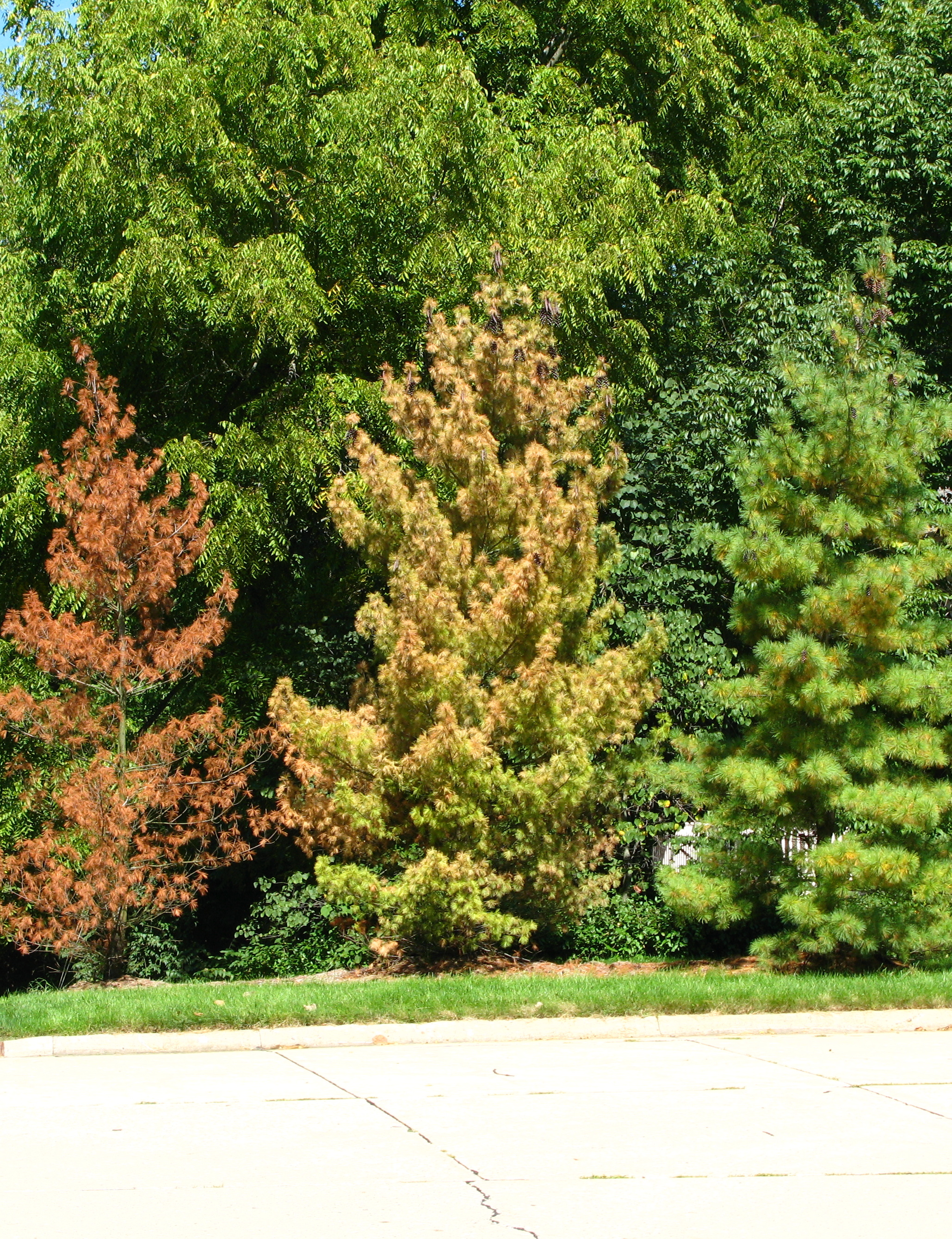 Borers tend to attack pine trees that are stressed due to lack of water. Be sure to water trees during a drought to keep trees strong. Sanitation, or the removal of heavily infested trees can greatly improve your ability to manage this pest. Be sure to destroy all wood prior to April 15 to reduce the number of beetles that may be available to attack nearby trees. Wood can be destroyed by burying at least a foot underground or by burning if allowed by local ordinances. Putting wood into local dumps away from your trees may be more practical. Apply insecticide to the trunk in mid April to kill beetles attempting to enter or leave remaining trees. Apply again late August. Soil applied systemic insecticides (imidacloprid) have been shown to reduce injury from this pest.
