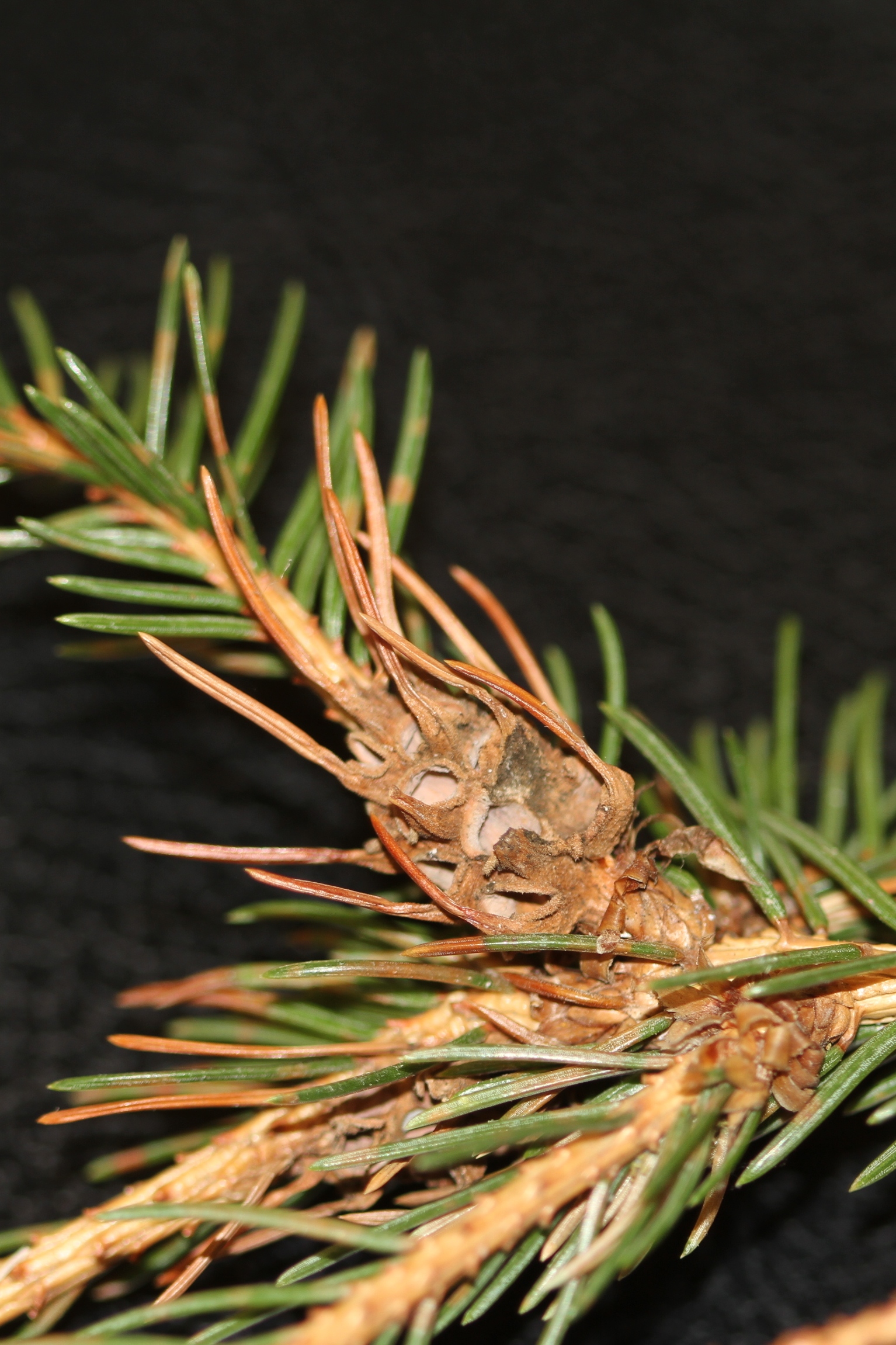 A pineapple-shaped gall (1/2 to 1 inch long) is produced at the base of the new shoot growth. Galls can't be removed without cutting twig. Heavy infestations can distort shoot appearance.