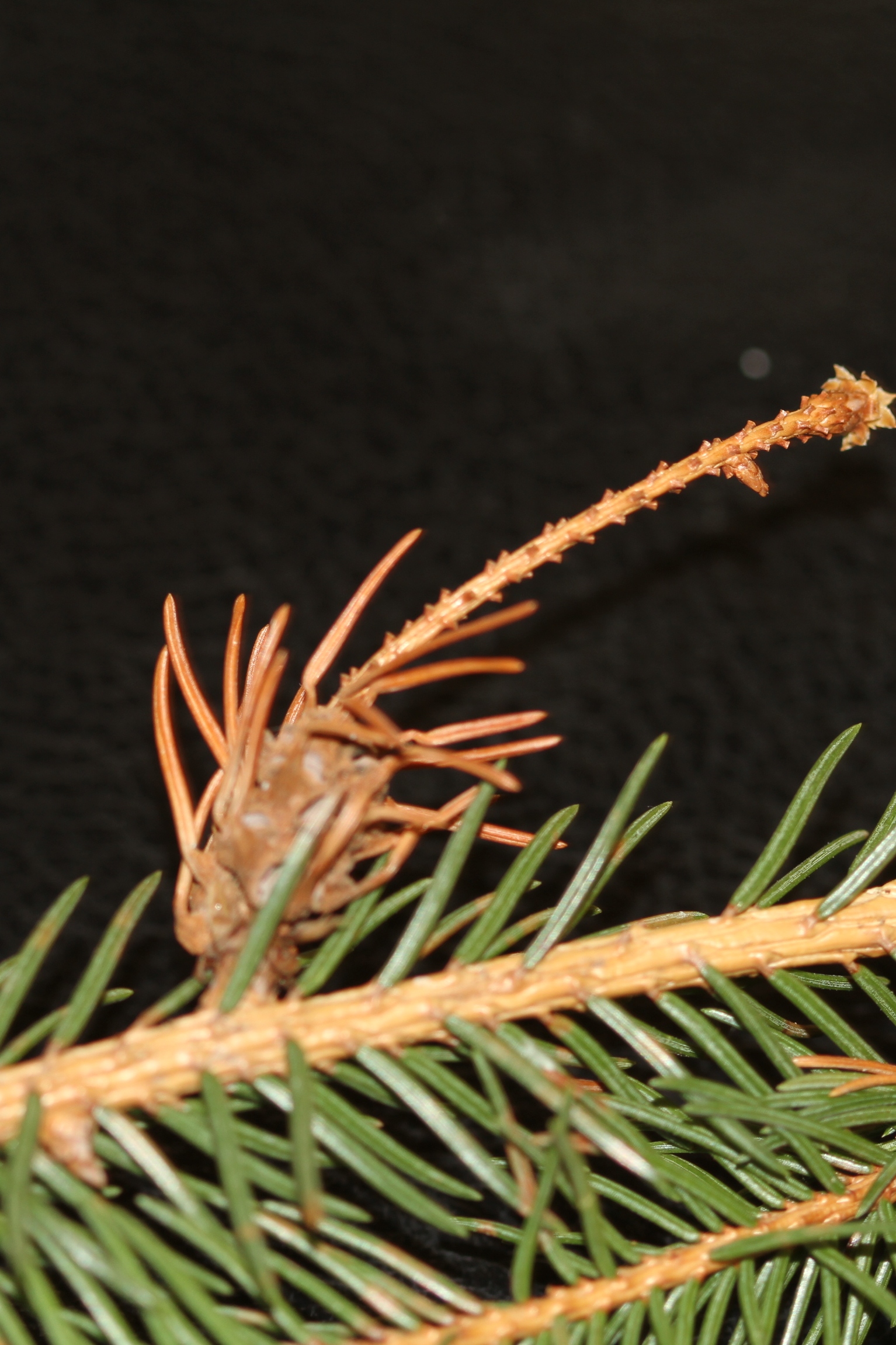 Usually, damage does not threaten plant heath, and can just be pruned off. Insecticides are rarely needed. To prevent new infestations, inspect plants for last year's galls in the dormant season to target plants that need treatment in the spring. Apply foliar insecticides to plants just after bud-break to kill nymphs that hatch from cottony egg masses at the base of needles. Soil applications of imidacloprid applied and dinotefuran in the fall are effective in preventing galls during the spring.