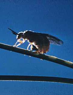 Sawflies are stingless wasps that lay eggs in leaf tissue with a saw-like tail. Adults emerge from the soil in the spring and lay eggs in needles. Eggs hatch into worm-like larvae in June and feed in groups on old and young needles. After larvae become about 1" long, larvae make brown bullet shaped cocoons (1/2" long) that can be found along the trunk or on the ground. They have one to 2 generations a year. The photo of feeding larvae was taken on September 24, 2001 in Indiana.