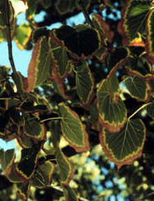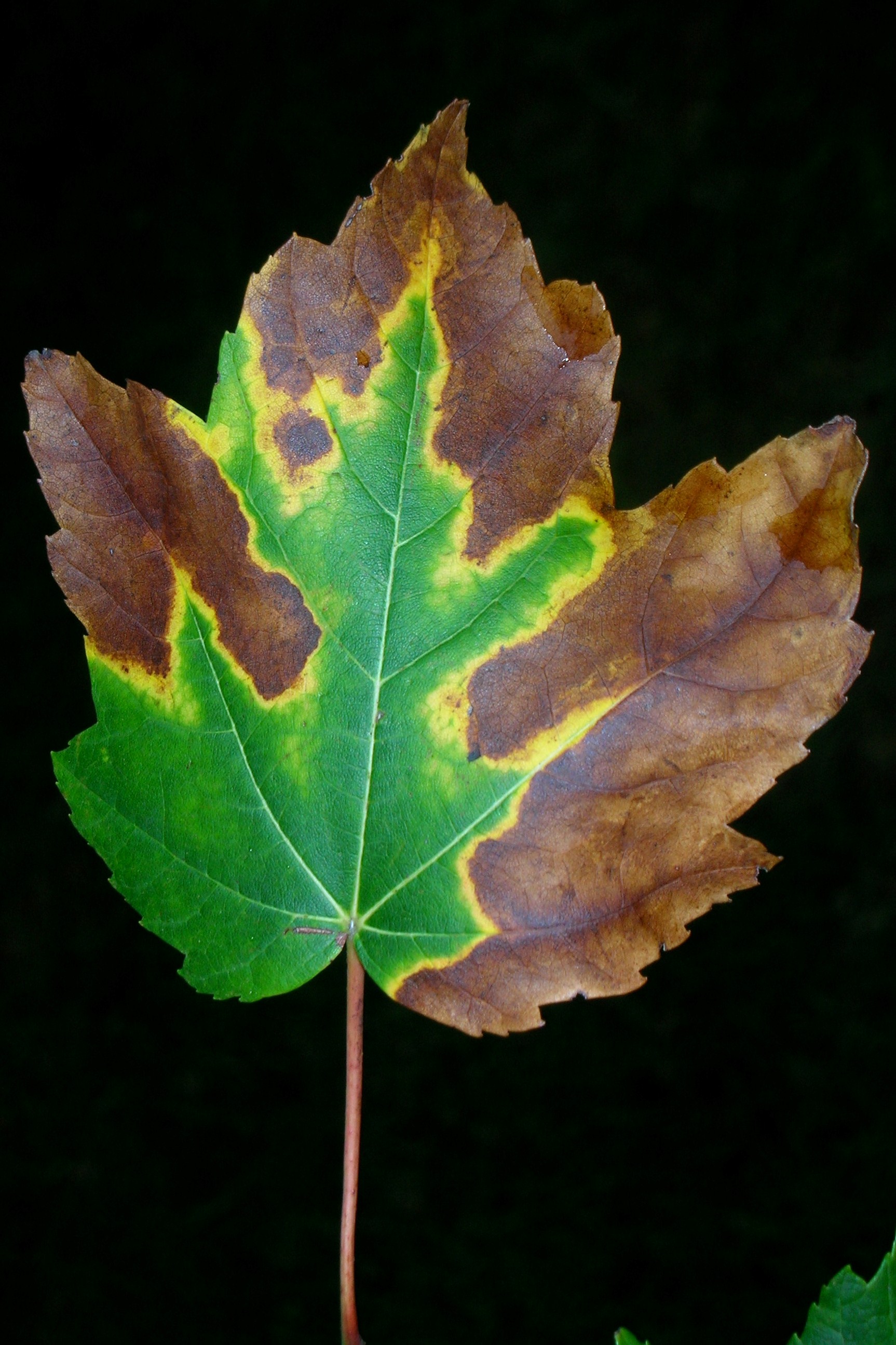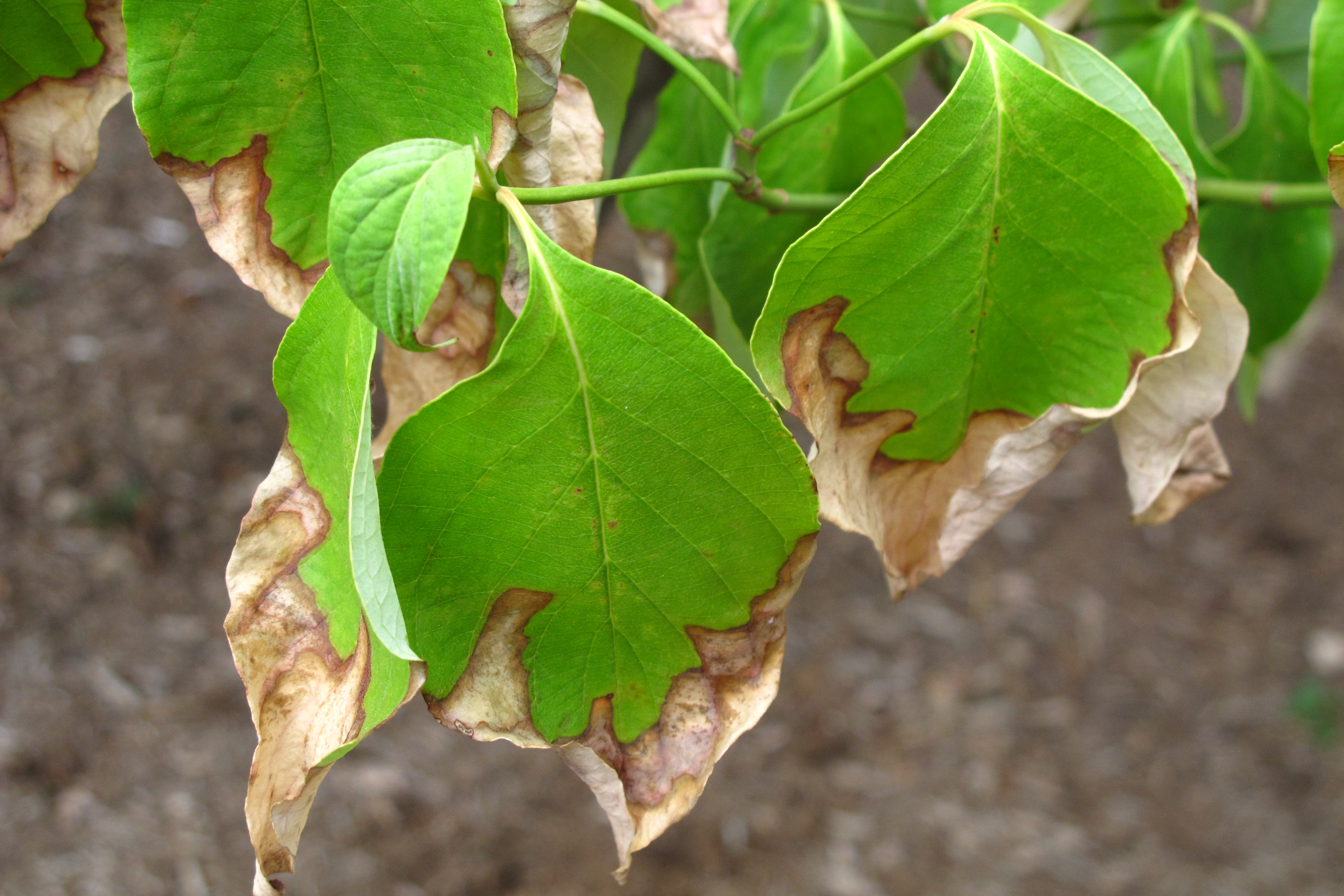 Bacterial leaf scorch is caused by the bacteria, Xylella fastidiosa. Leafhoppers carry the bacteria between shade trees and inject the pathogen into leaf veins. Bacteria move throughout the tree in the vascular system. As bacteria multiply, they clog the channels that carry water and nutrients. Leaf tissue becomes scorched when it dries out from a lack of water. Trees become less vigorous as more leaves are affected. Most trees die within a few years of infection.