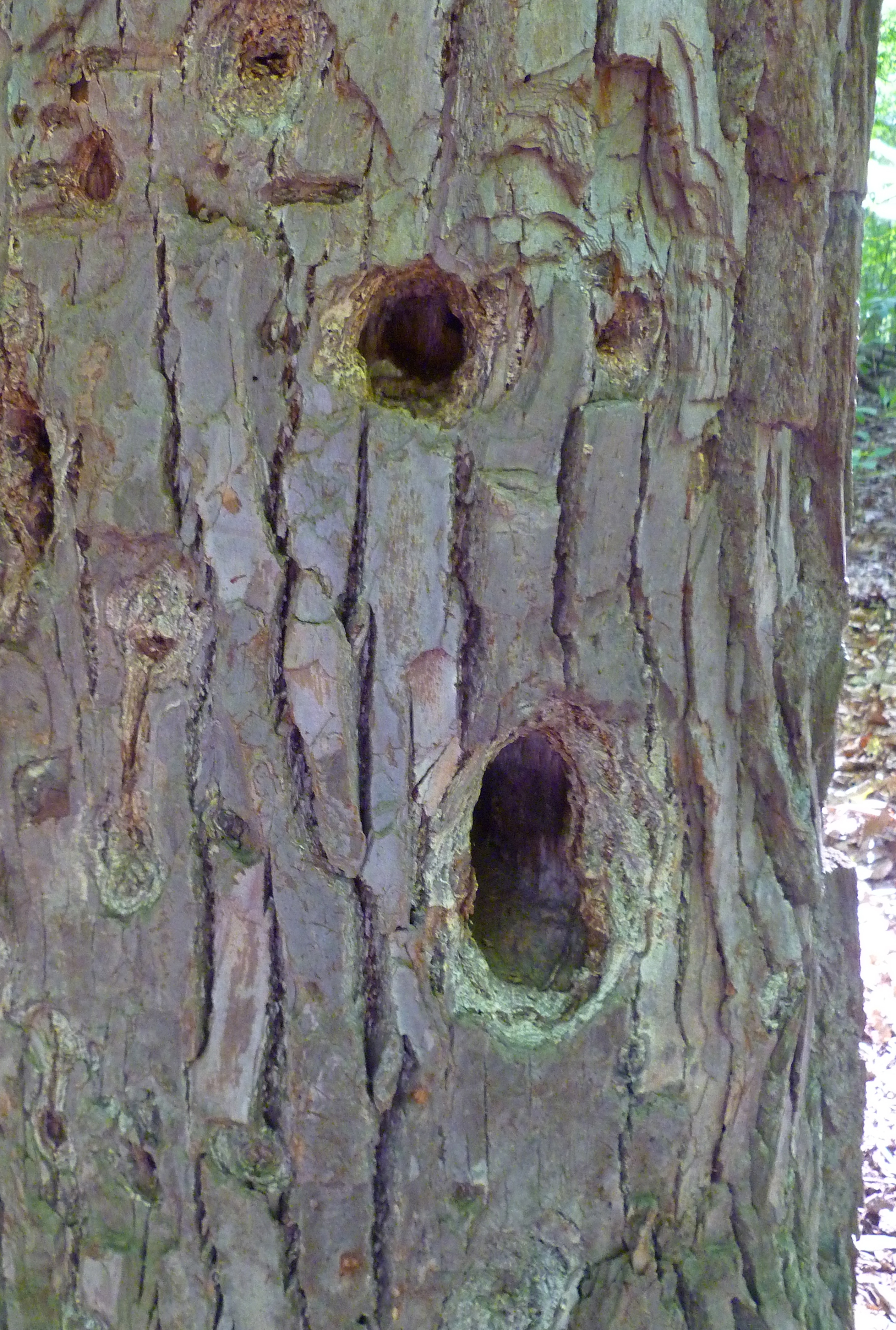 Animal feeding removes entire leaves, bunches of leaves, or sections of bark over the course of minutes to hours where it would take most diseases or swarms of insects days or weeks. Signs of the animals presences can accompany the damage; tufts or hair, footprints, feces, or even signs of "force" such as broken branches, antler scrapes, or teeth and claw marks can all help to identify the cause of the damage. The location of the damage can also help identify the culprit. Rodent damage will occur within 10 inches of the ground while deer browse and rubbing will not generally reach above 5 feet. Sapsuckers and woodpeckers feed primarily on stressed trees and branches that are infested with boring insects. Squirrel damage is most frequently observed on thin-barked branches that are large enough for the squirrel to comfortably sit on.