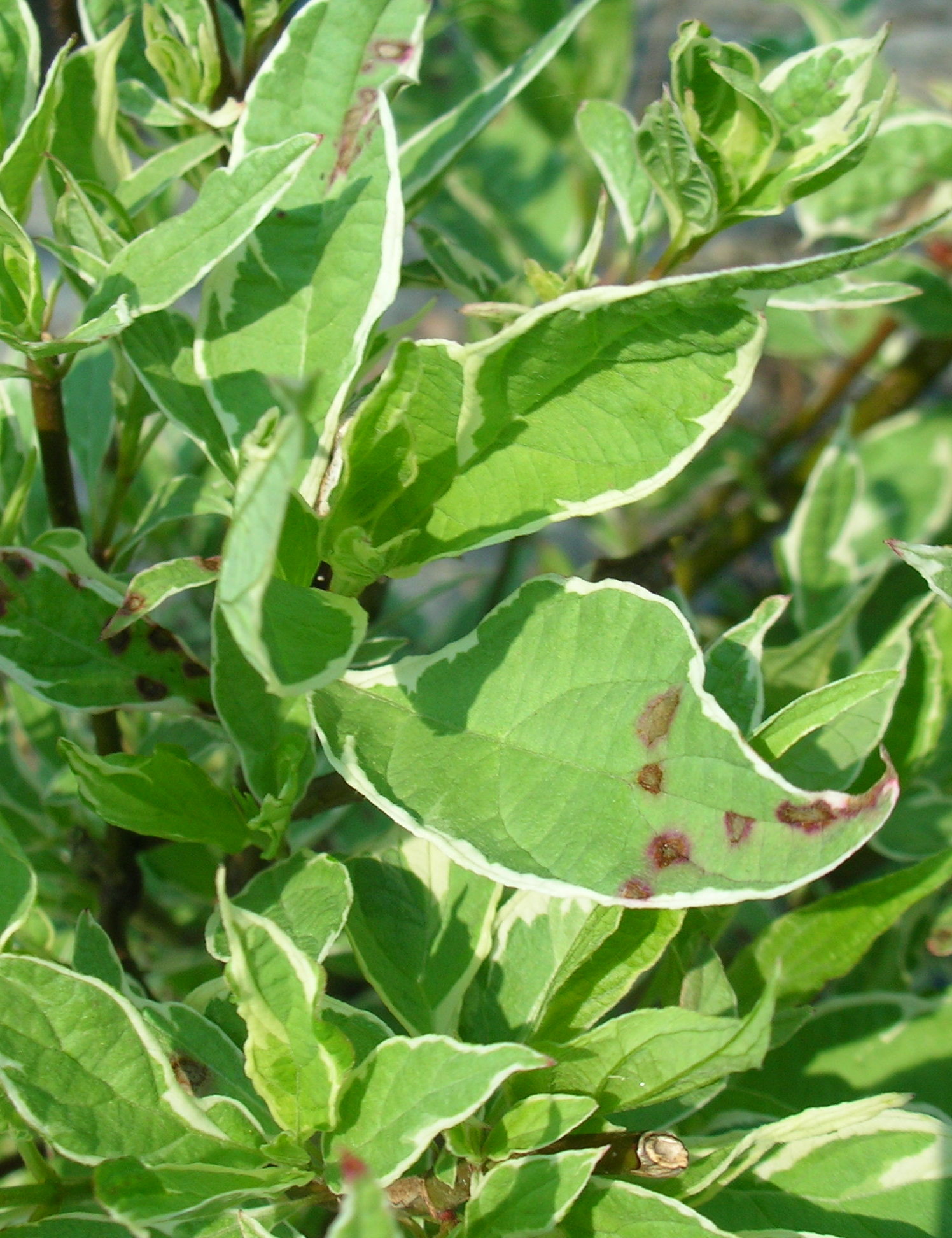 Septoria causes light brown to dark purple spots that begin on the upper surface of host leaves. These spots develop grey to tan centers with tiny black bumps. Severe infections may cause defoliation. Several years of defoliation may lead to a decrease in the number of leaves that emerge in following years. Cercospora leaf spots occur on flowering dogwood and Cornelian cherry (a dogwood), and produces angular, tan to reddish-brown spots.