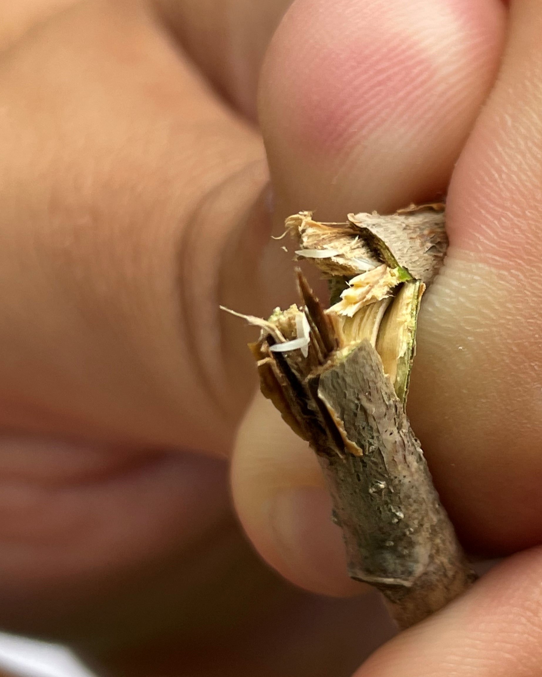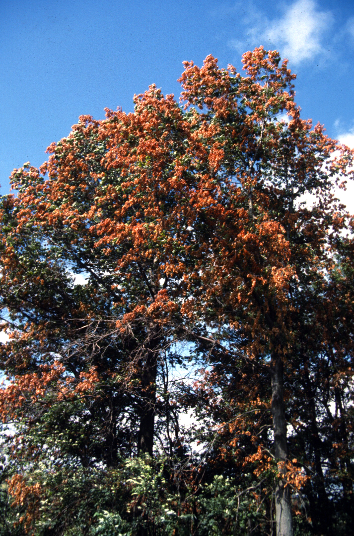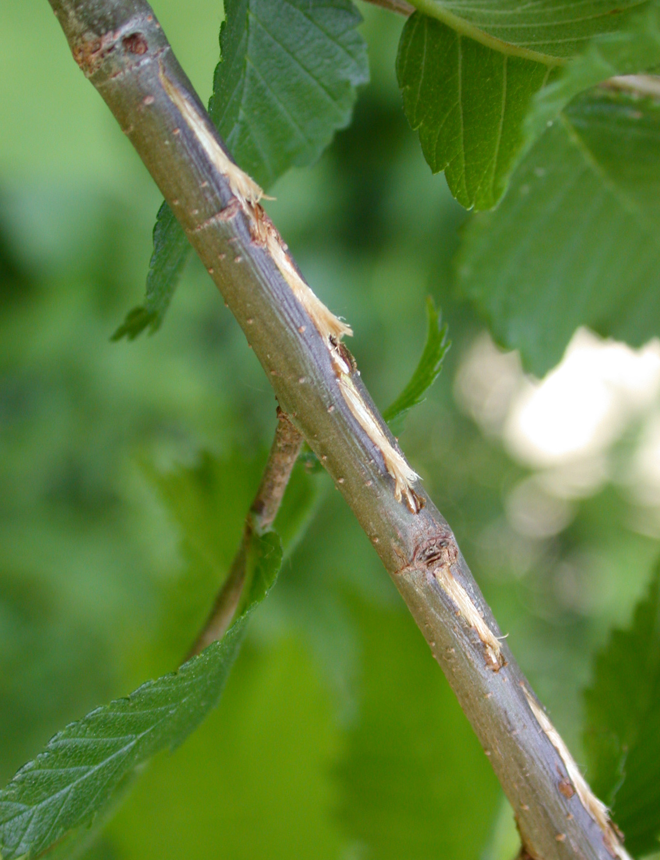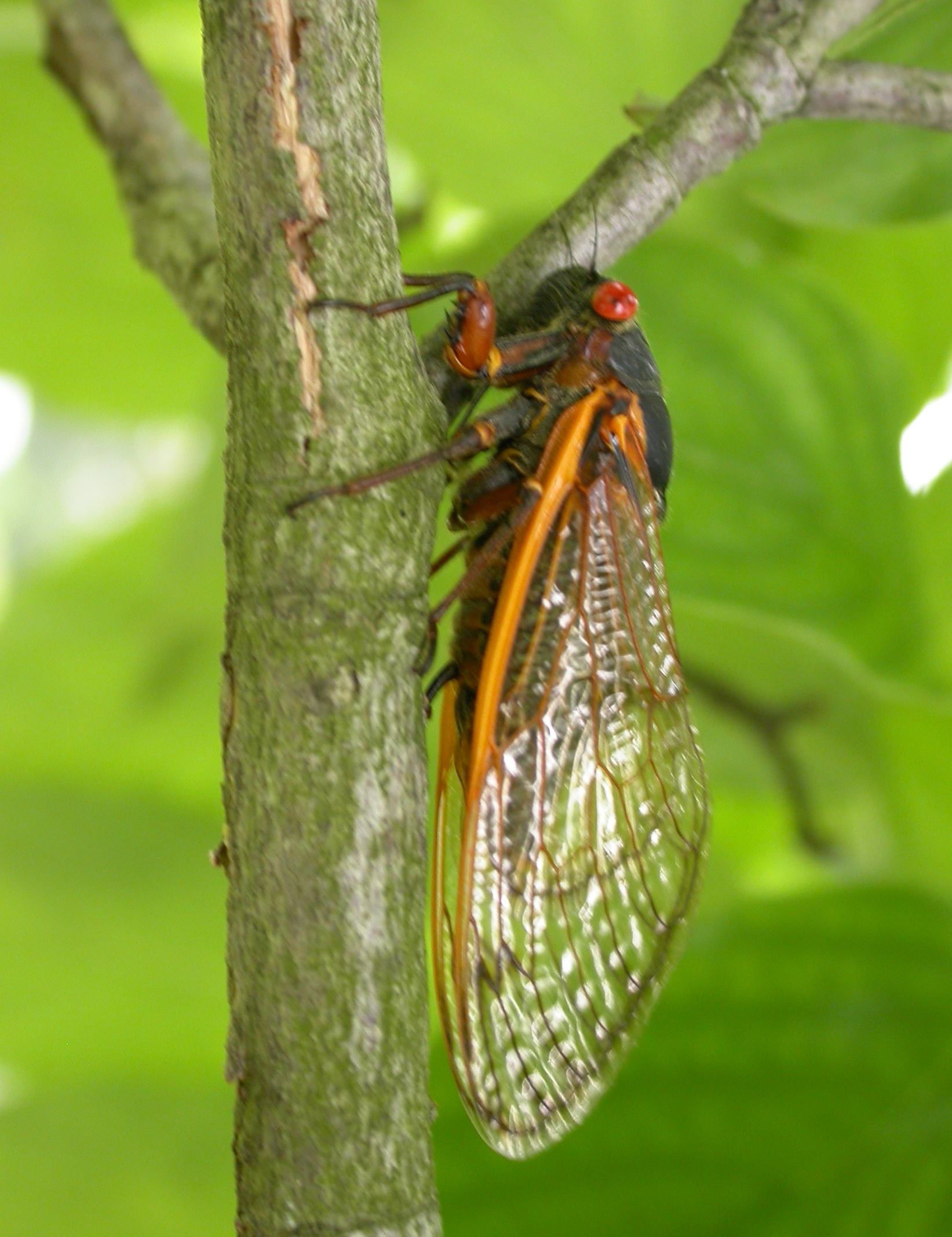 Female cicadas damage twigs when they puncture or slit them on trees and shrubs to lay their eggs. Susceptible twigs are between 3/16 and 7/16 of an inch in diameter. Infested branches appear as if the eggs have been stitched in by a sewing machine. These branches will turn brown, die, and sometimes break off. Female cicadas have been reported to lay eggs on over 200 deciduous woody tree species and are common on oak, hickory, flowering fruit trees, mountain ash, and grape. The black bodies, red eyes and wings of the periodical cicada distinguish them from from the less damaging annual cicada.