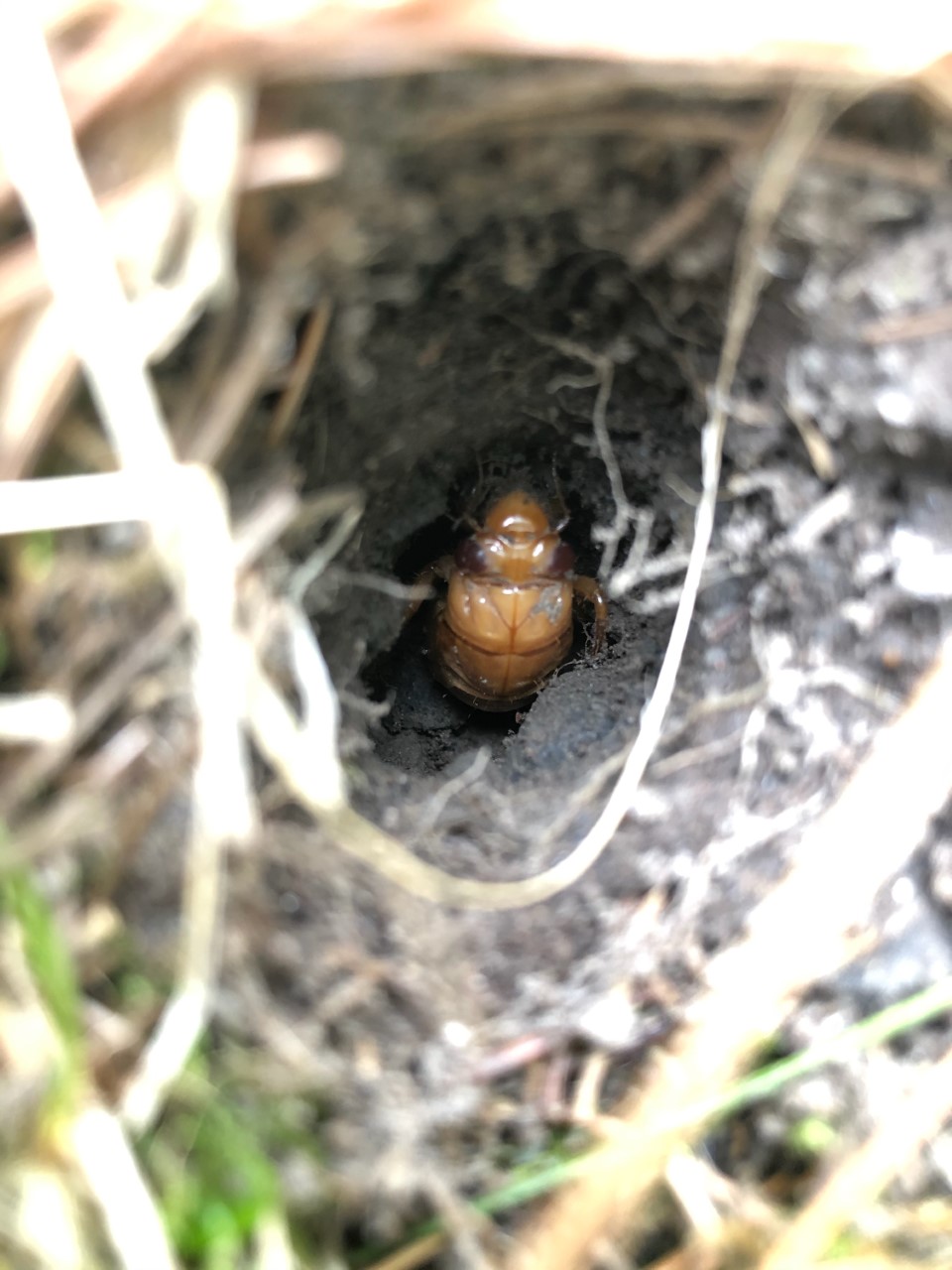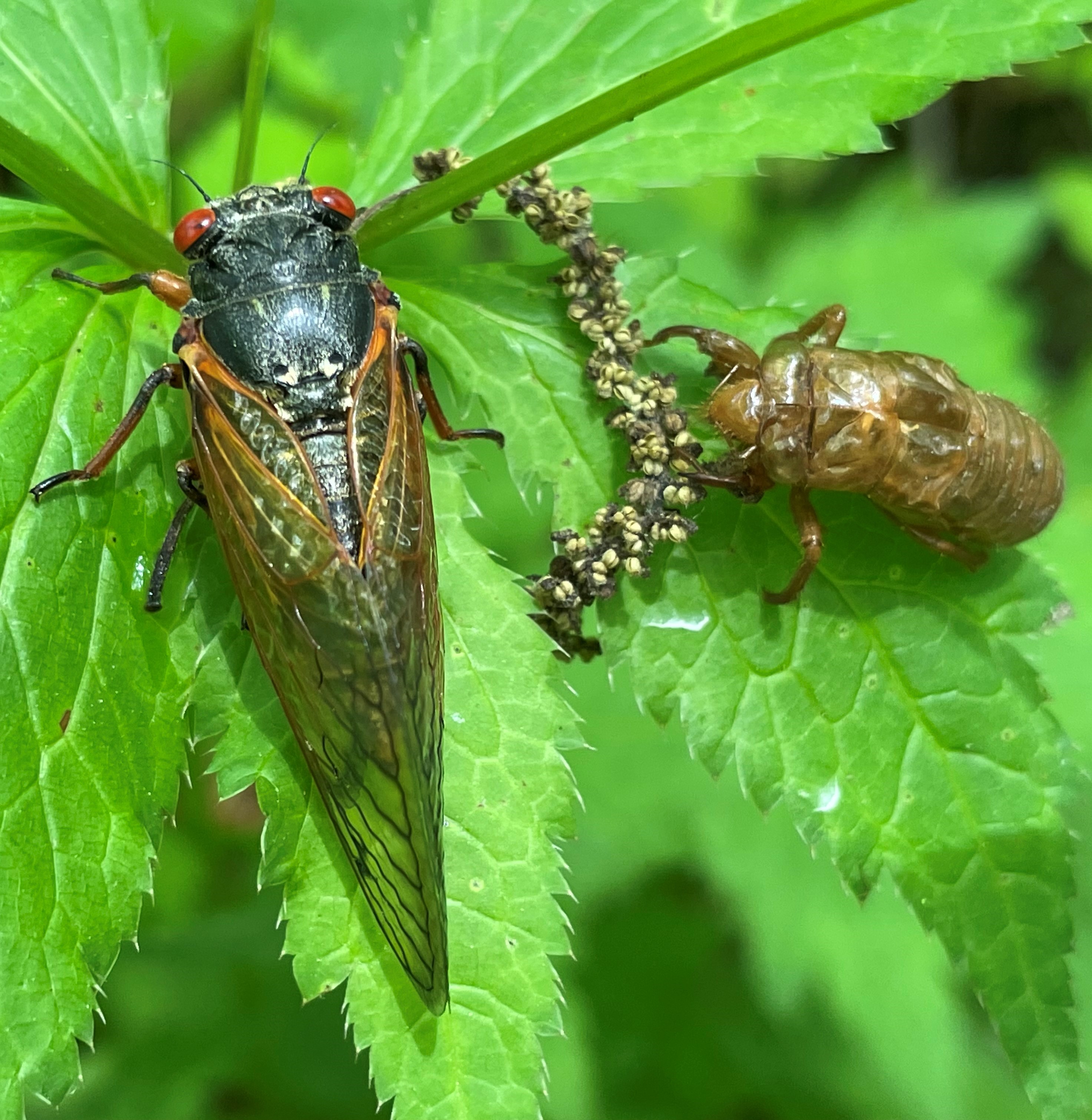They appear in the last part of May and during June. The incessant cadence of high-pitched, shrill sounds announces their presence. Very large numbers of wingless insects emerge from the ground and crawl to find a place to shed their skin and become an adult that lives for one month. During this time they mate, and each female lays 400-600 eggs. Cicadas are abundant only in areas where trees harbored the eggs of the previous generation. After mating, adult females lay eggs in twigs. Eggs hatch into wingless immatures that drop from the tree to burrow into the ground where they feed for the next 13 or 17 years.