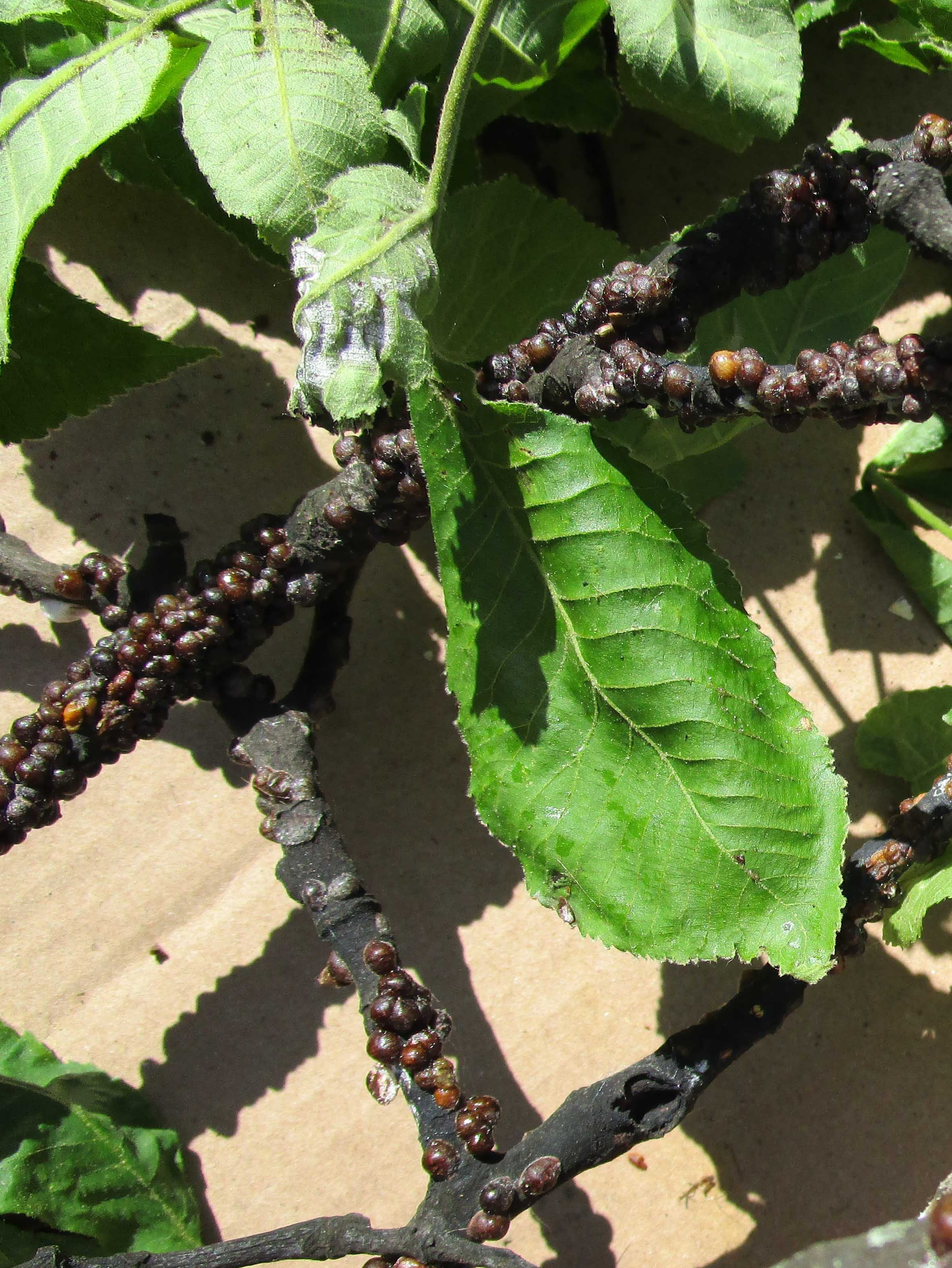 Trees infested with lecanium scales become covered with a sticky liquid excrement called honeydew. Heavy infestations can kill branches. Scales produce a sticky excrement called honeydew than can coat leaves and branches, turning them black with an unsightly sooty mold. The excrement also becomes a nuisance in the summer when they attract stinging wasps. Lecanium scales are dark brown in color. All stages of this scale can be separated from the plant tissue by flipping them over with a fingernail without ripping the plant surface. If you remove a bump on a plant and the tissue rips, this means the plant has produced a gall or swelling in response to an insect or disease.