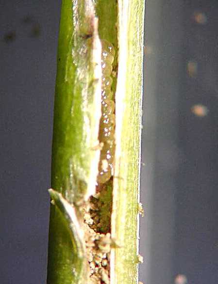 Adults emerge from the soil in late spring to lay single eggs into each leaf stem (petiole). The egg hatches into cream colored, wormlike larva that tunnels through the petiole. After the leaf drops the larva completes its feeding and bores into the ground to enter the transition stage (pupae) in which it spends the winter. These insects have only one generation per year.