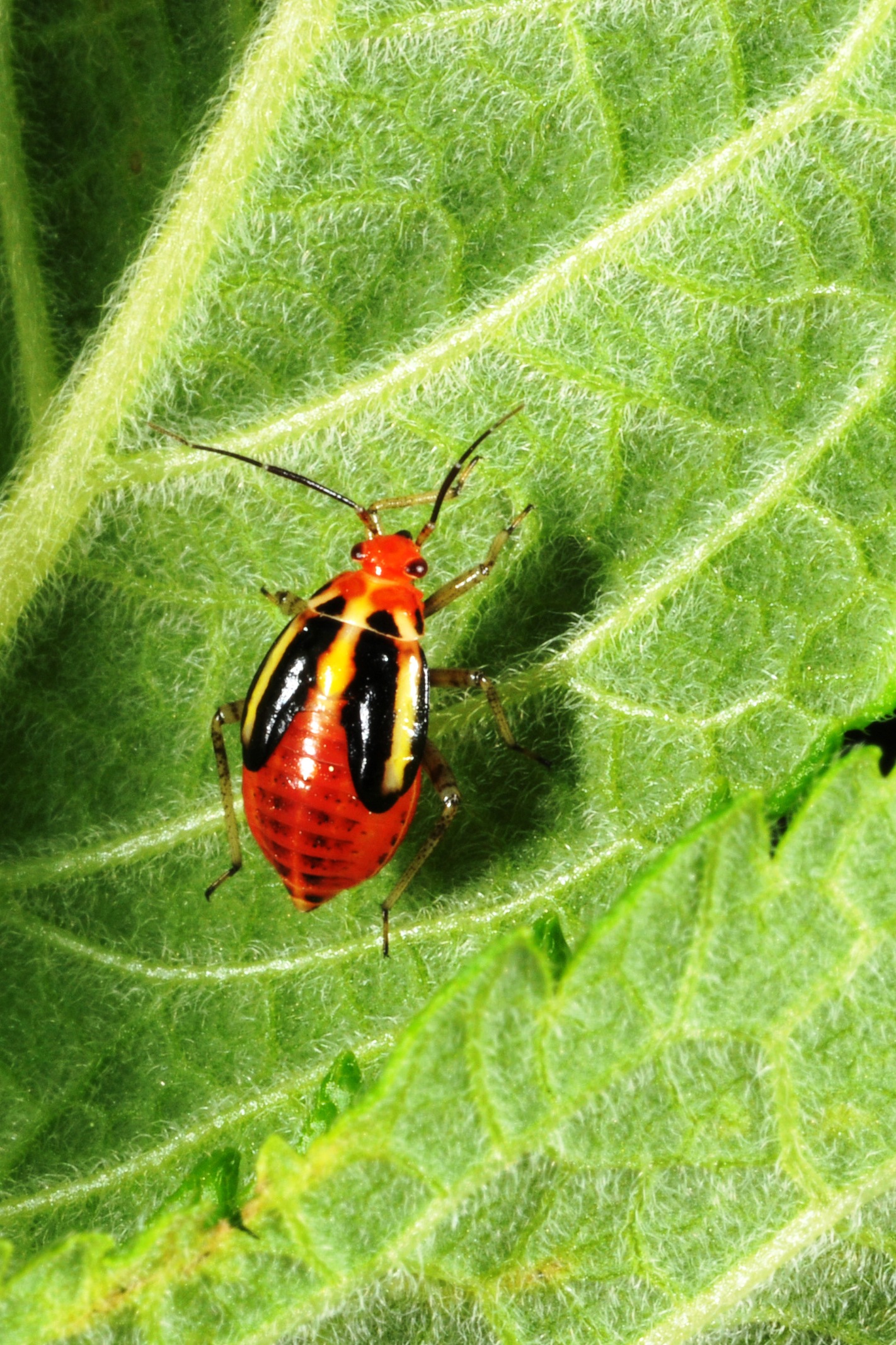 Adults are yellow and black whereas nymphs superficially resemble adults, but are more orange in color. Damaged leaves will have sunken, round spots and be distorted. Spots are dark colored that fade to a lighter color and often fall out after a few weeks leaving holes. This type of damage can be distinguished from leaf spot disease by assessing the shape and size of the spots. Four-lined plant bugs make distinct circular spots each time they feed on the leaf surface.