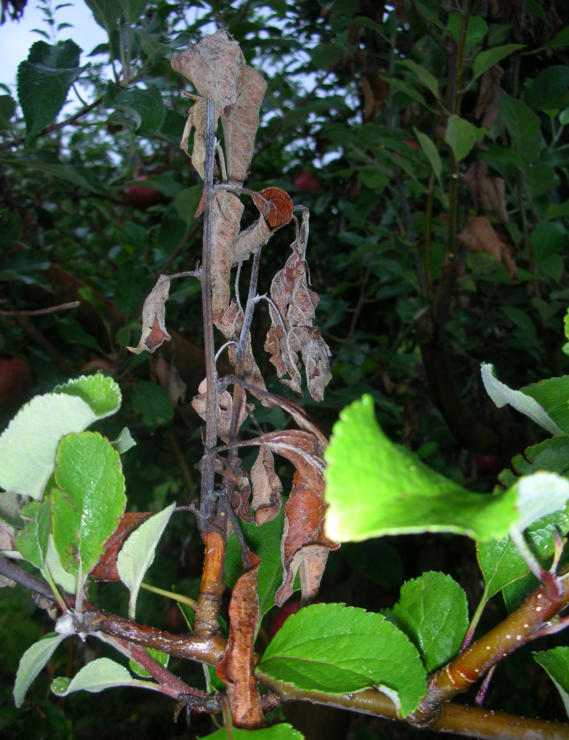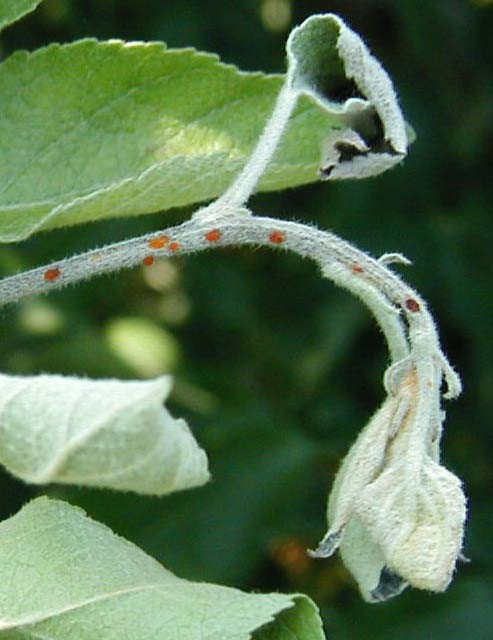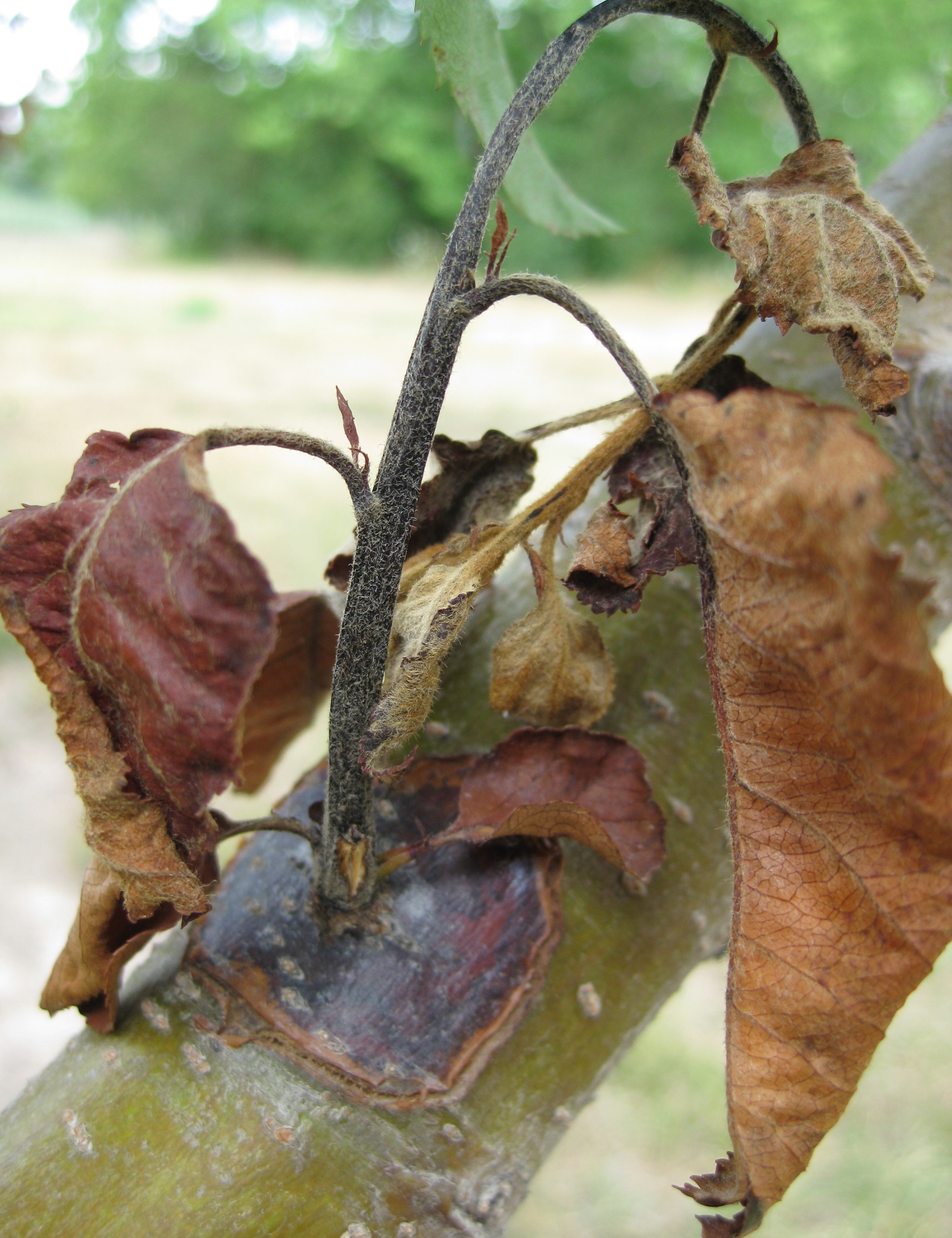 The name "fire blight" comes from the blackened leaves that are characteristic of infections. After infection, blossoms wilt and turn brown. The tips of affected branches curl downward in a 'shepherds crook.' This shoot blight develops into cankers, that are are dark, sunken areas on a stem, often with cracked or peeling bark. Droplets of bacteria ooze form on the surface of infected branches or fruit. Leaves on affected branches turn deep brown or black and remain on the branch. Flowers wilt and turn brown while fruit shrivel. Shriveled fruit will remain on the plant well into the fall and winter.