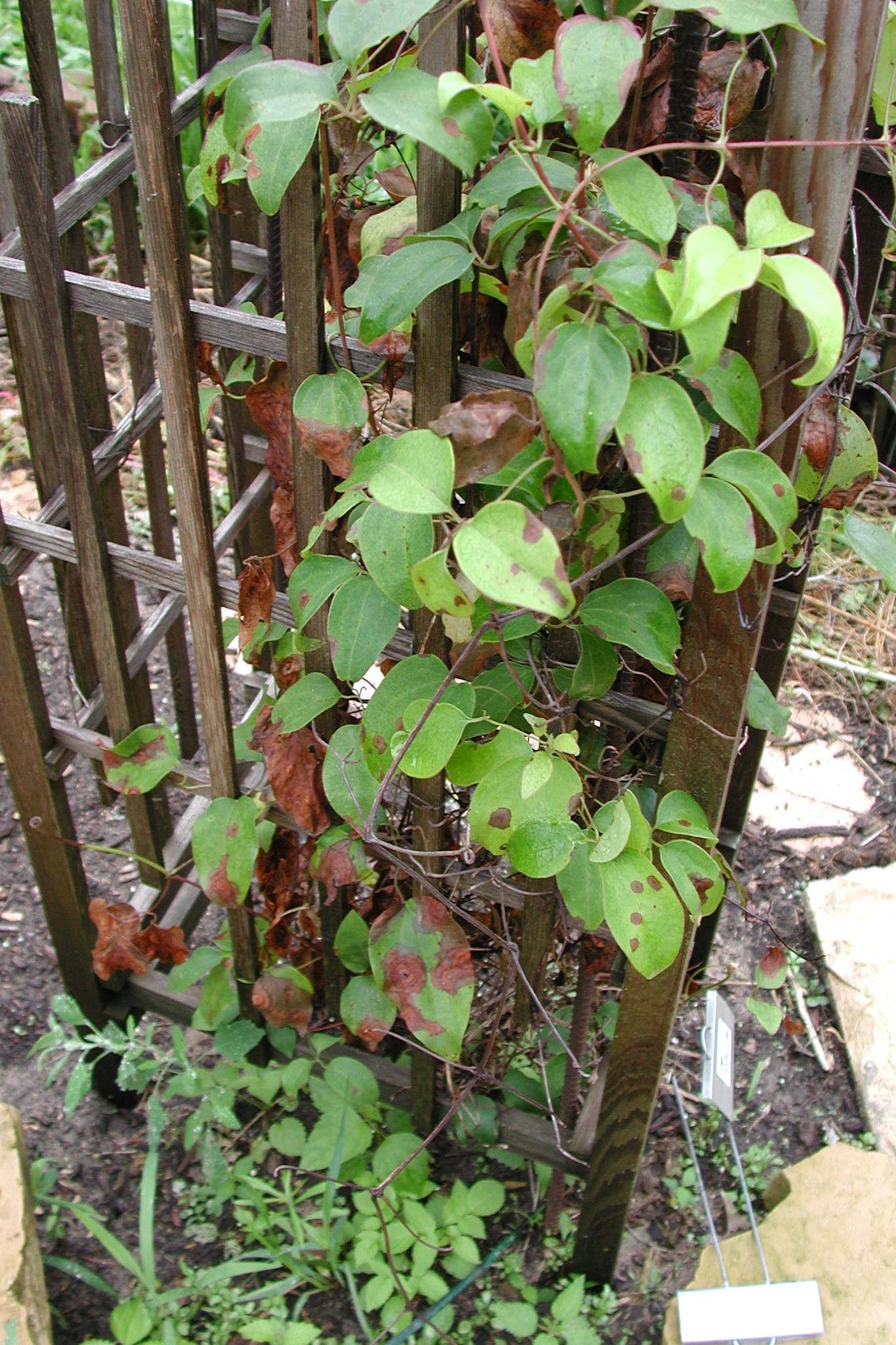 Improve air movement and speed up drying of leaves by thinning the plant. Prune out and destroy infected vines to reduce inoculum. As this is a foliar pathogen, removing the vines at the end of the season, will reduce the disease. It may cause a reduction of flowering of those varieties that bloom on old wood, so it may take two years for a vine to return to its former appearance.