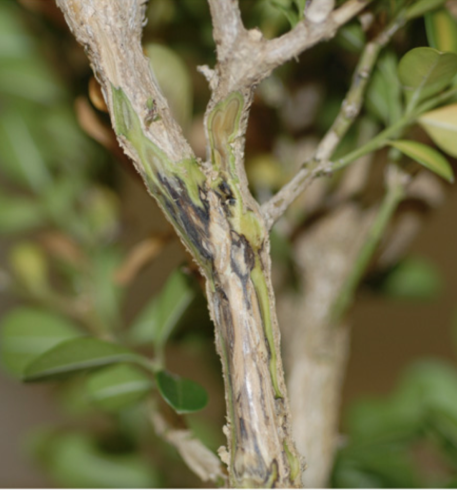 Boxwood decline results in random twig dieback, with the foliage remaining attached to the affected branches. Bright black staining occurs under the bark and is present in infected stems.