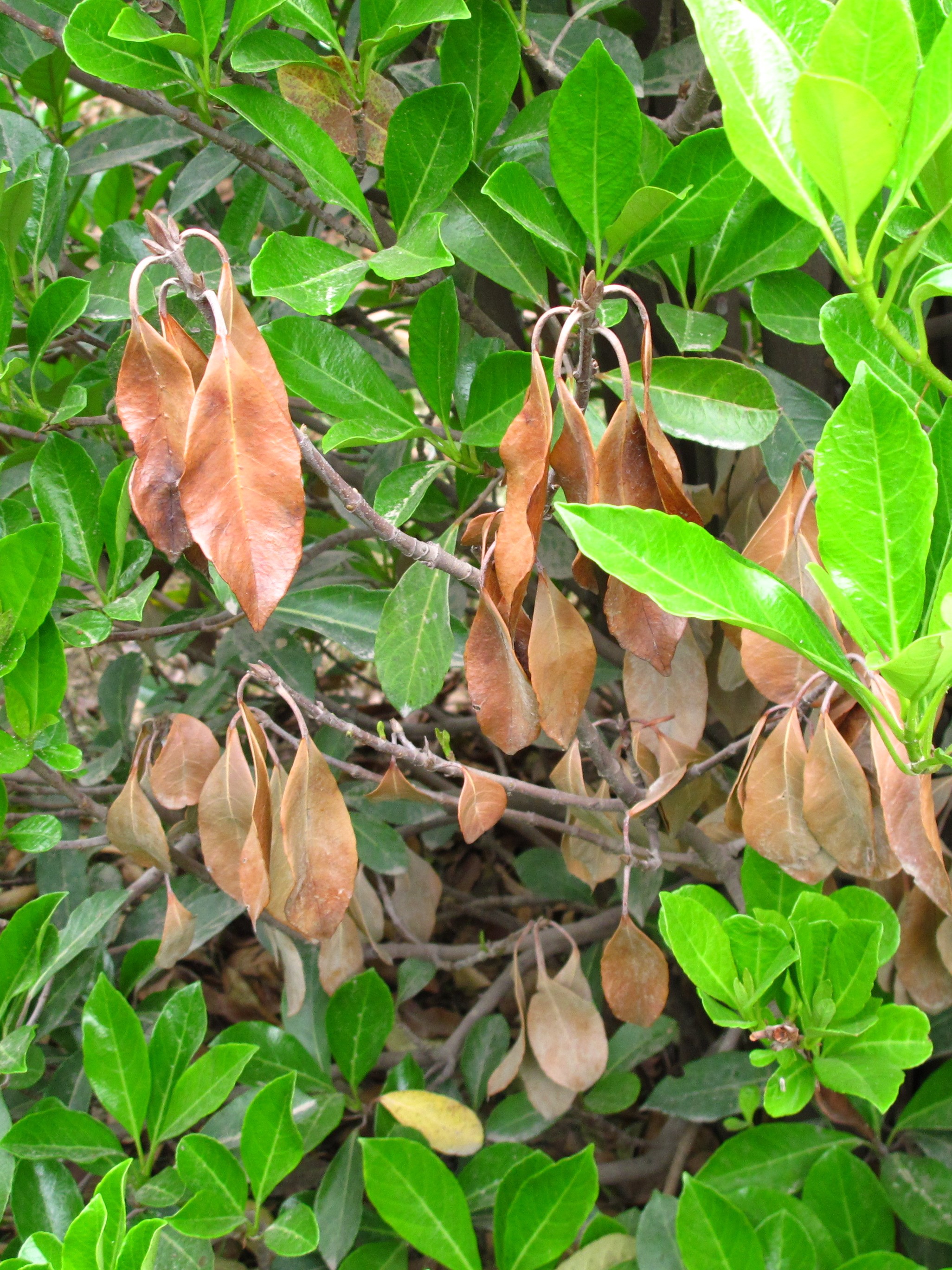 Phytophthora is a group of soil-borne fungus-like plant pathogens that cause disease on many host species. Only a few generalizations can be made about symptom development. Foliar infections result in greenish brown sunken spots on leaves. These spots can progress back the leaf and form a reddish-brown sunken canker on stem tips. Leaves on affected branches wilt and turn brown. Blight progresses slowly resulting in multiple years of dieback if untreated. When viewed from a distance, symptoms can range from a few darkened branch tips to entire dead branches. Conditions that permit Phytophthora blight also favor Phytophthora root and crown rot.