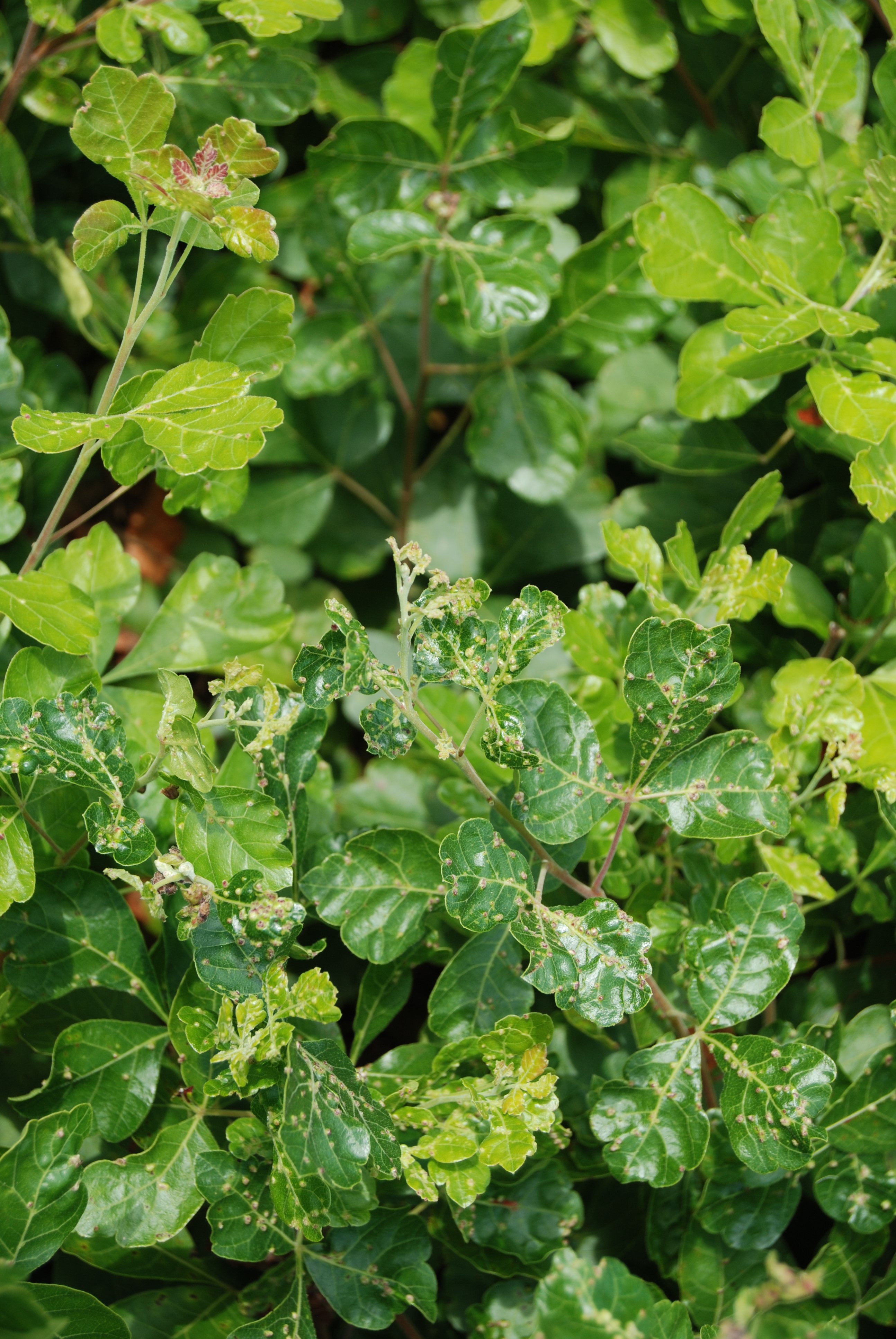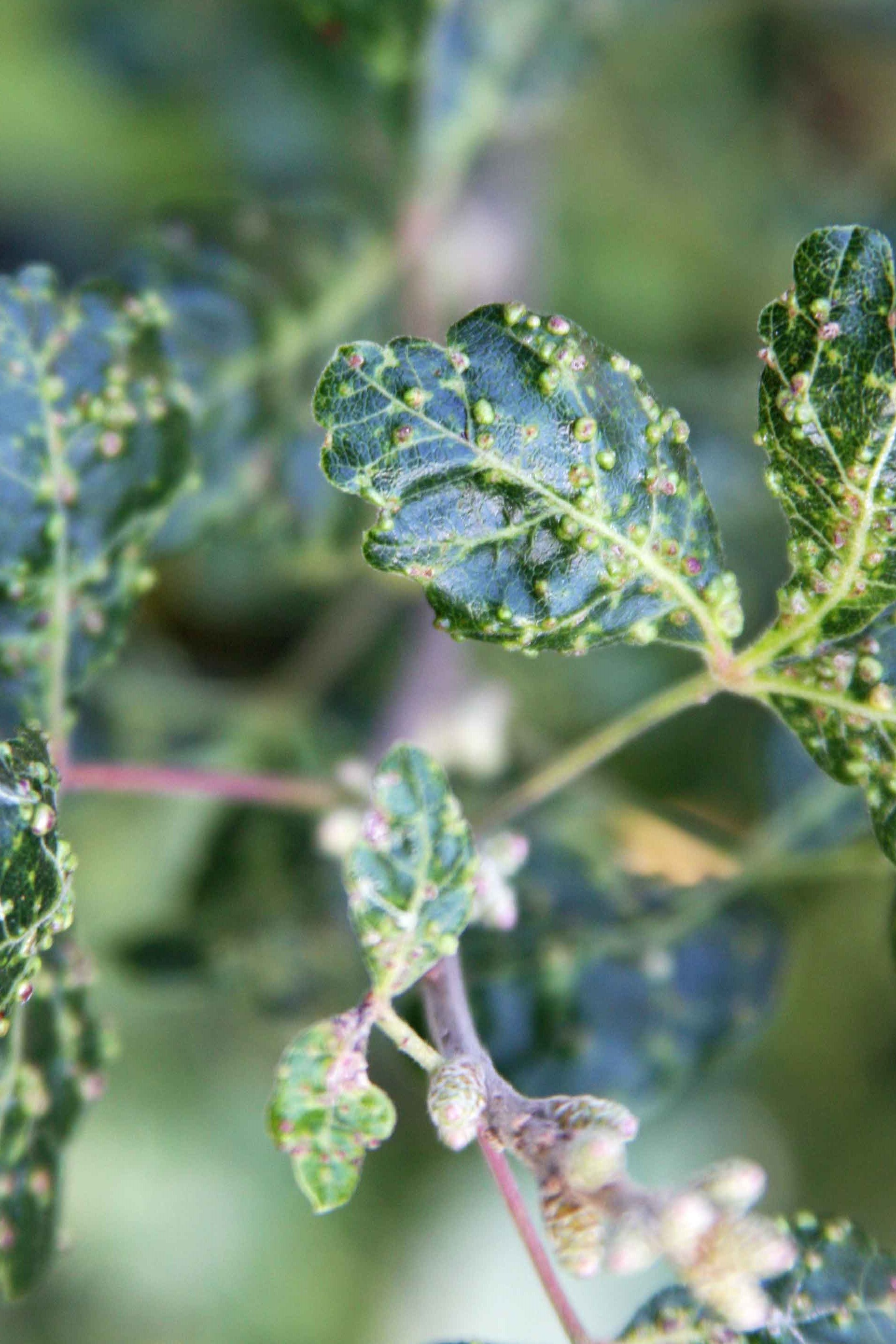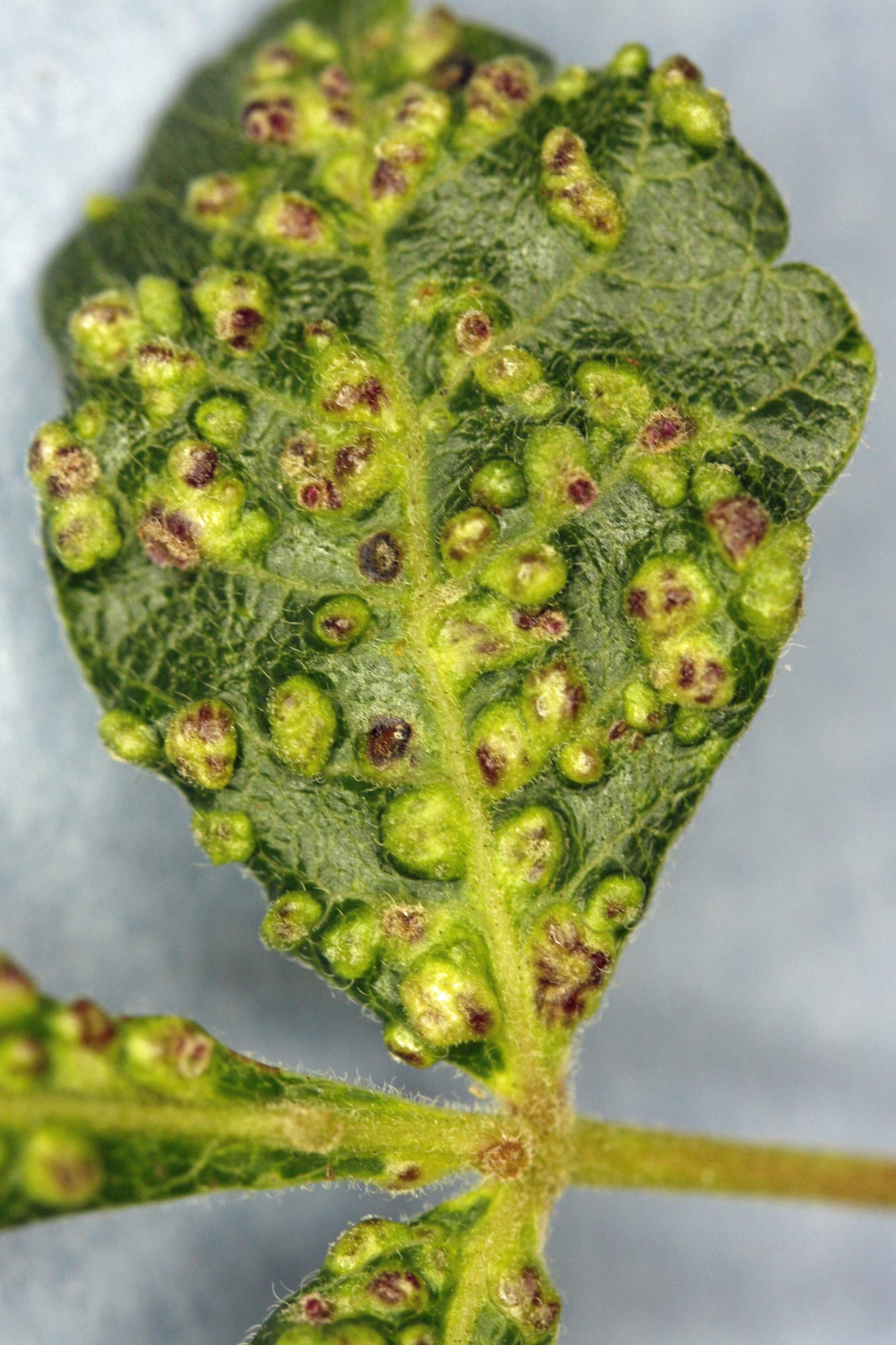Small wart like growth on the upper and lower leaf surfaces. Bumps start out green in early season, turning brownish black by the end of the season. Although galls rarely affect plant health, new leaves and new growth will be distorted in heavy infestations.
