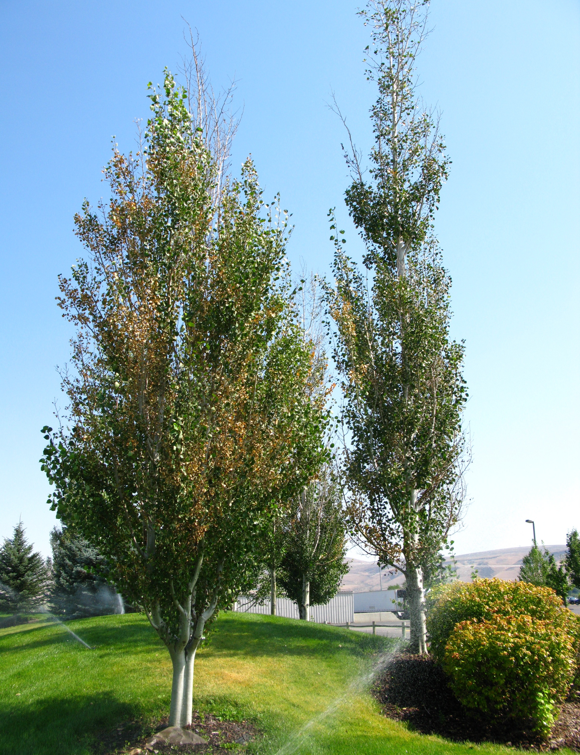 Replace susceptible trees with resistant species or varieties in locations with repeated, heavy infections. Pruning out cankered stems and destroying infected leaf litter after fall leaf drop are the most effective controls for this disease. Maintaining plant health through irrigation and proper fertilization are often enough to promote healthy growth even in the presence of the disease. Irrigating landscapes in the morning will allow leaves to dry throughout the day. Dense plantings of susceptible trees may be thinned to slow the disease. Chlorothalonil is labeled for the control of Marssonina leaf spot. Always follow the instructions on the product label. With large trees, pruning cankered branches and treating with fungicides is not always feasible or safe.