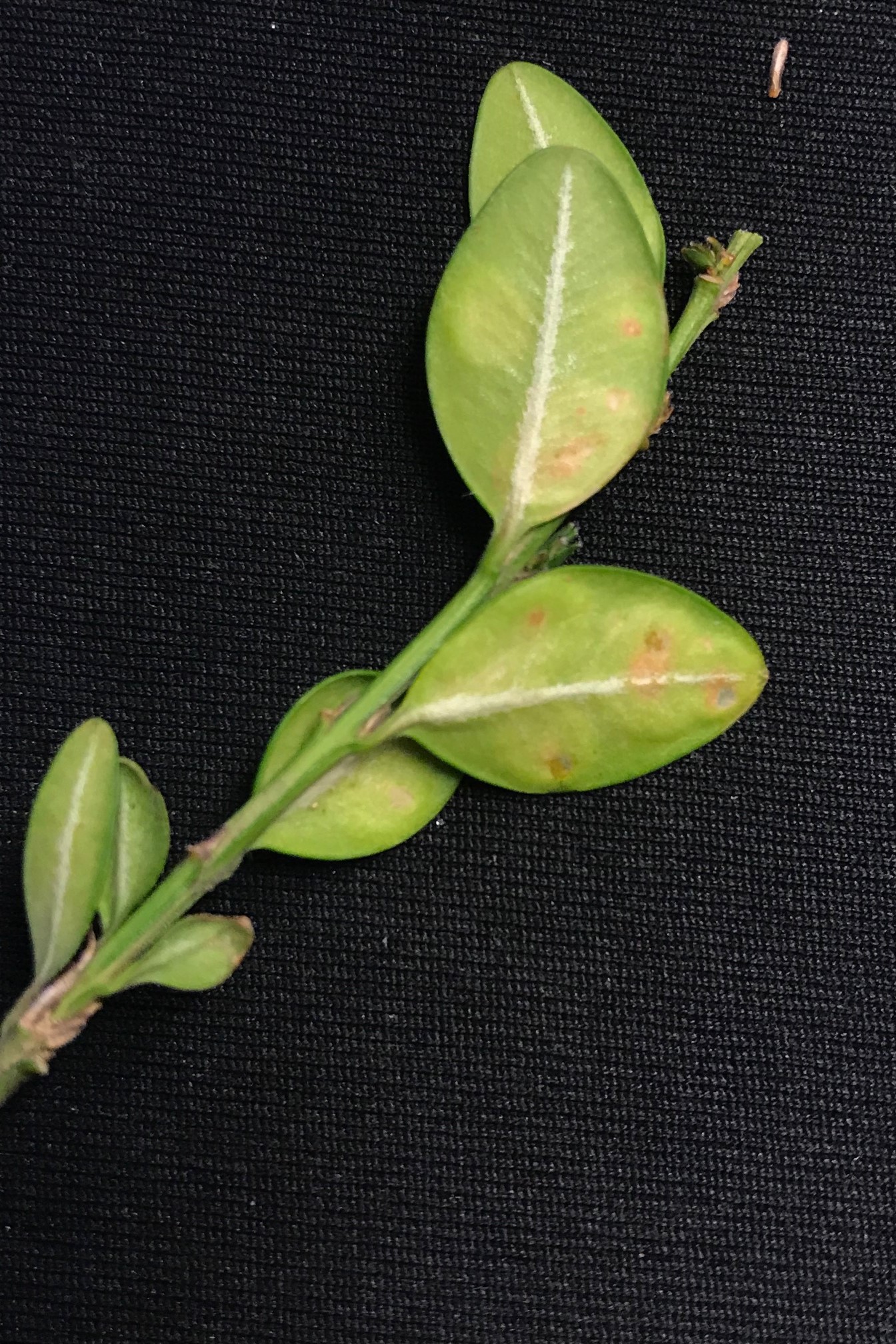 Heavy infestations of boxwood leafminer can defoliate boxwoods by fall and render them unsightly. In late summer and spring mined leaves appear as yellow halos on upper leaf surfaces. Undersides of leaf mines are bumpy to the touch. When mines are cut open in spring orange maggots will be beneath the surface.