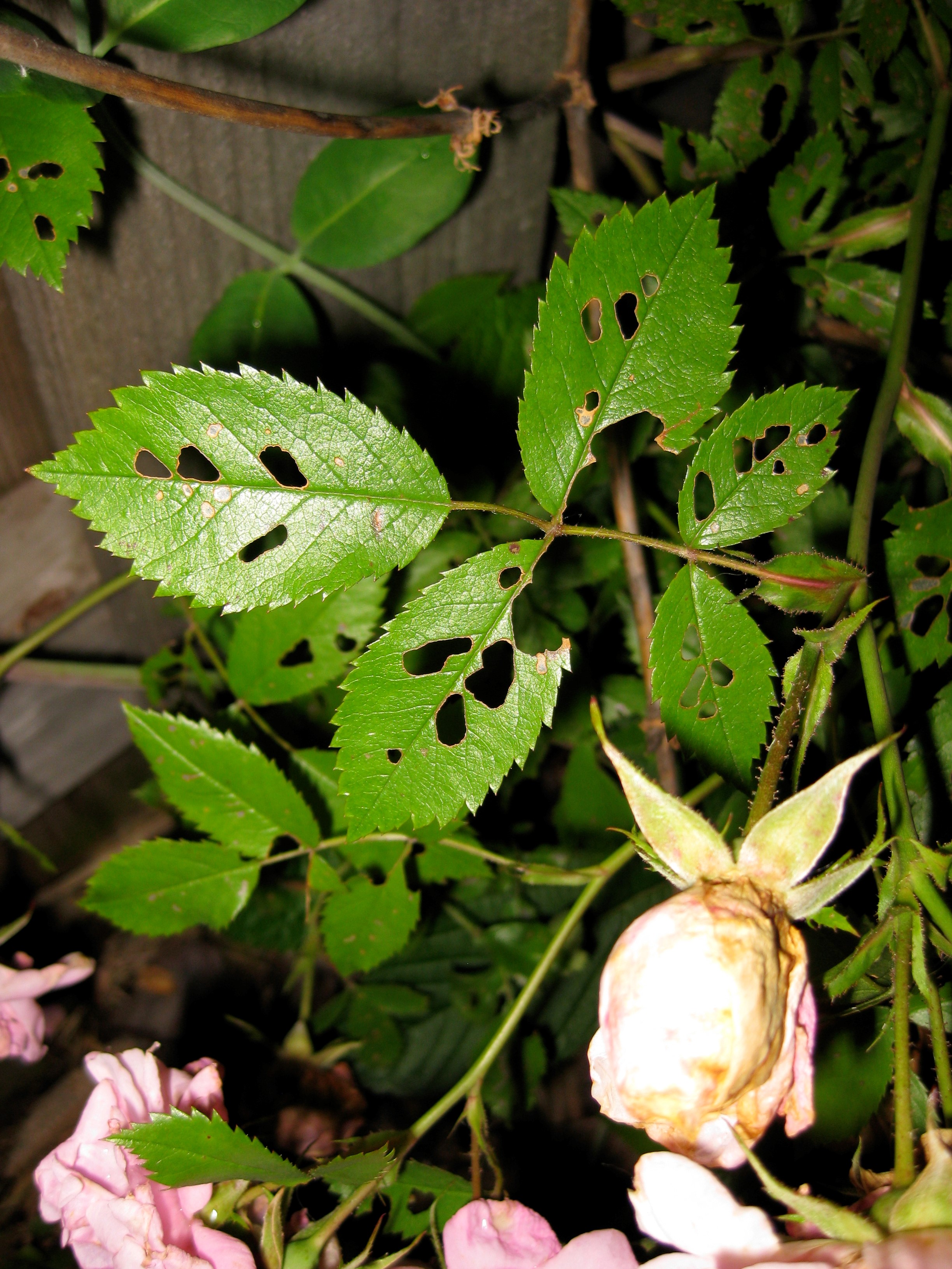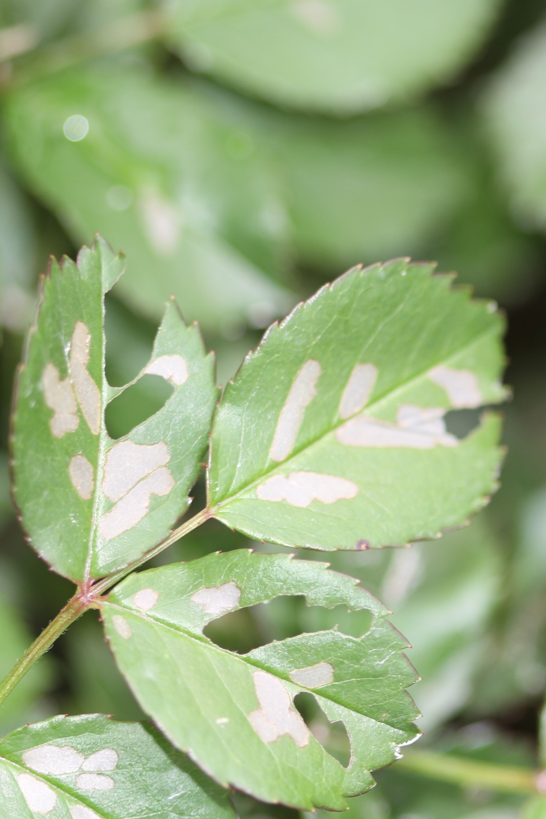 Rose sawflies chew and scrape rose leaves between leaf veins as larvae. Heavy infestations can be unsightly and result in leaf drop.