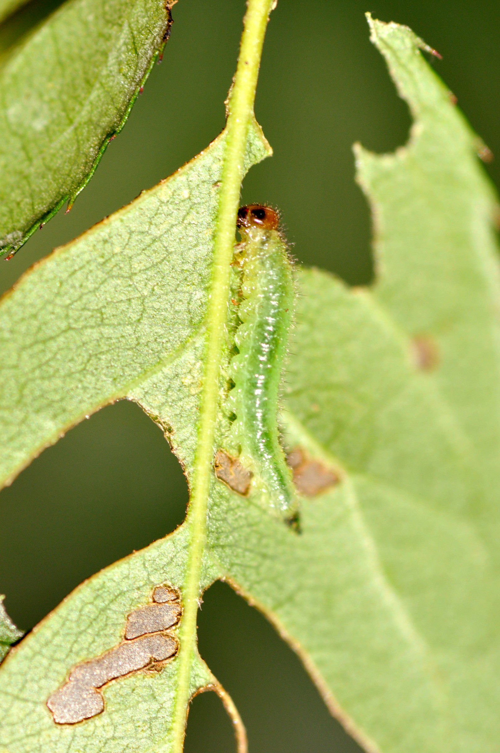 - Small green larvae under leaves