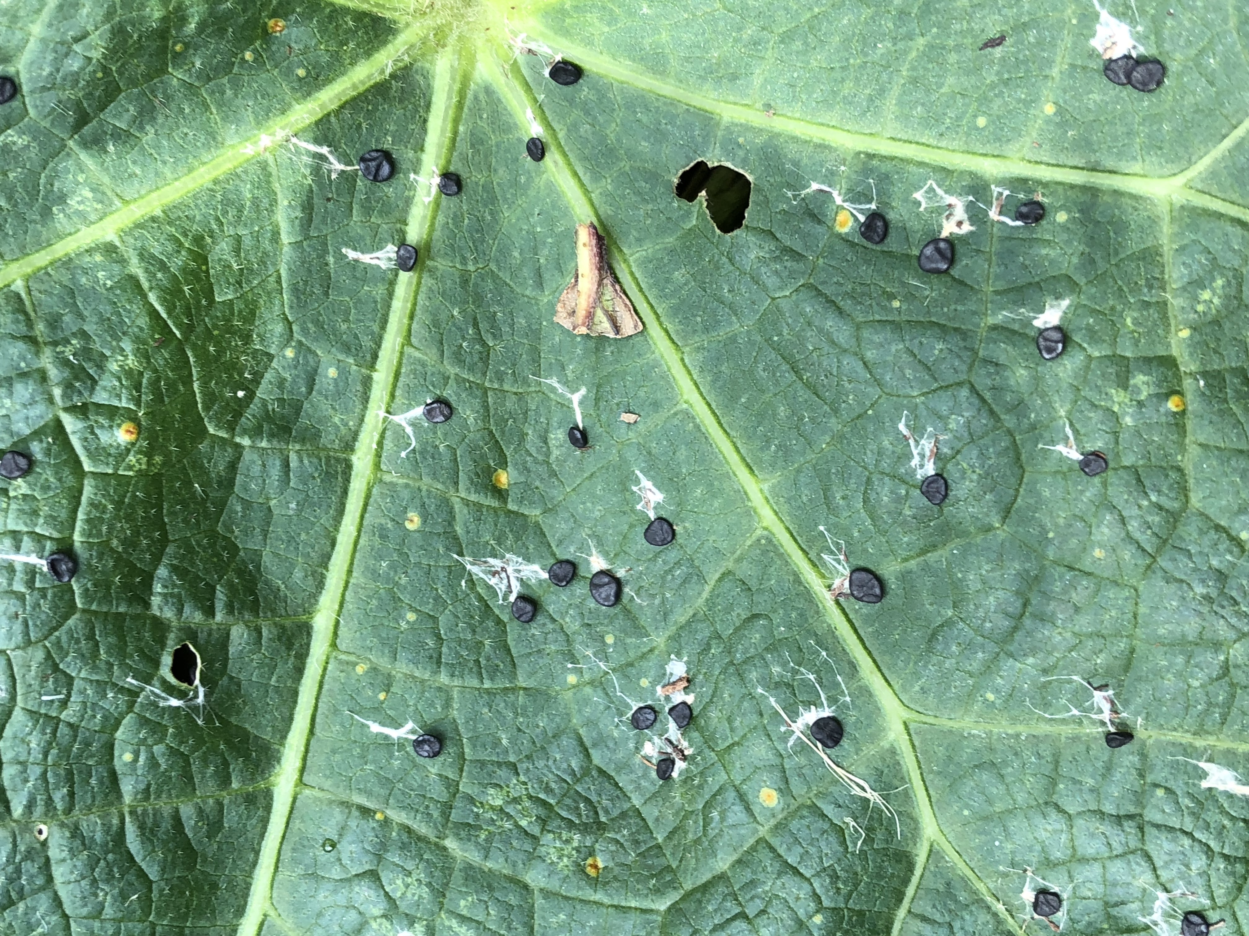 Black spots, like flattened poppy seeds, stick to leaves, stems, and any other nearby material. There is often webbing associated with the spots. It may be mistaken for a disease or insect problem. In the case of birds nest fungi, the cup-like "nest" holds tiny "eggs" (called periodoles), which are little spore sacs. Periodoles are dispersed by raindrops. For artillery fungi, when it matures, the spore mass (called a gleba) reaches about 1mm in diameter suspended in liquid in the cup until it is catapulted into the air with enough force to project it up to 20 feet. Upon contact, the sticky coating adheres to whatever it hits. Its ability to adhere to surfaces is the stuff of legends.