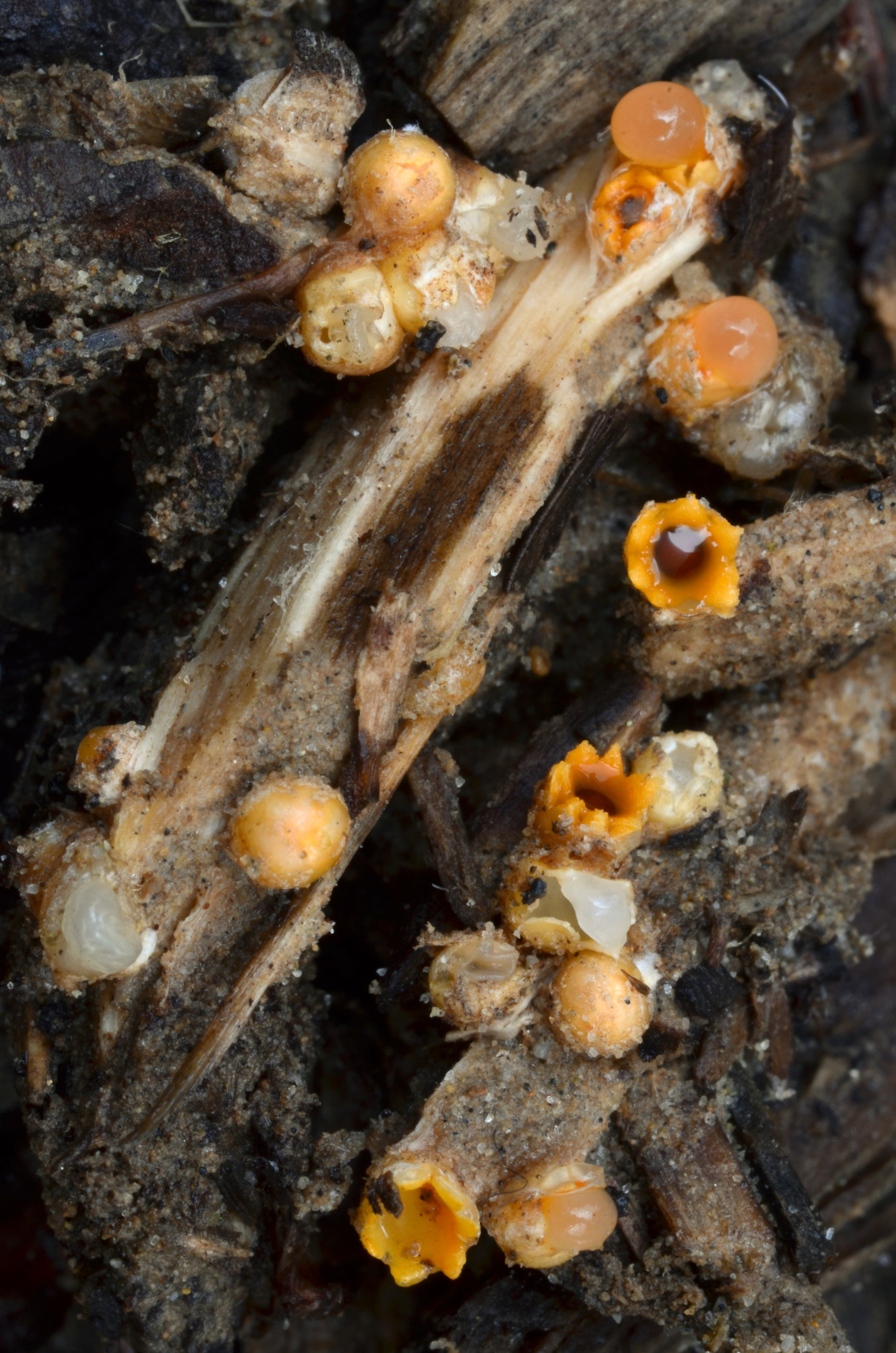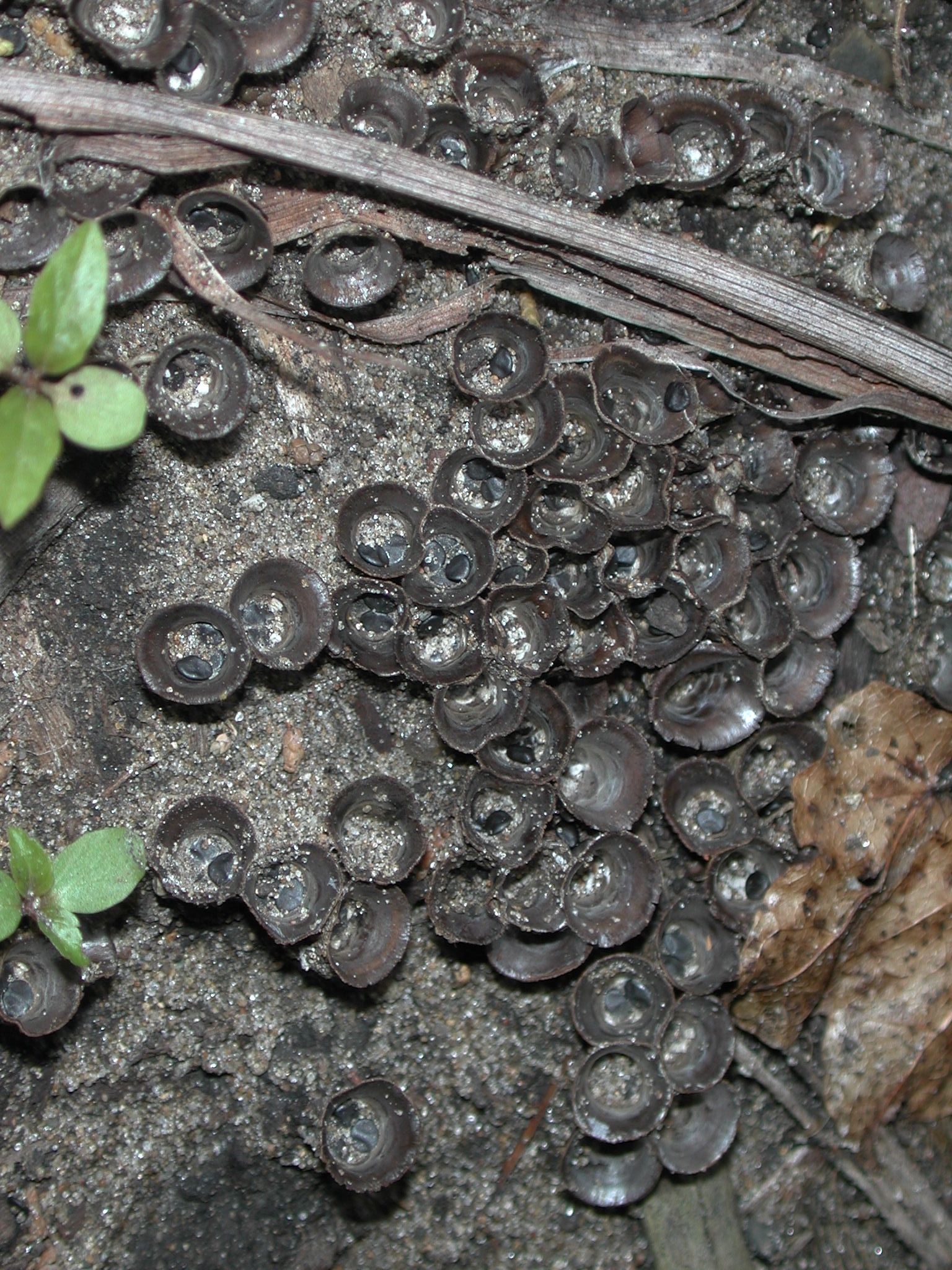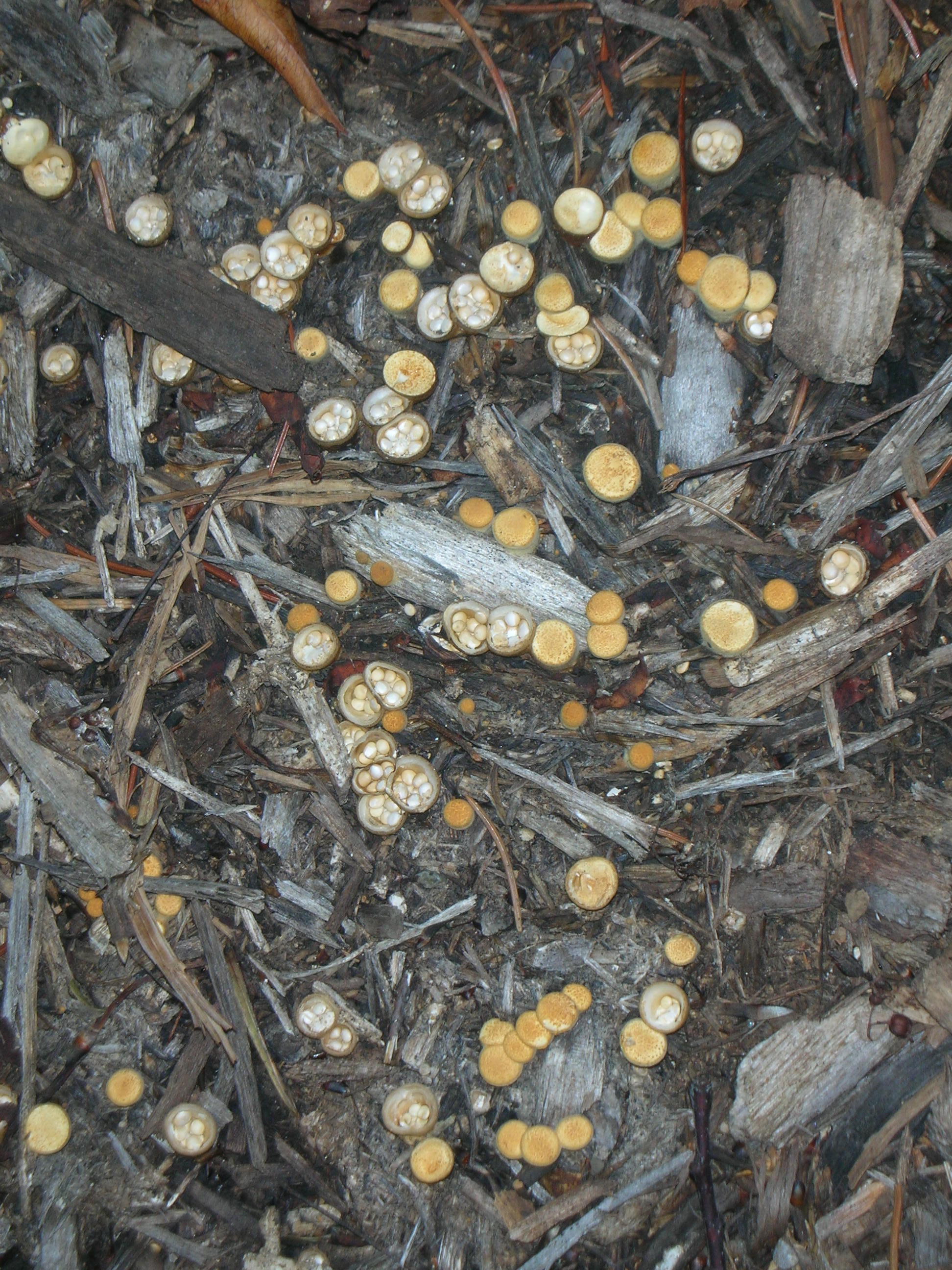 Fungi emerge as club-like structures in mulch. They are often numerous. As they develop, dry "eggs" peridioles are visible in the "nest". This is different than the gelatinous spore mass that forms in the cup of an artillery fungus. After discharge of spores, an empty cup often remains in the mulch.