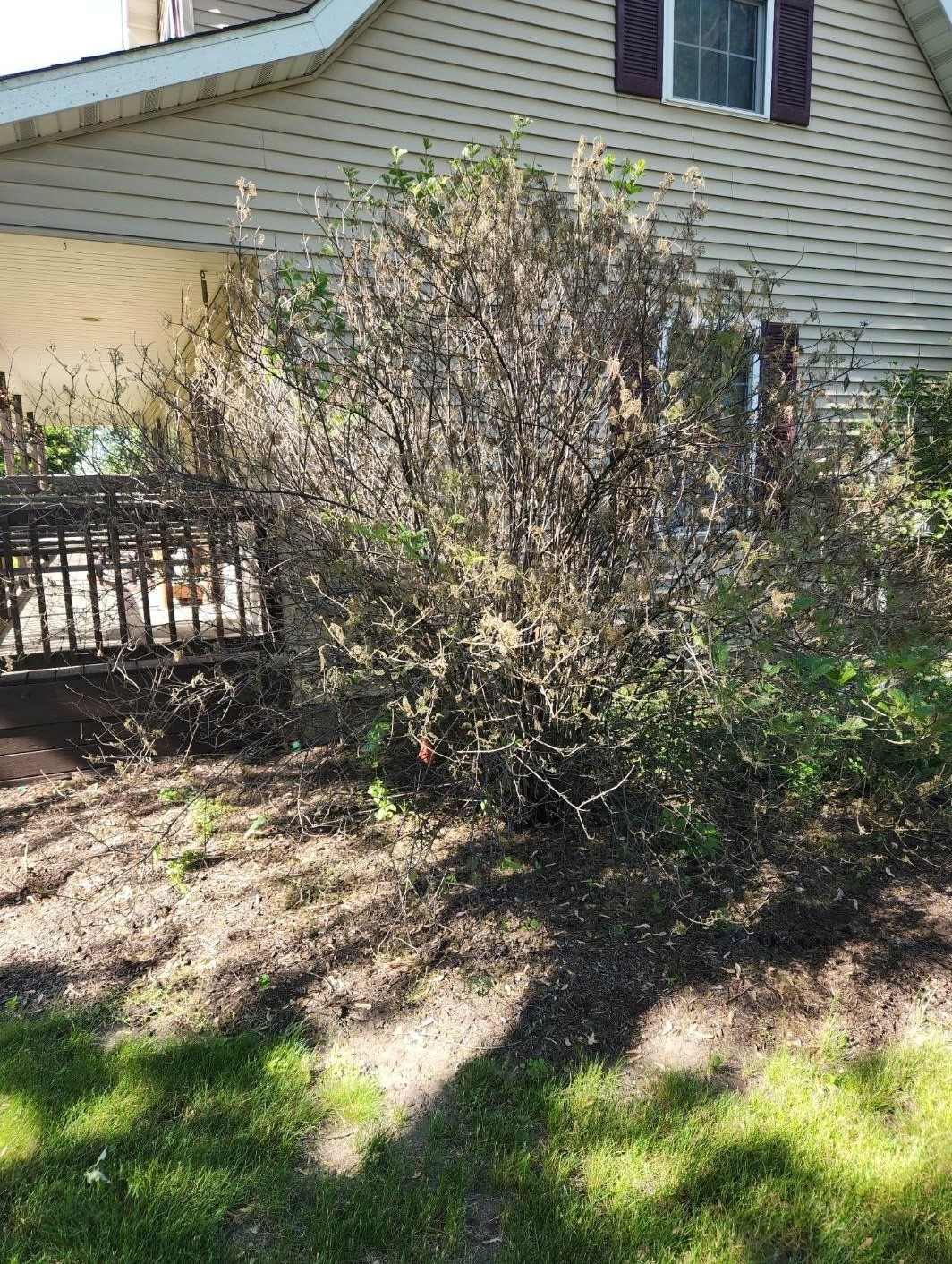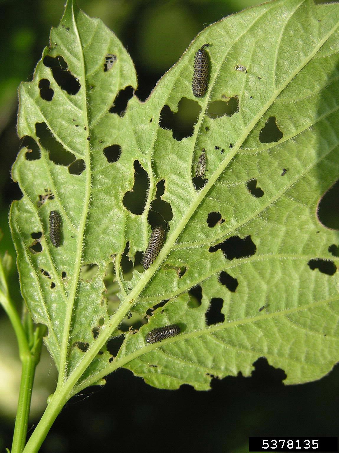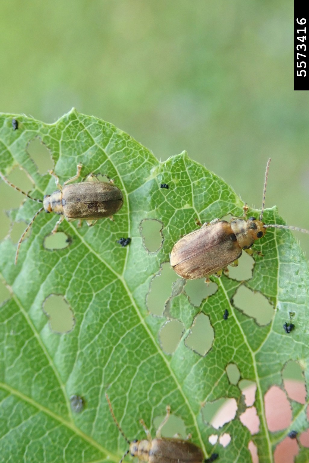 Beetles defoliate certain species of viburnum. Wintering as eggs on stems, larvae hatch in May to feed on leaves. Young larvae chew small holes and skeletonize leaves. Golden brown brown beetles appear in mid July and will feed on leaves until frost.
